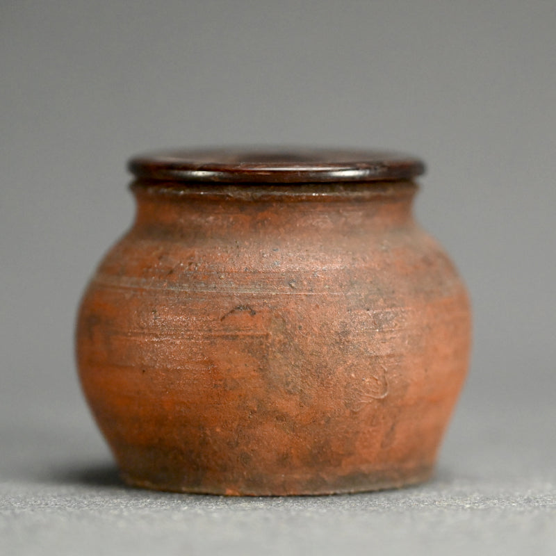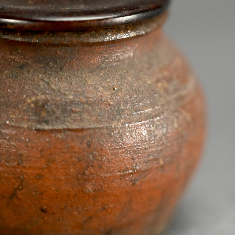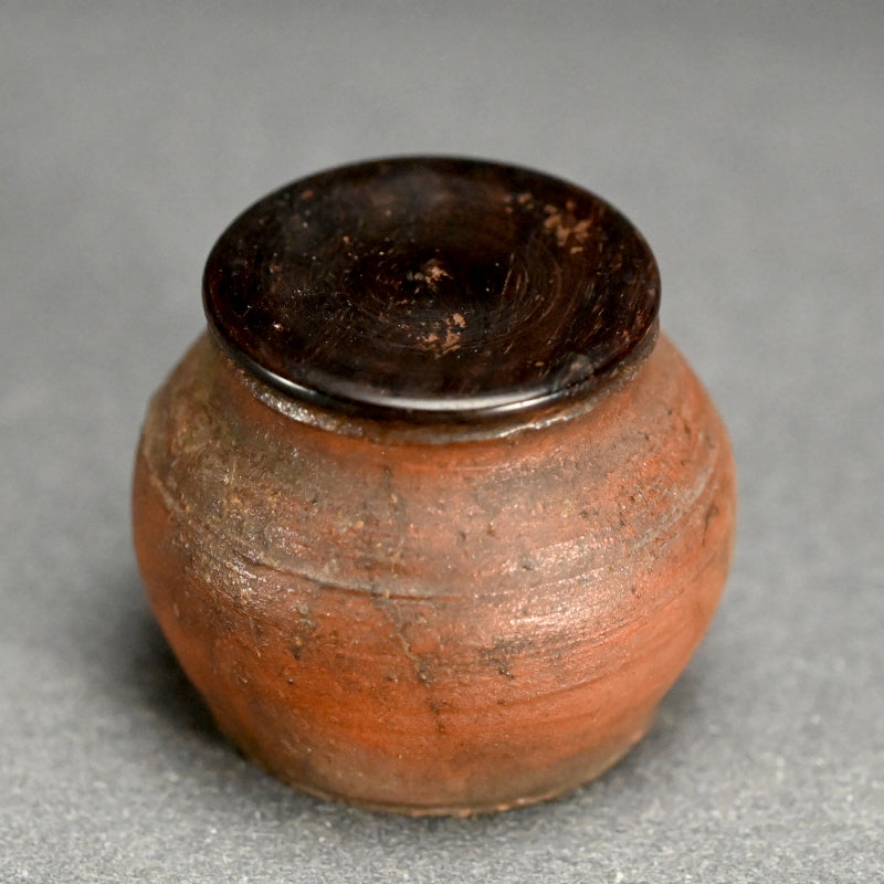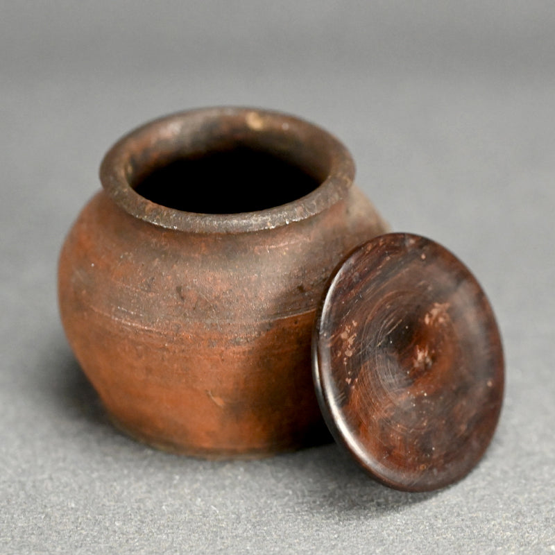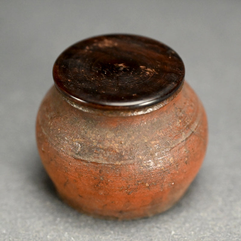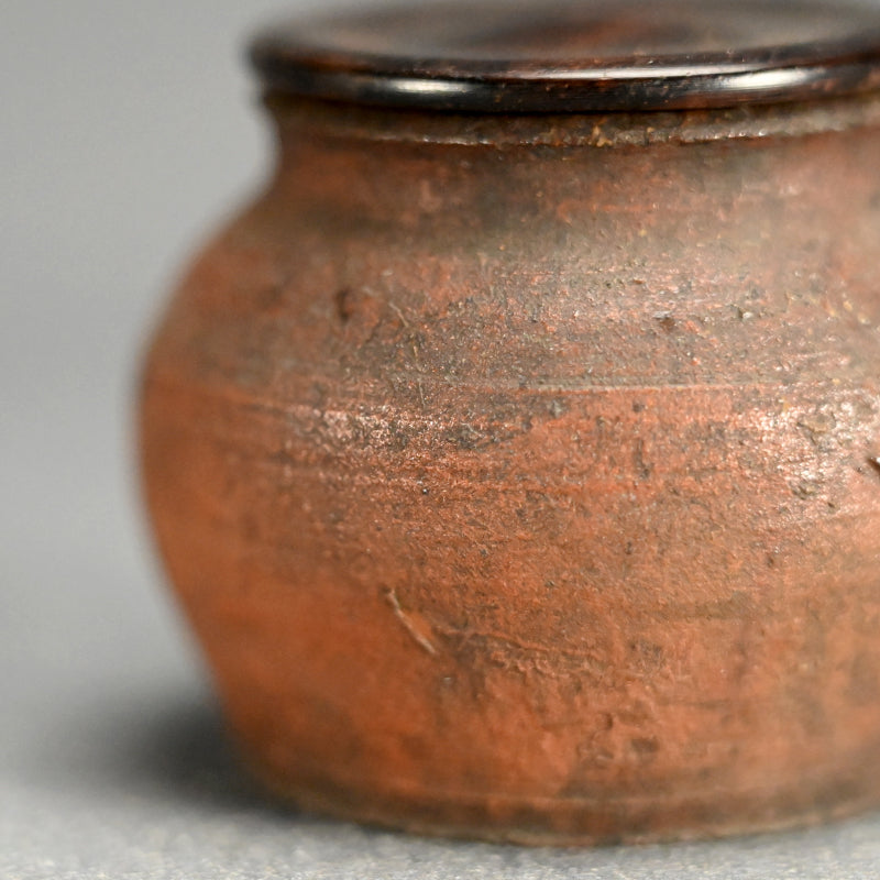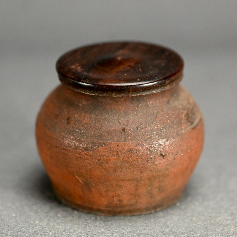丹波の精製された土で作られたと思われる、小さくて可愛らしいアンティークの茶入れです。黒檀の蓋が付いており、古い桐箱に収められ 鹿皮の紐で括られています。直径5.5cm、高さ5cmで 状態は良好です。