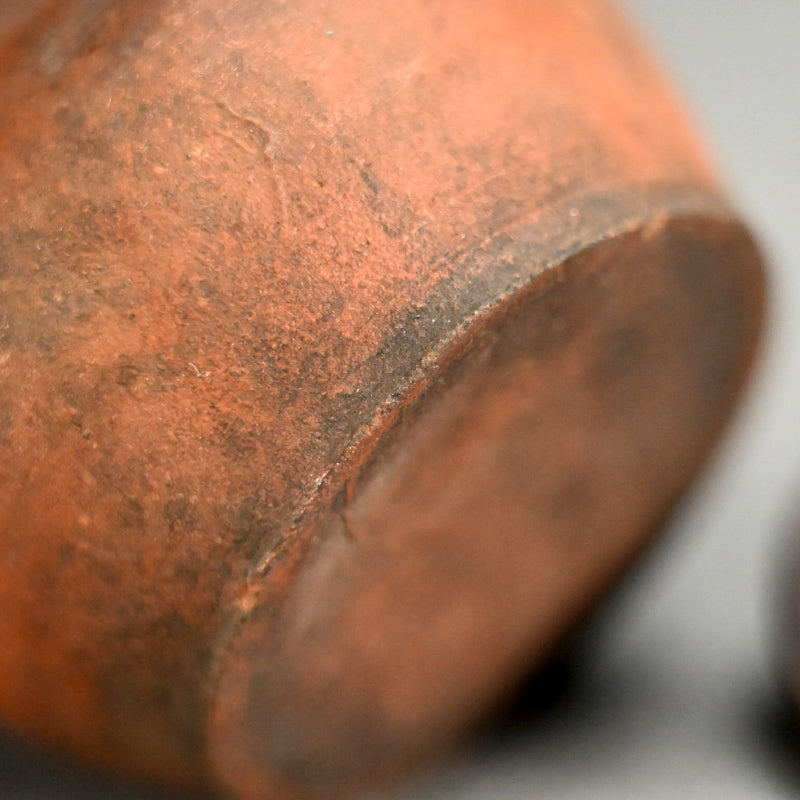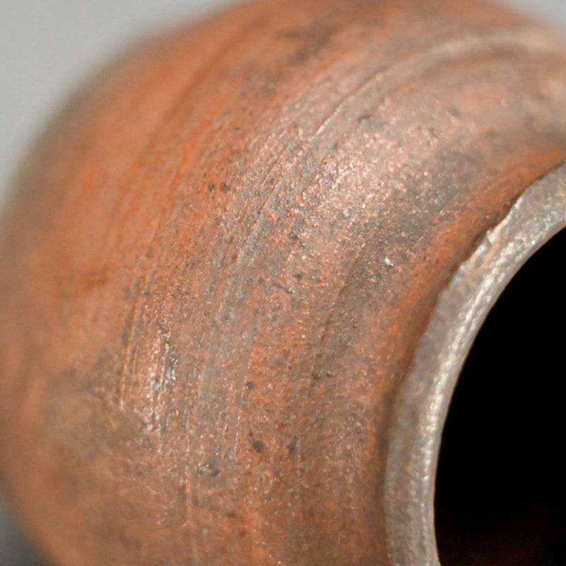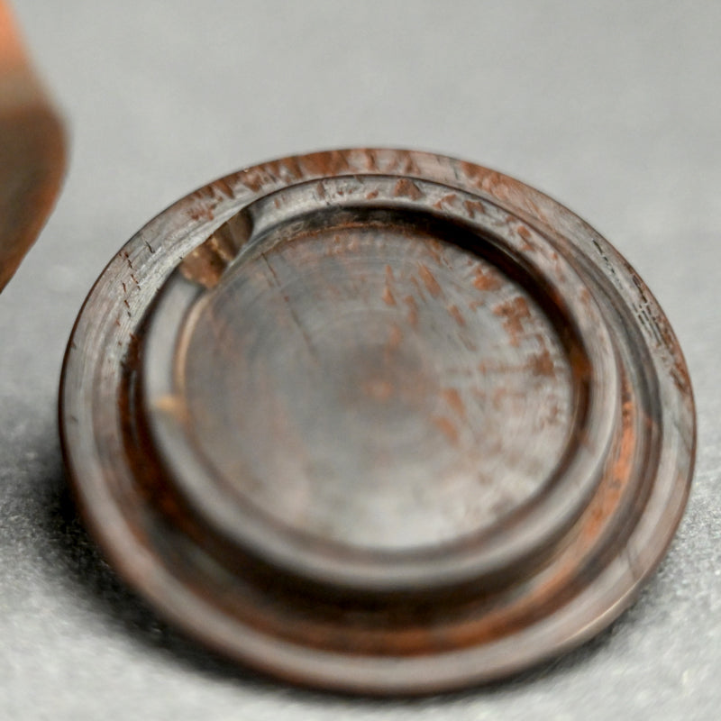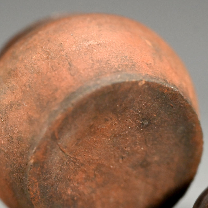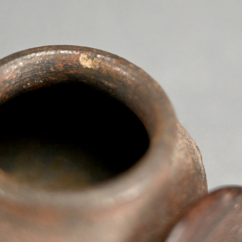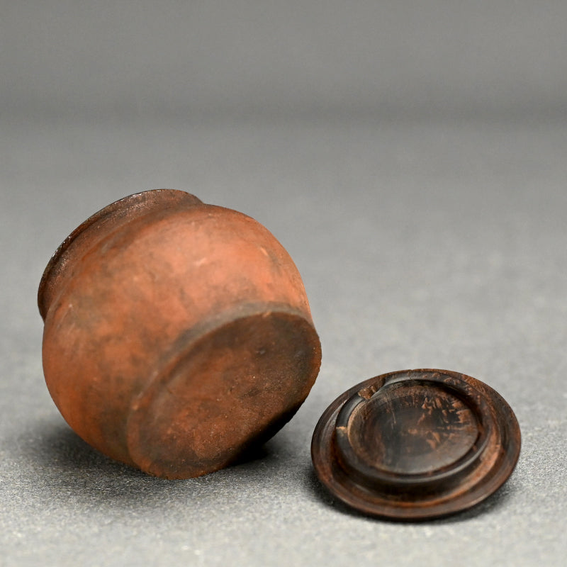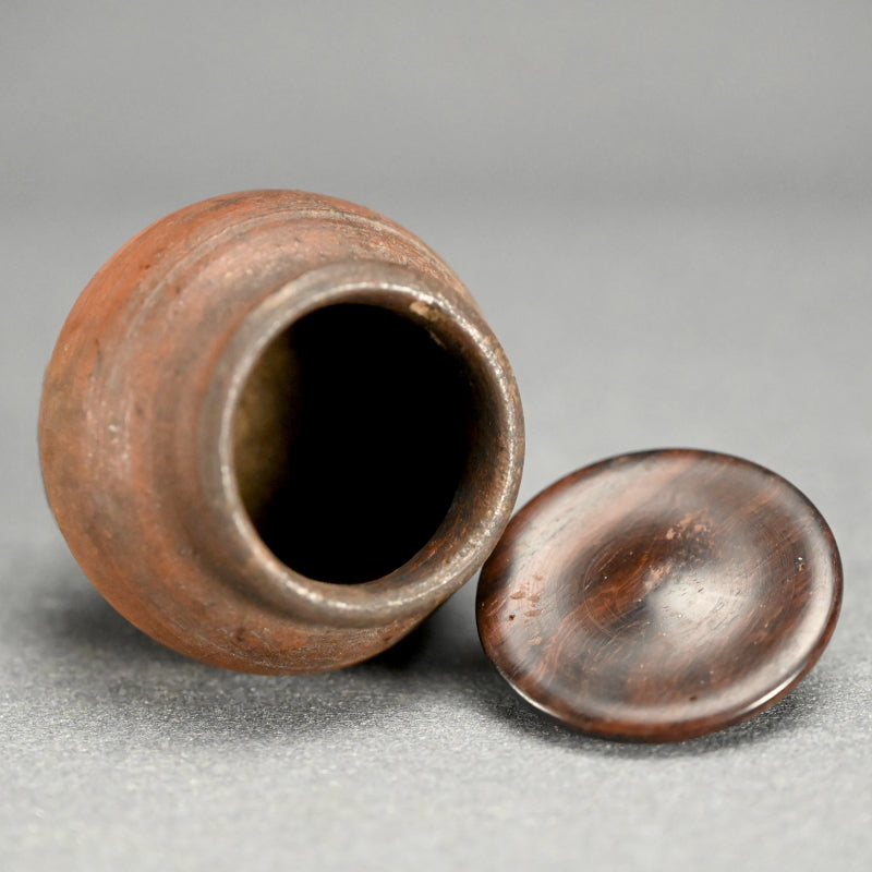 丹波の精製された土で作られたと思われる、小さくて可愛らしいアンティークの茶入れです。黒檀の蓋が付いており、古い桐箱に収められ 鹿皮の紐で括られています。直径5.5cm、高さ5cmで 状態は良好です。
