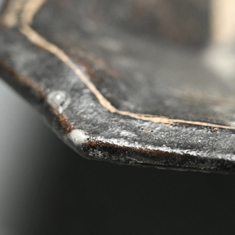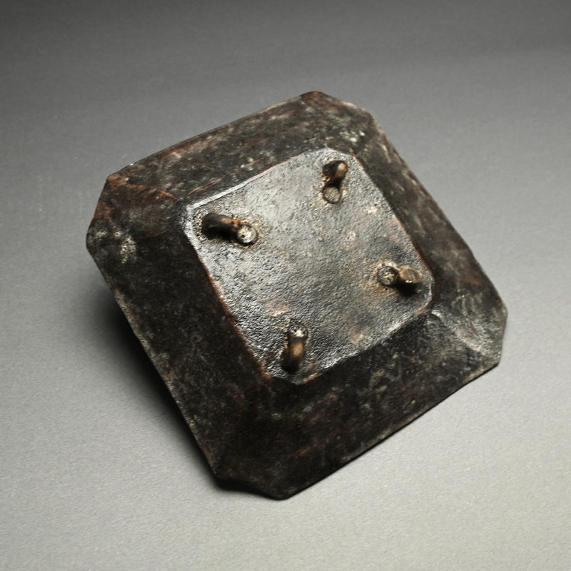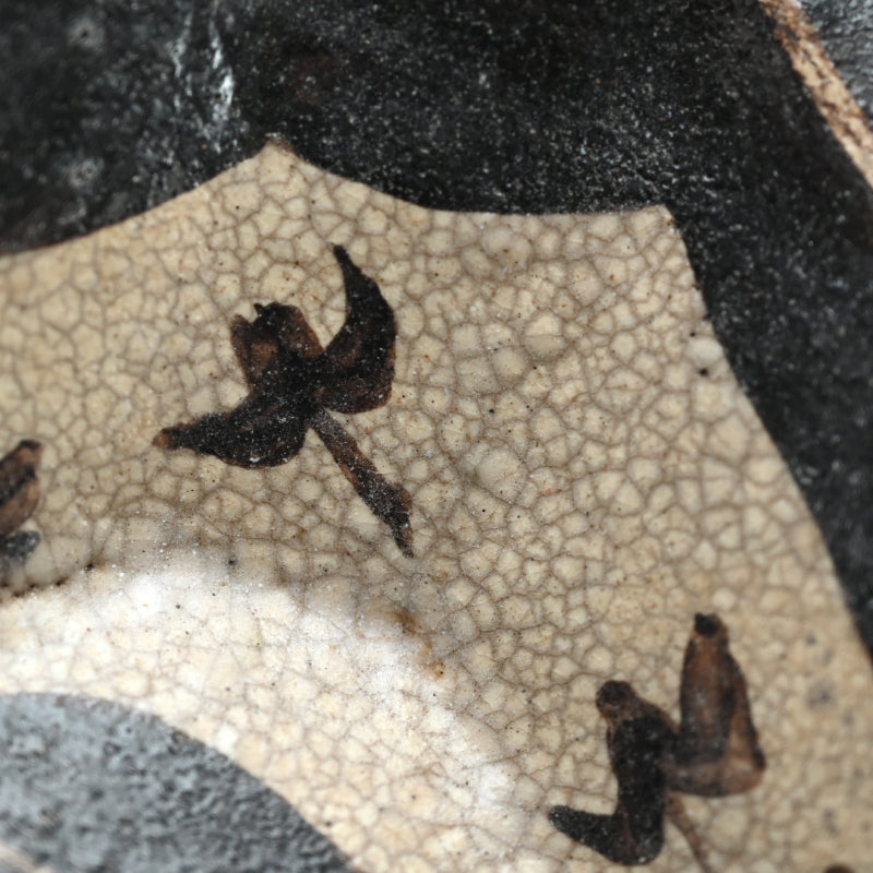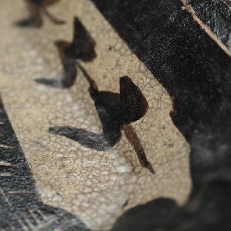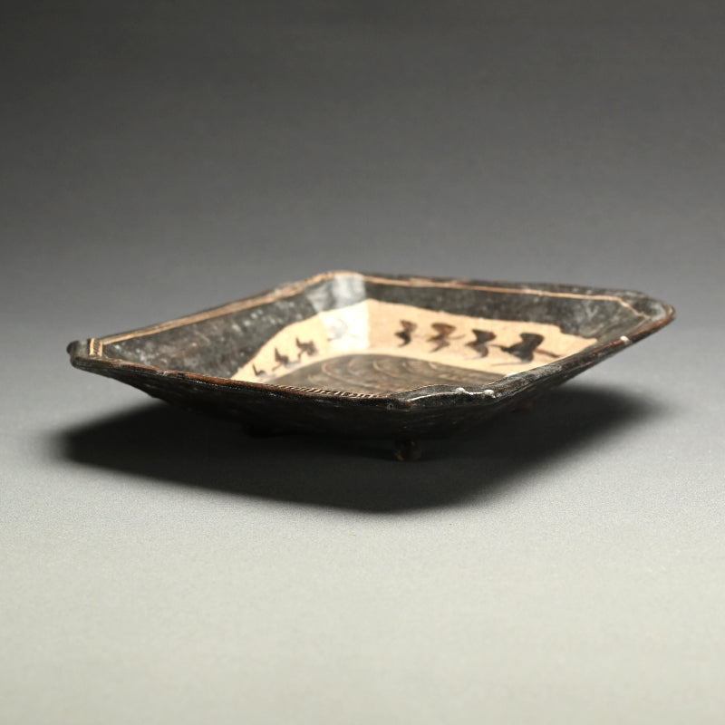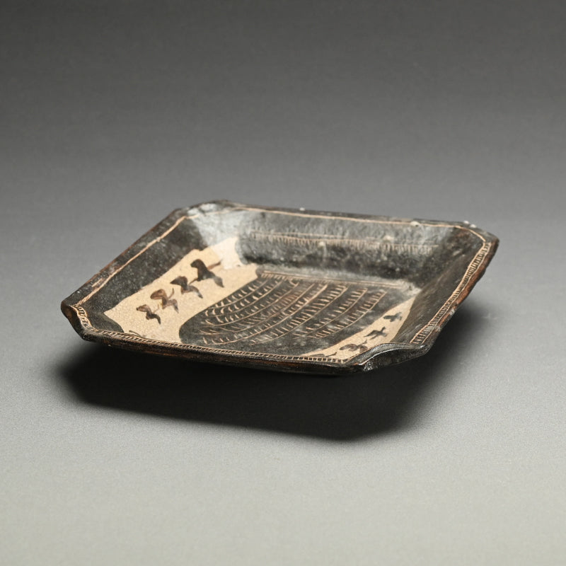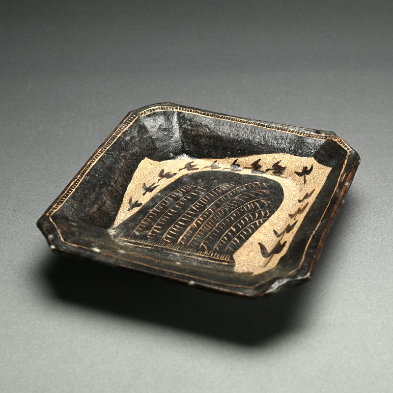 A beautiful antique Shino plate in gray and white with designs of soaring birds dating from the first half of the 20th century. It is 27 cm (11 inches) square, 6 cm (2 inches) tall and in excellent condition, supported on 4 small scrolling feet.