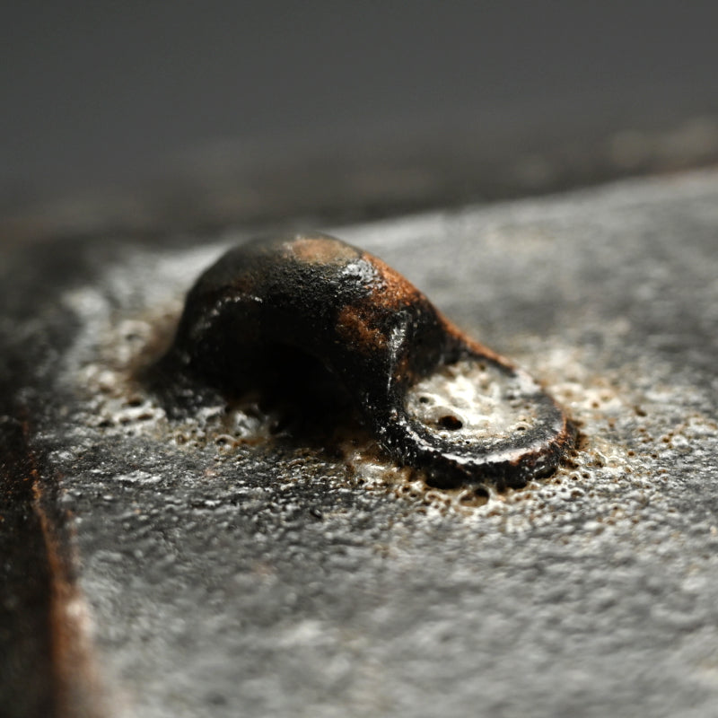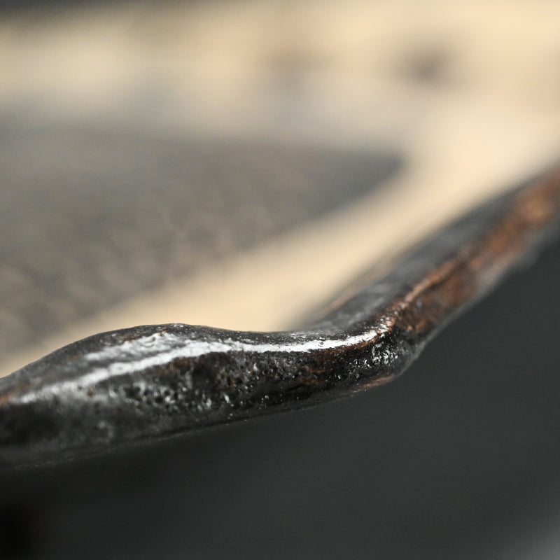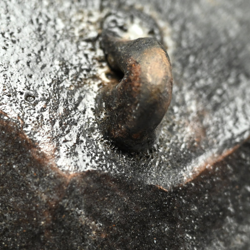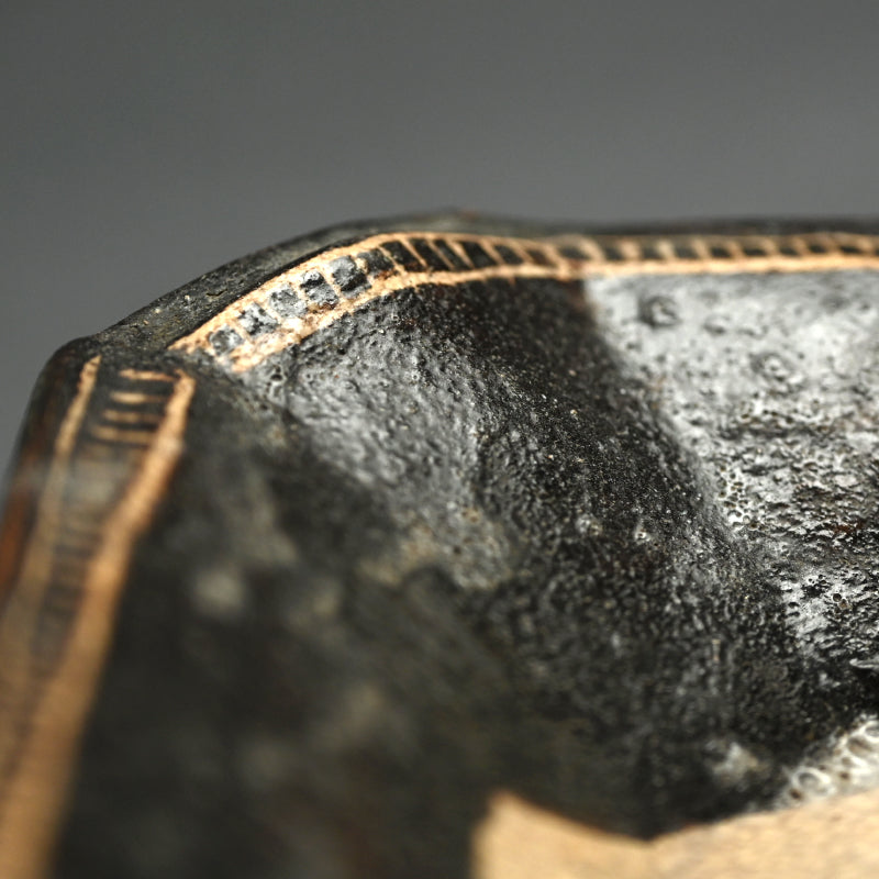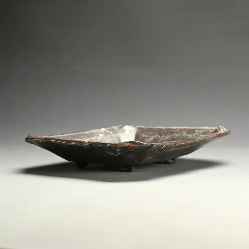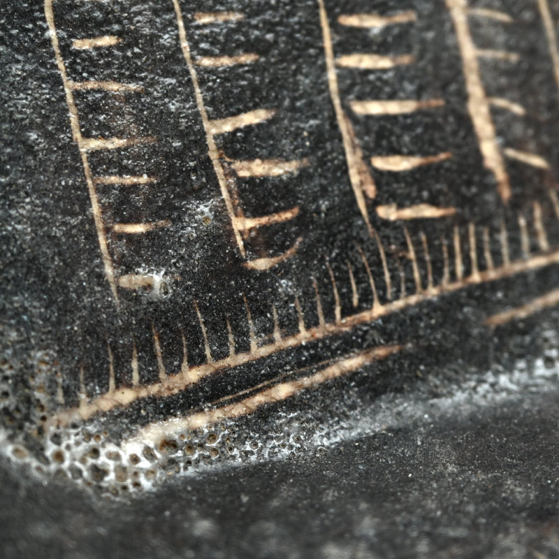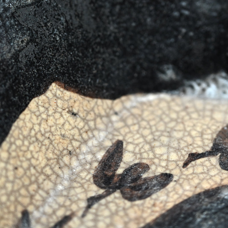 A beautiful antique Shino plate in gray and white with designs of soaring birds dating from the first half of the 20th century. It is 27 cm (11 inches) square, 6 cm (2 inches) tall and in excellent condition, supported on 4 small scrolling feet.