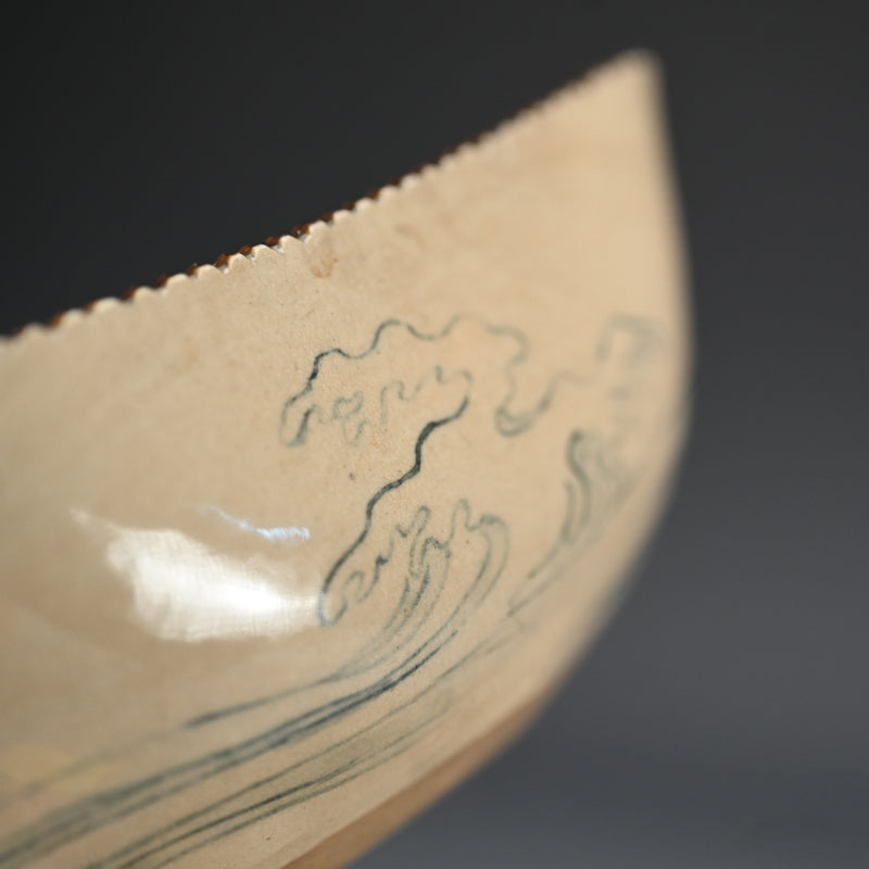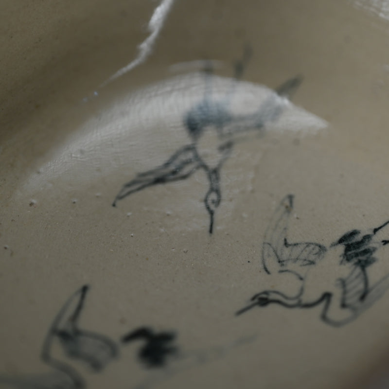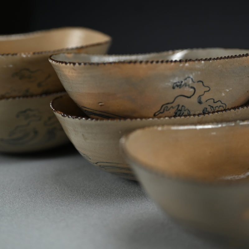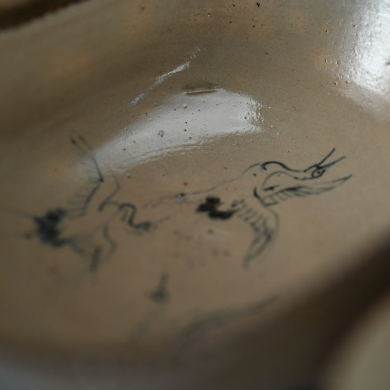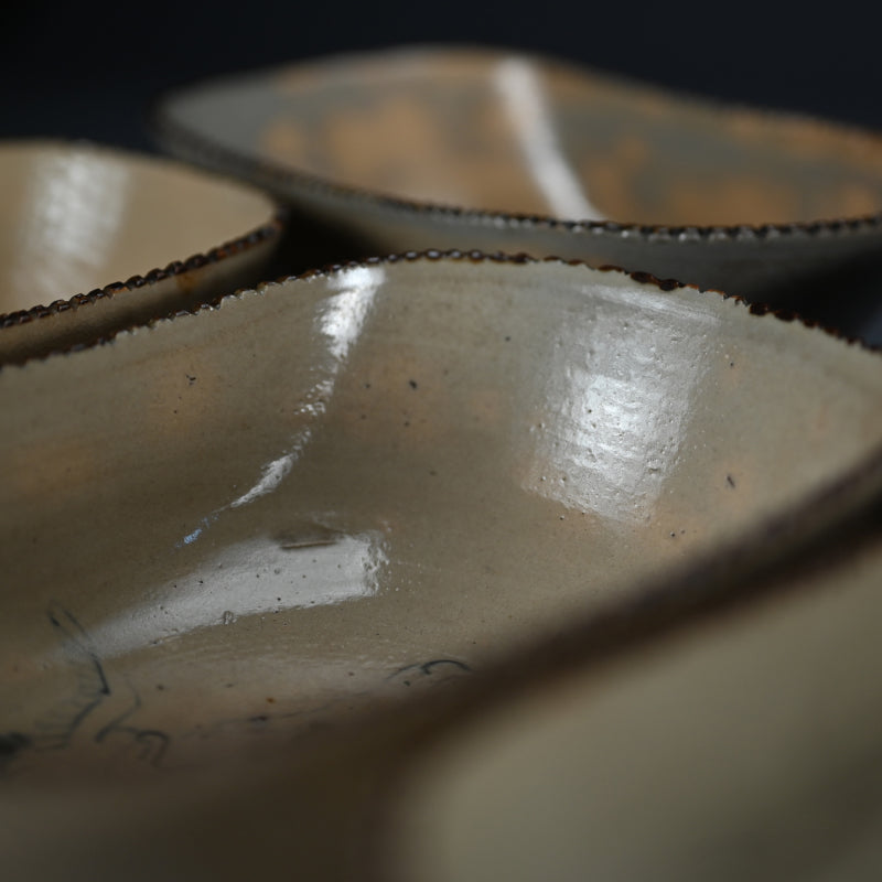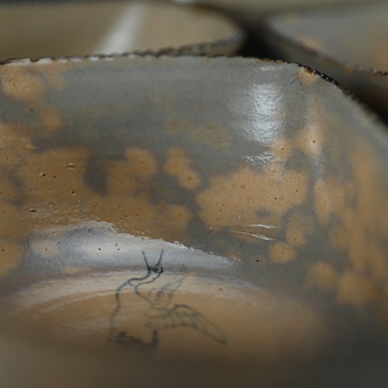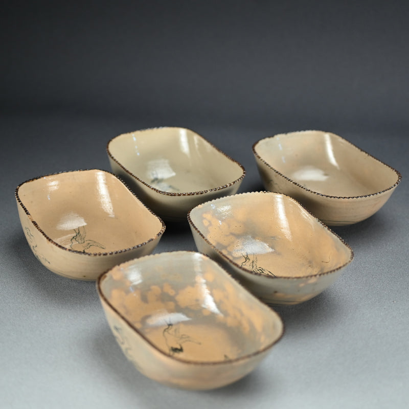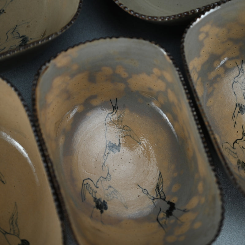 Cranes soar inside this set of five dishes from the Tosa domain on Shikoku. Outside waves crash about over the fawn spotted Gohon glaze. Each is clearly stamped on the base Odo. They are roughly 15 x 10 x 5 cm (6 x 4 x 2 inches) and all are in fine condition, but for one hairline crack.