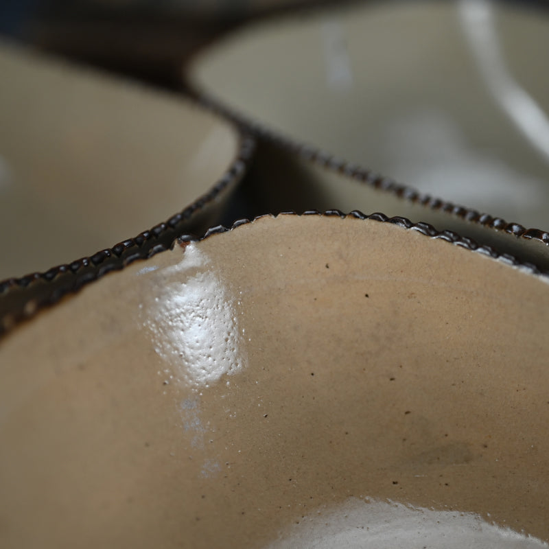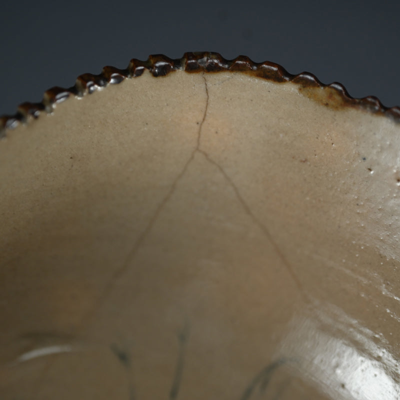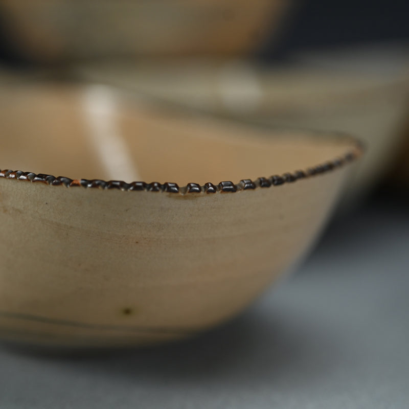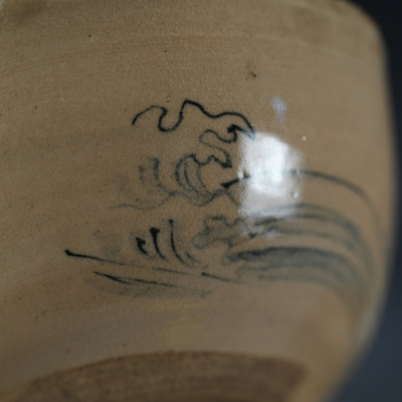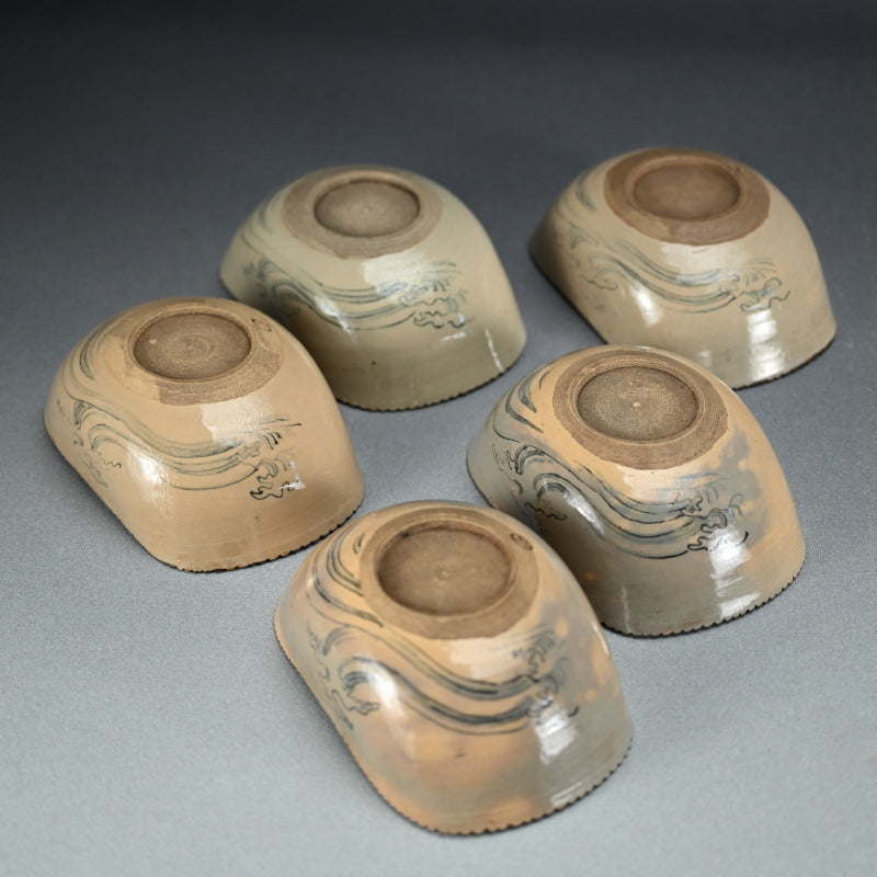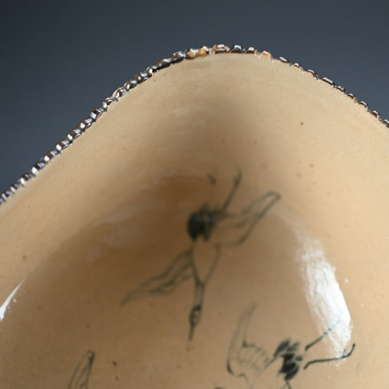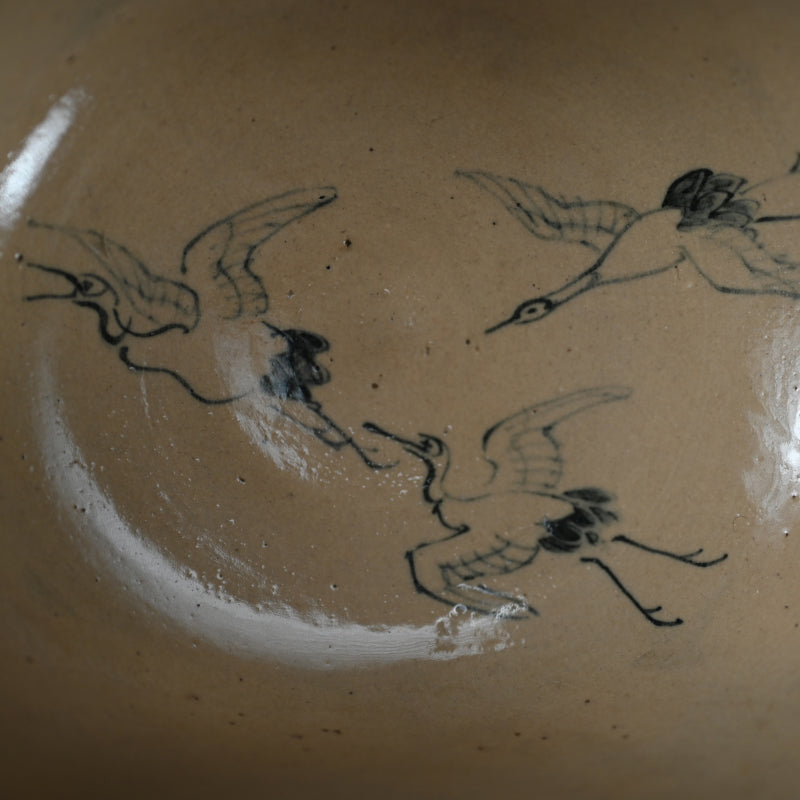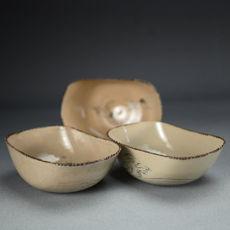 Cranes soar inside this set of five dishes from the Tosa domain on Shikoku. Outside waves crash about over the fawn spotted Gohon glaze. Each is clearly stamped on the base Odo. They are roughly 15 x 10 x 5 cm (6 x 4 x 2 inches) and all are in fine condition, but for one hairline crack.