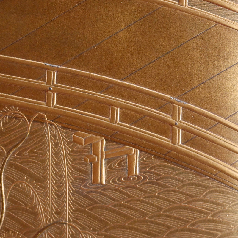 19世紀の精巧な金漆塗りの箱で銀の水差しと金粉をまぶした硯が入っており、赤い漆塗りの木箱に「柳橋蒔絵御小硯」と題されています。蓋には繊細な波の上に弧を描く橋と、手前の柳にみずみずしい葉が咲き誇る様子が描かれています。切金で仕上げた桜の花は、まだ葉のない桜の枝に震えながらまとわりつき 頭上の金象嵌の雲の下を鳥が舞い上がっています。箱の内側はすべて梨地金で覆われています。蓋の内側には 竹と野菊と思われる花が描かれています。箱の寸法は14 x 15.3 x 3.2 cmで 完璧な状態です。金字が絹の枕で保護された美しい木箱に収められています。