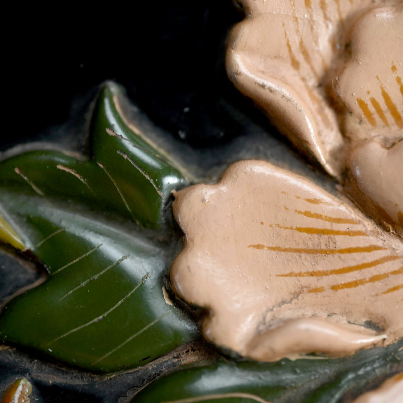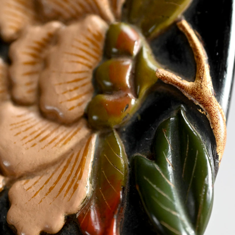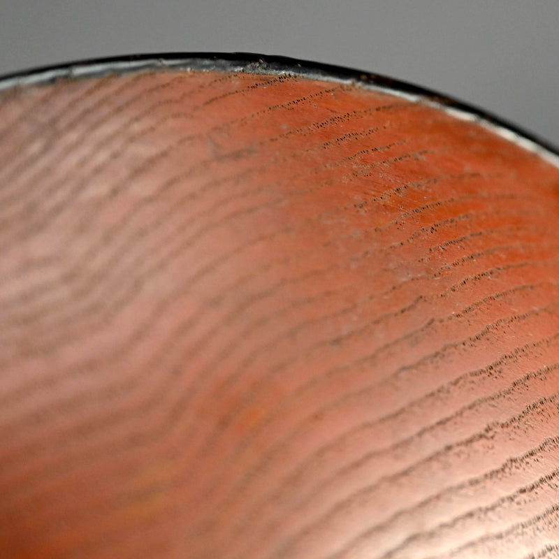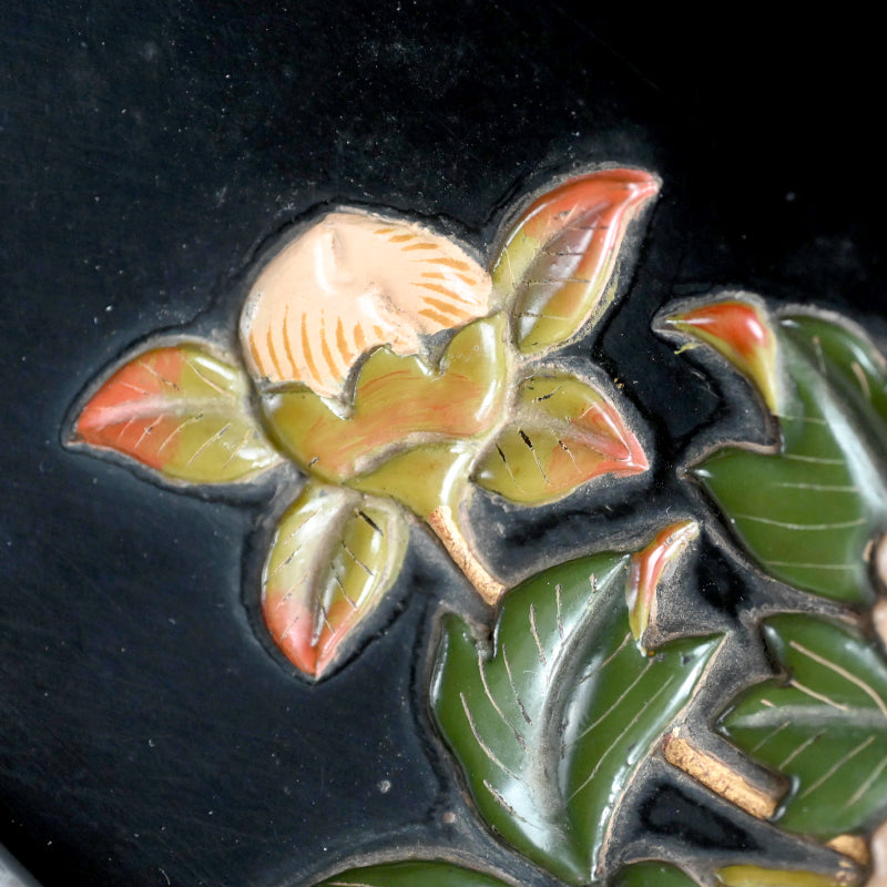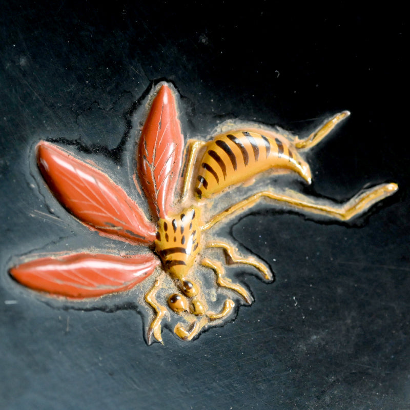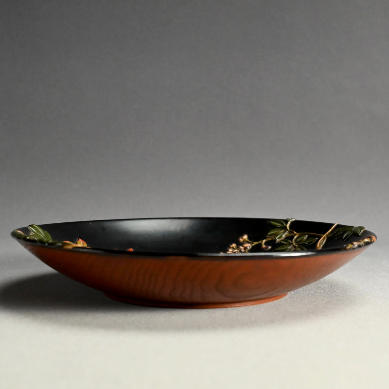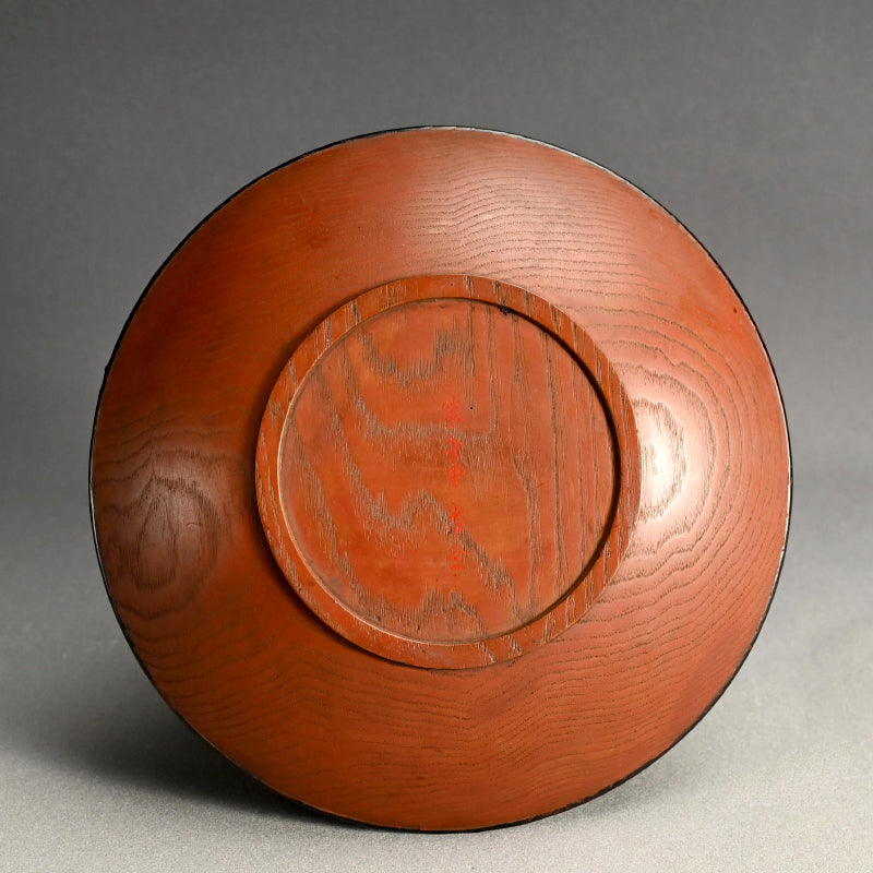 内側が黒漆で覆われた木製の椀で、艶やかな牡丹の花に絡みつく藤の花から飛び立つスズメバチが描かれています。その下には作者である廣斎の署名が赤漆で記されています。椀の直径は25.5cm、高さは4.5cmで 状態は良好です。現代的な木製のコレクターズボックスに収められています。