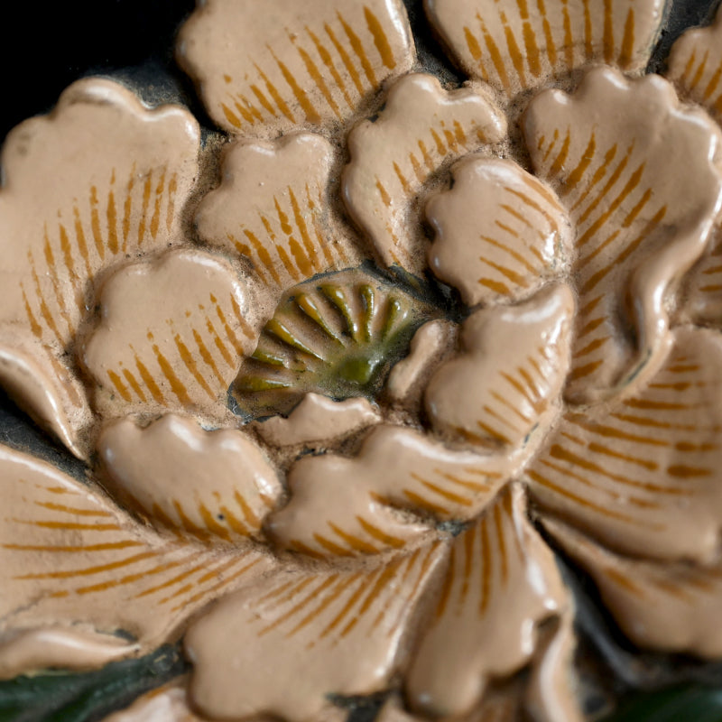 廣斎は広島の異国斎流にゆかりのある蒔絵や堆漆などの技法を巧みに用いた作家で、盆、茶器(茶籠、椀など)や 菓子器などにその名を冠した作品が多く見られます。異国斎流派に属し、紫金堂をはじめとする広島漆芸の伝統と深い関わりがあります。「廣斎」銘の作品の特徴として、堆漆(複数の色を塗り重ねて彫り上げた漆)や蒔絵(漆で模様を描き、金粉や銀粉を蒔いたもの)、盛漆(漆を浮き彫りにして浮き彫りにする)、色漆など多様な漆技法を用いることで知られています。代表的な題材は牡丹、蝶、葡萄、鳳凰、鶴など、吉祥文様や自然を題材とした作品が多く見られます。