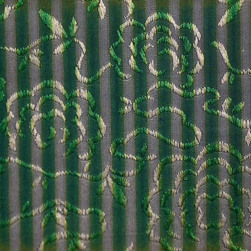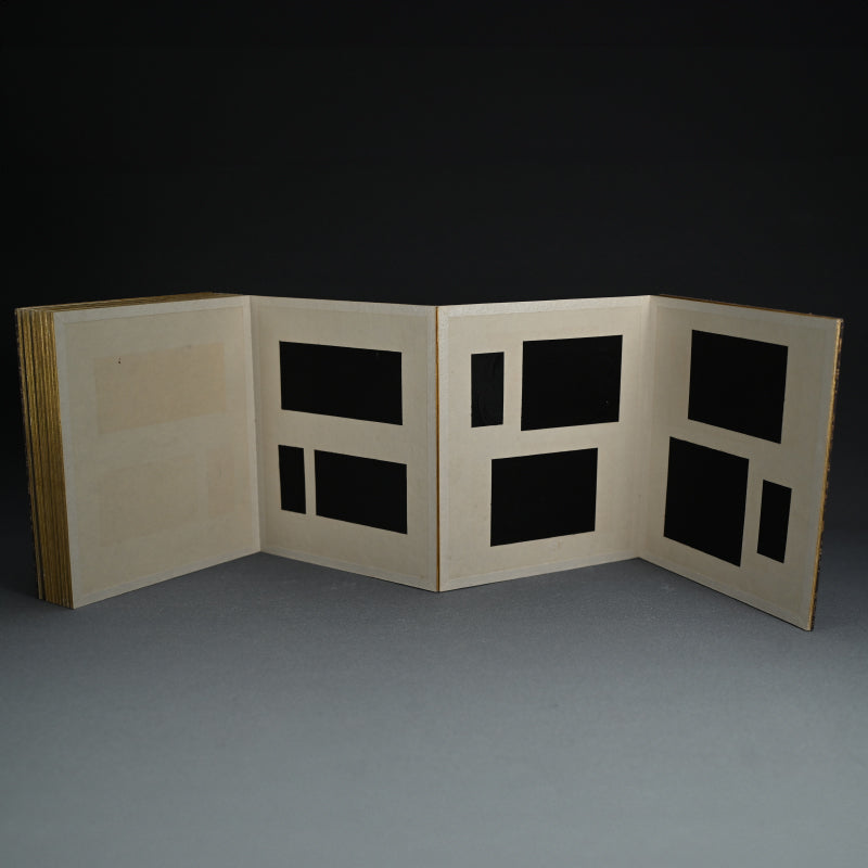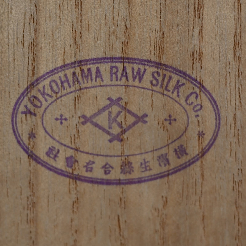 横浜生糸会社の布の型紙サンプルを両面アコーディオンで収録した冊子です。オリジナルの木製収納箱に収められており、蓋の内側と箱の底、そしてサンプル帳の最後の金箔押しページにも会社の印が押されています。39ページのサンプルで構成され、各ページに複数のサンプルが含まれています。この本は20世紀初頭に出版されたもので、状態は良好です。