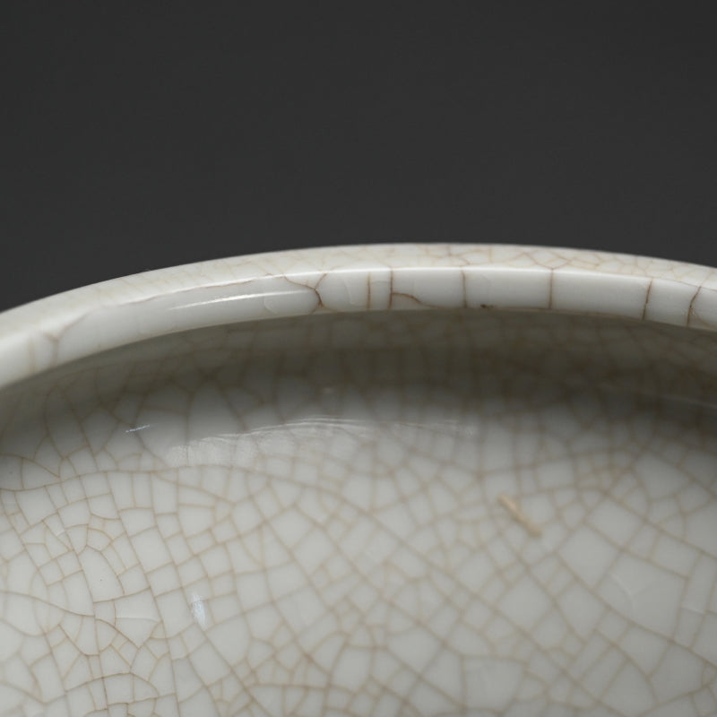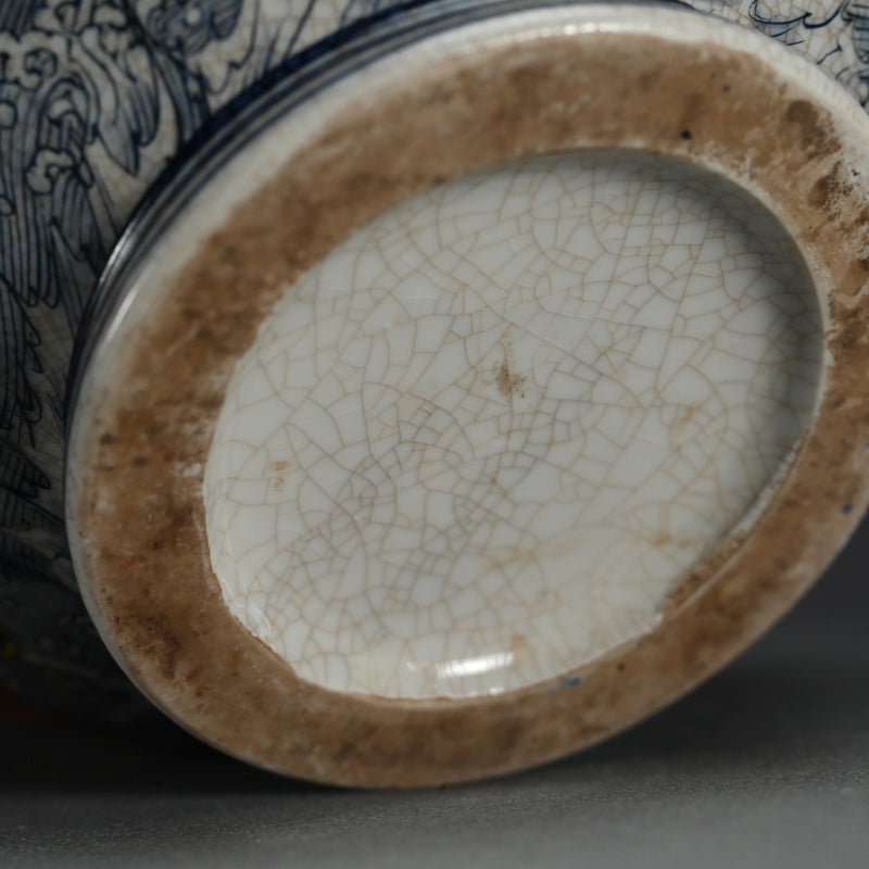 ひび割れ模様が入った白い釉薬の上に、波と鮮やかな色の海の生物が描かれた大きな陶器の花瓶です。直径29cm、高さ31cmで 20世紀前半のものです。状態は良好です。