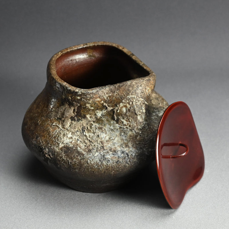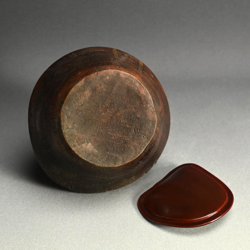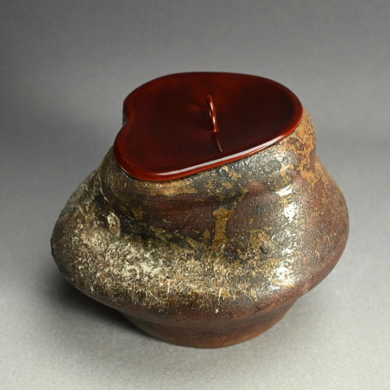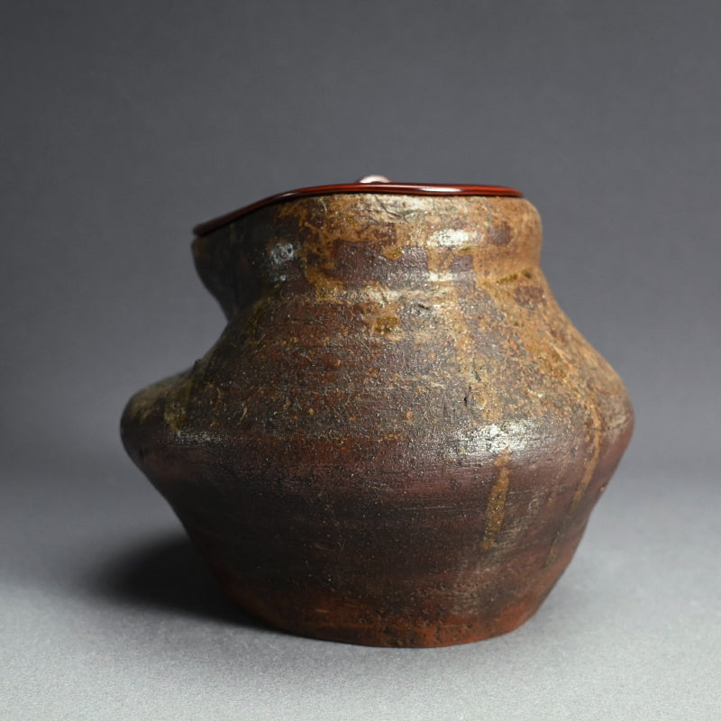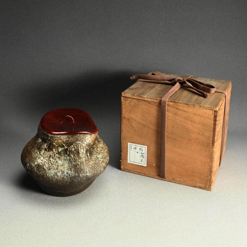 窯の中で部分的に崩れ落ちた美しい小瓶です。陥没した側面に大量の堆積物があることから、炎の直撃を受けたことが伺えます。特注の突起のある赤褐色の漆塗りの蓋が付いており、日本の茶道用の水差しとして再利用されています。当時の桐箱に入っています。