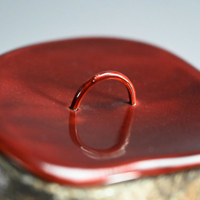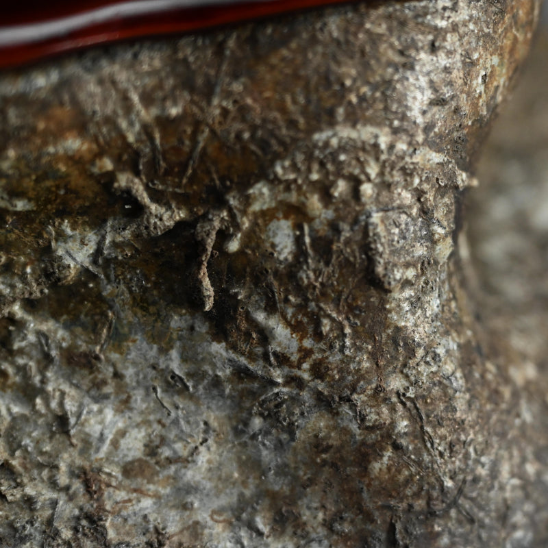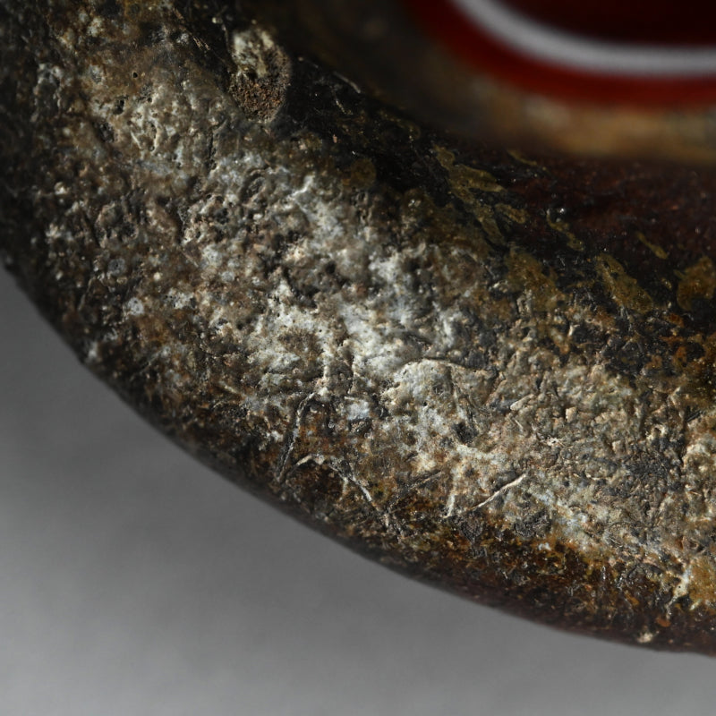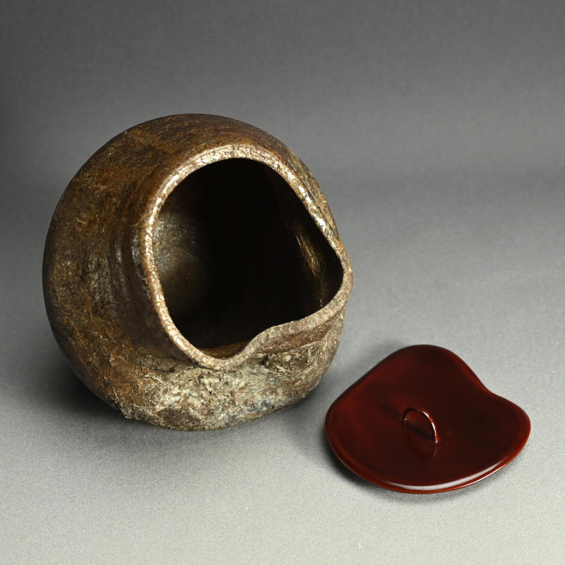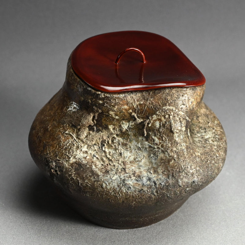 窯の中で部分的に崩れ落ちた美しい小瓶です。陥没した側面に大量の堆積物があることから、炎の直撃を受けたことが伺えます。特注の突起のある赤褐色の漆塗りの蓋が付いており、日本の茶道用の水差しとして再利用されています。当時の桐箱に入っています。