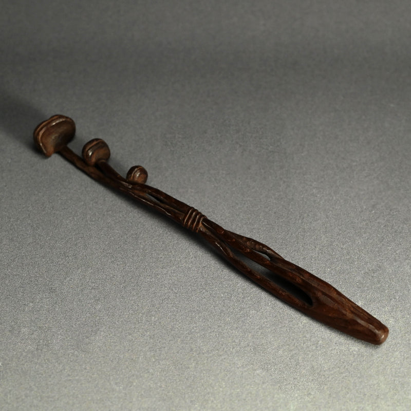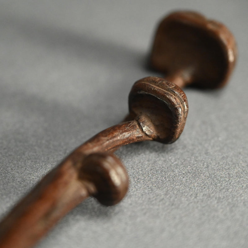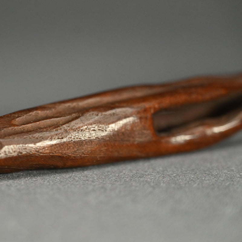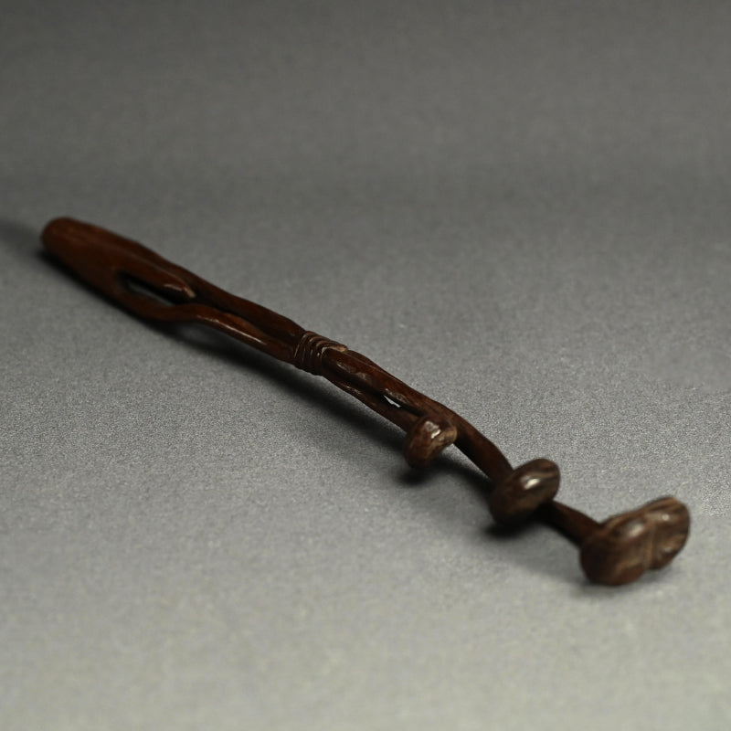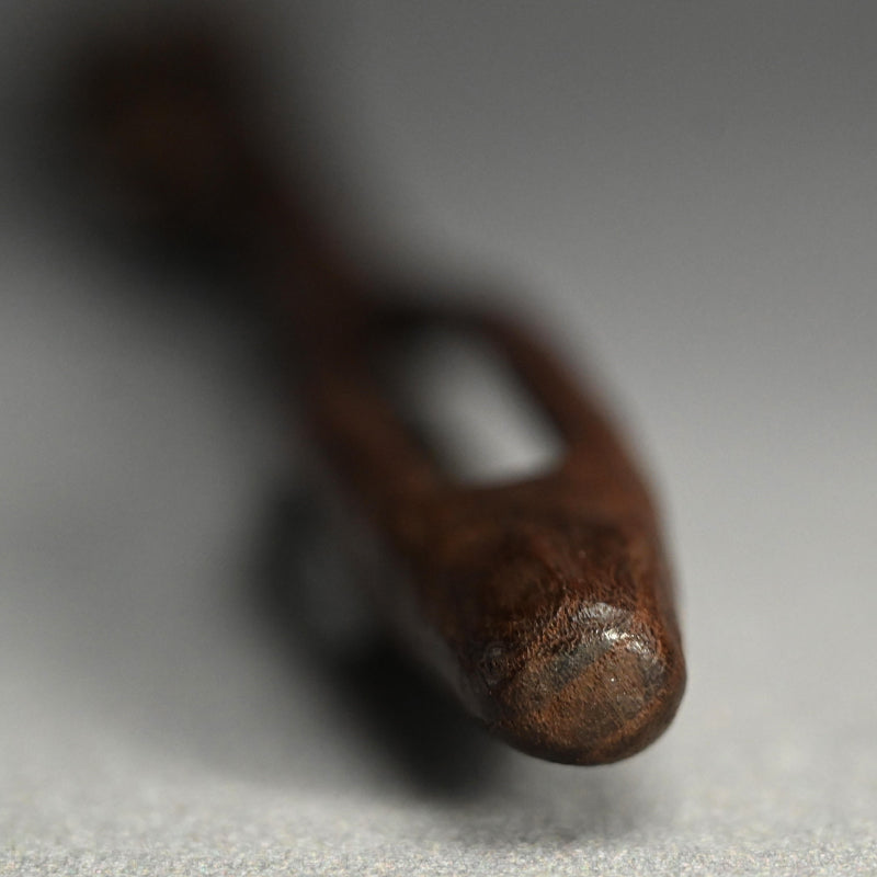 中央に長い霊芝の束を束ねた木彫りです。19世紀後半から20世紀初頭にかけて作られたものです。長さは28cmで、状態は良好です。これは如意でしょうか、指根付でしょうか、それともパイプ入れでしょうか...?キノコの根元の後ろのスロットはパイプケースを示しているようですが、反対側の端にはパイプの小さい方の端を保持するものは何もありません。通常の根付は長い紐を帯に通して付けるのに対し、指根付は紐が非常に短く、根付自体を帯と着物の間に差し込むため、形は長く平らです。