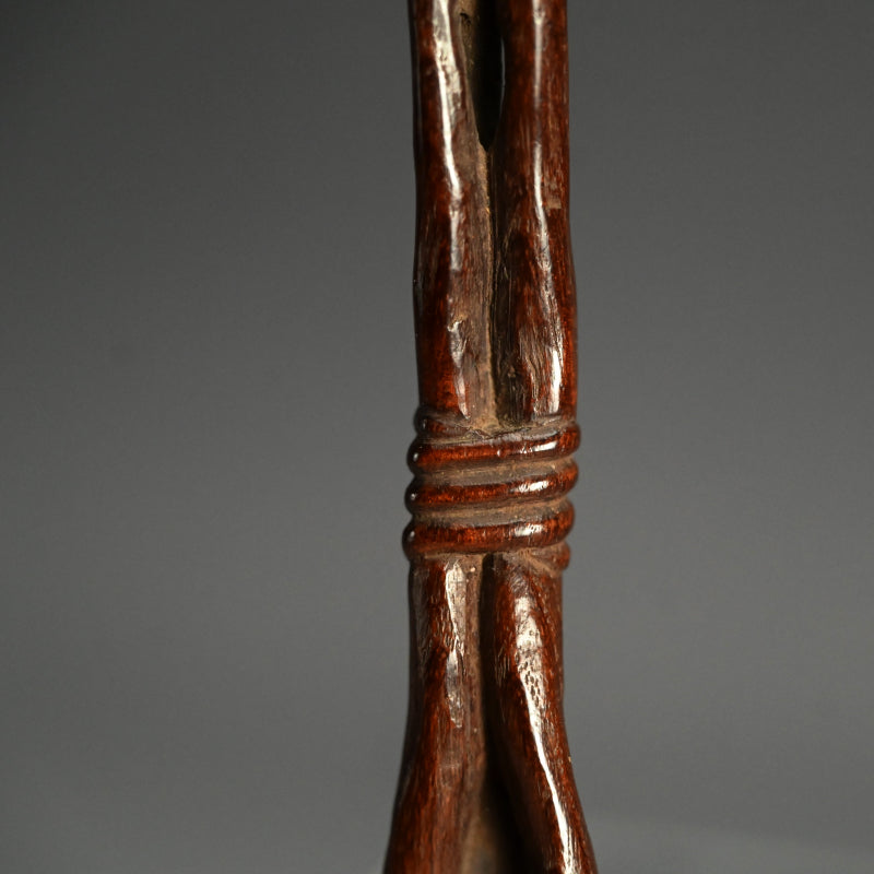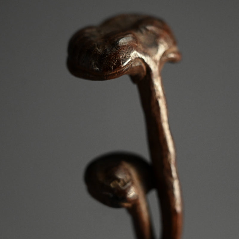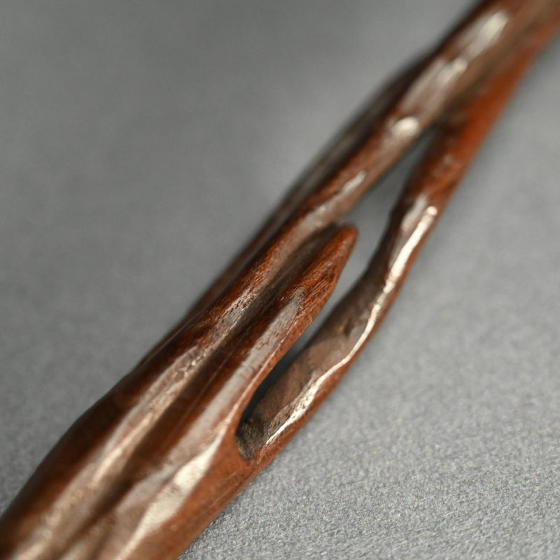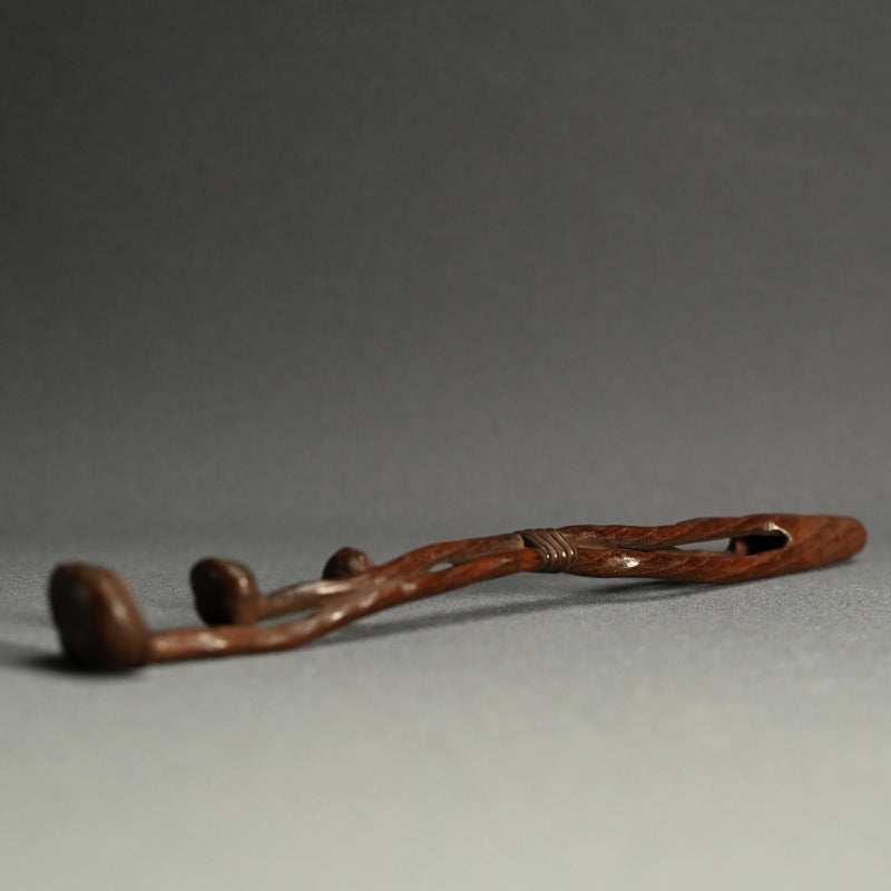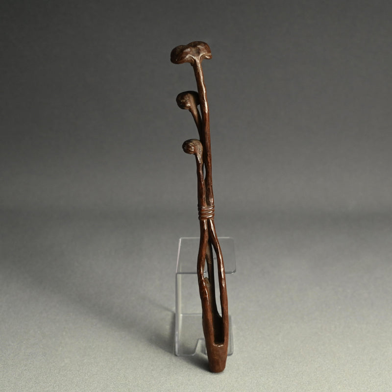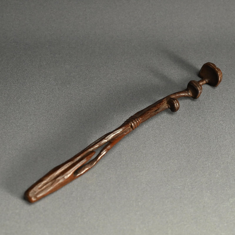 中央に長い霊芝の束を束ねた木彫りです。19世紀後半から20世紀初頭にかけて作られたものです。長さは28cmで、状態は良好です。これは如意でしょうか、指根付でしょうか、それともパイプ入れでしょうか...?キノコの根元の後ろのスロットはパイプケースを示しているようですが、反対側の端にはパイプの小さい方の端を保持するものは何もありません。通常の根付は長い紐を帯に通して付けるのに対し、指根付は紐が非常に短く、根付自体を帯と着物の間に差し込むため、形は長く平らです。