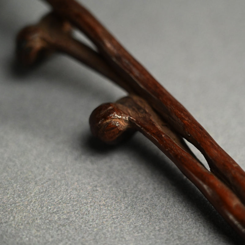 如意(中国語では如意)は、仏教や道教の芸術や文化的資料で使用され、見られる儀式用の笏またはお守りです。インドの仏教僧が使用したサンスクリット語の「儀式用の笏」であるアヌルッダに由来すると思われます。後にこの概念が中国に持ち込まれ、権威の象徴となりました。そこで如意は背中の掻き棒と融合しましたが、その背後には興味深い物語があります。仏教僧は結婚することがなかったので、子供を持つことを諦めました。背中の掻き棒(孫の手)は文字通り「孫の手」と翻訳されます。僧侶には孫がいないため、背中を掻いたり老後の世話をしてくれる人がいないため、生まれなかった人々の霊が笏に具現化されます。笏は僧侶にとって最も貴重な物の一つです。如意は社交の場で持つ文人や貴族にもよく見られ、その本来の機能は、ハエたたきや扇子と同様に、持ち主が「議席につく」資格を与える笏であったことは疑いようがないです。芸術では、如意は仏教の聖者や道教の仙人の象徴としてよく登場します。中国の如意は、ヒスイや貴金属などの貴重な素材で作られていたり、宝石がちりばめられていたりすることが多いですが、質素さと控えめさを強調する日本では木や竹で作られたシンプルで飾り気のない自然物の美学が重視されています。