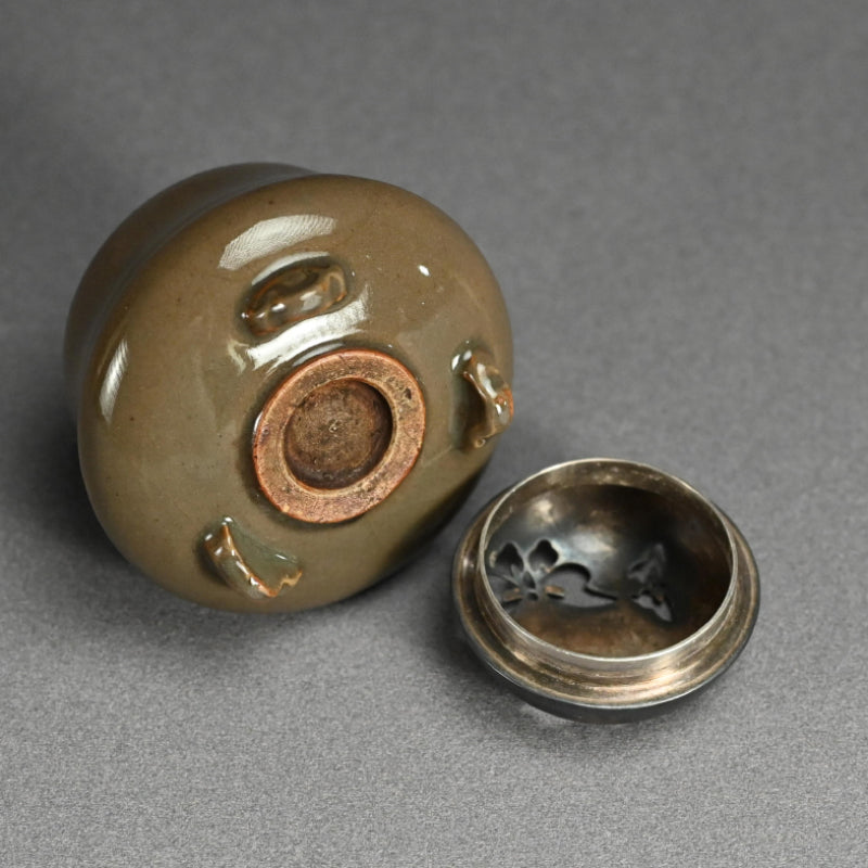 Antique Kyushu Celadon Koro Incense Burner with Silver Lid