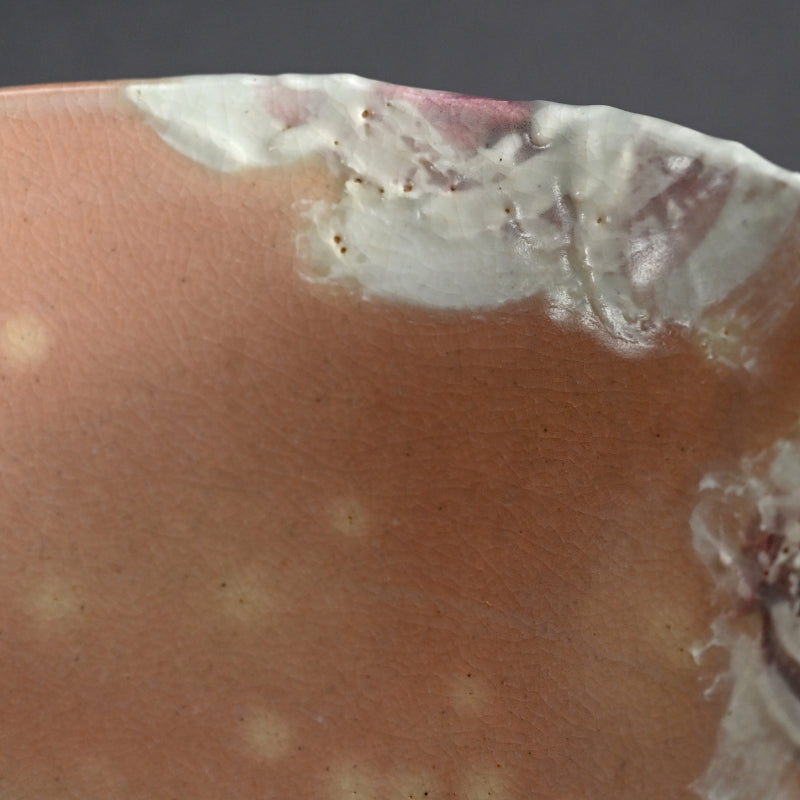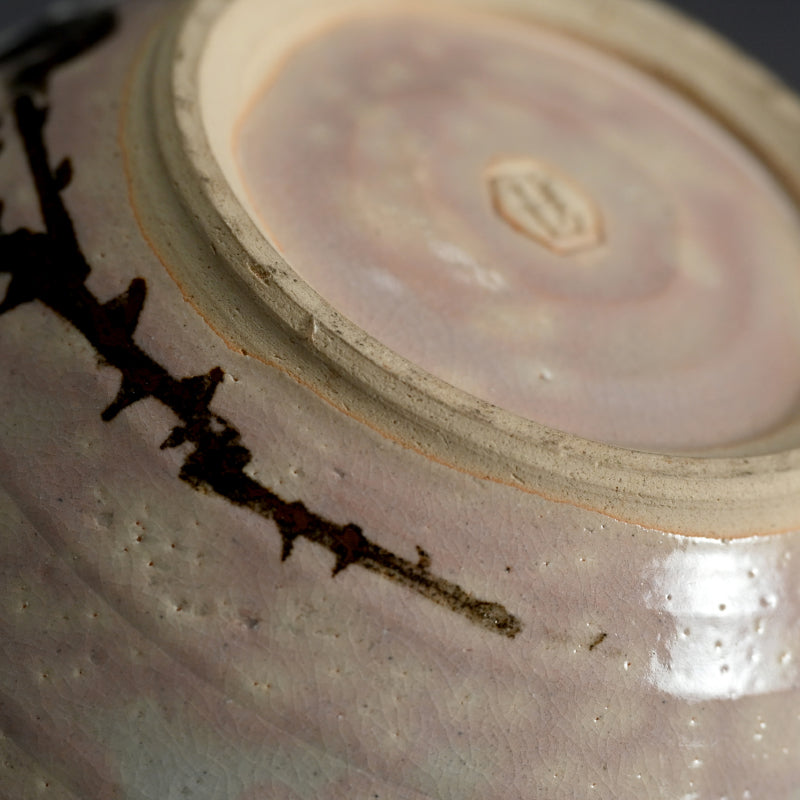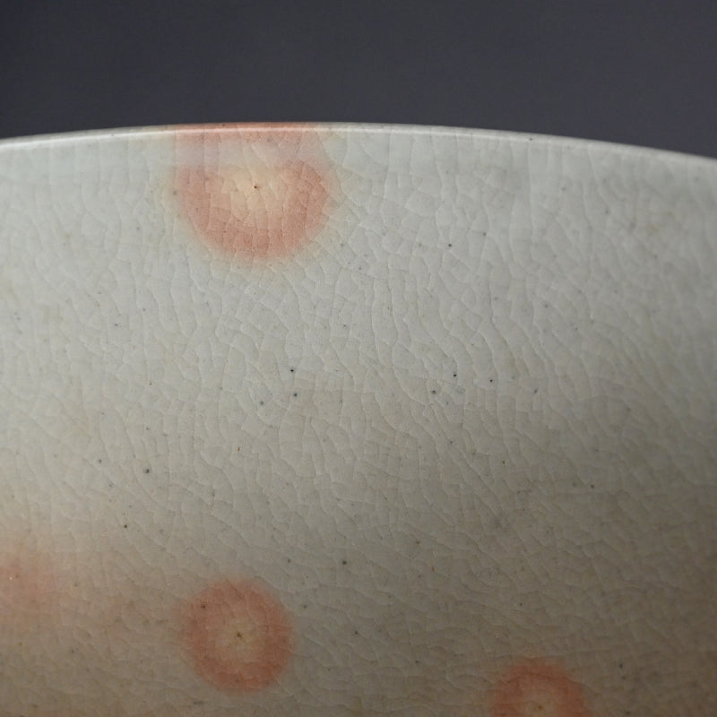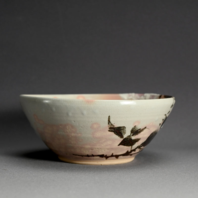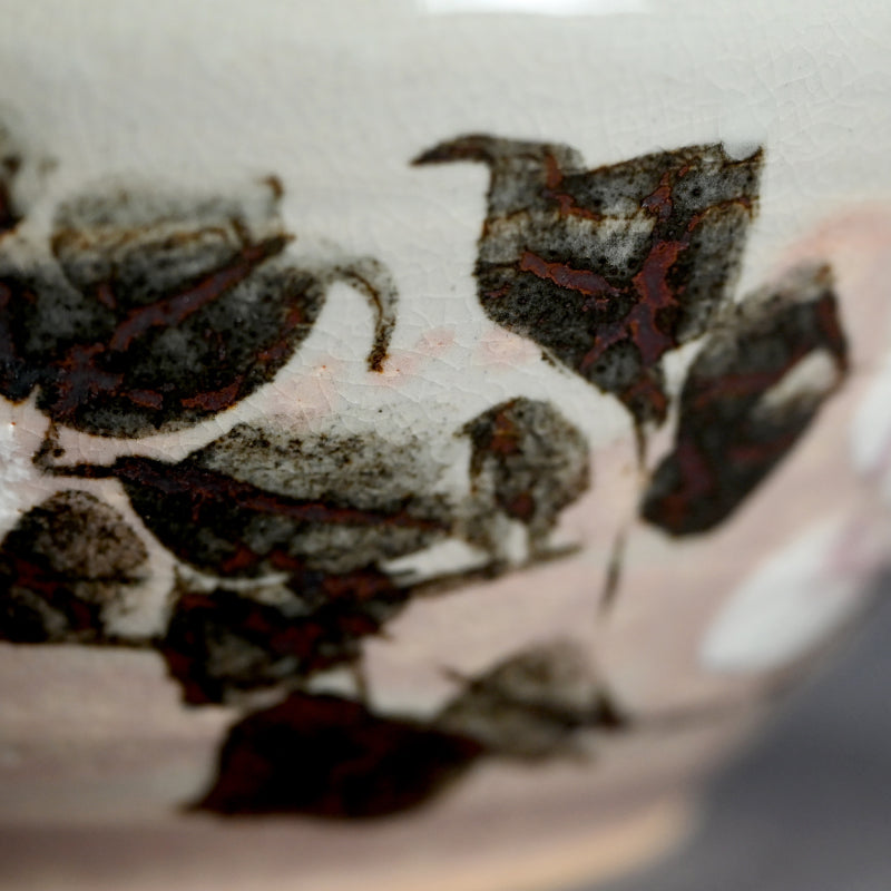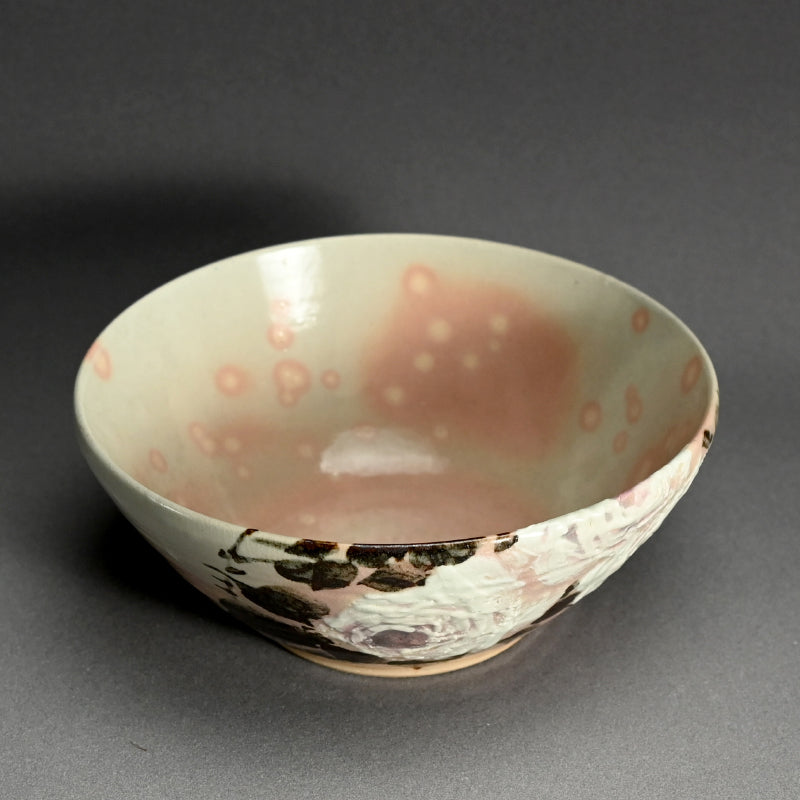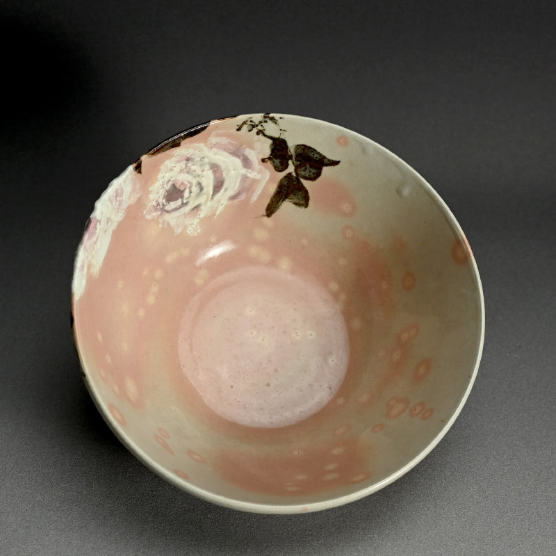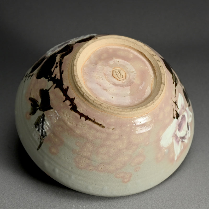 四代 清水 六兵衛による、白薔薇をあしらった小鹿斑点の五本釉鉢です。銘木箱入りで サイズは直径 22.5 cm 、高さ 9 cmで 状態は良好です。