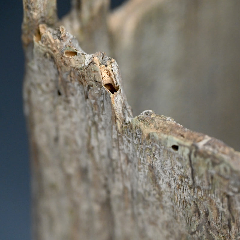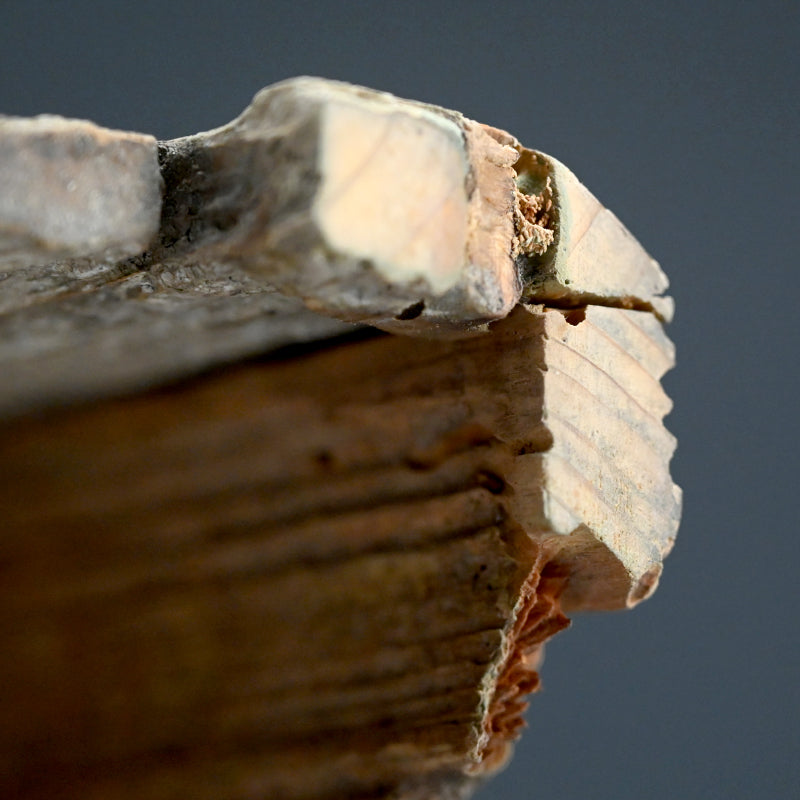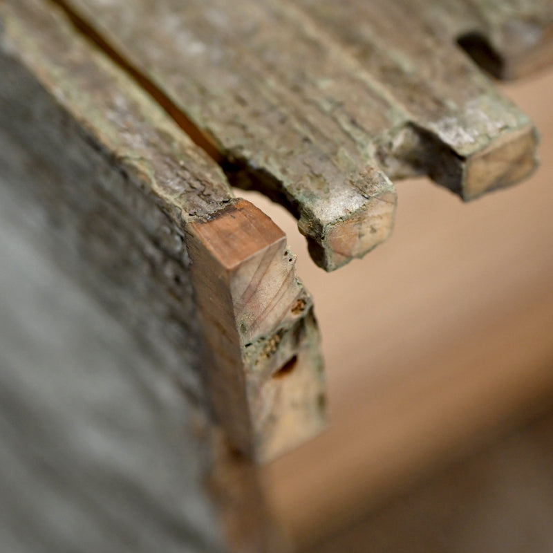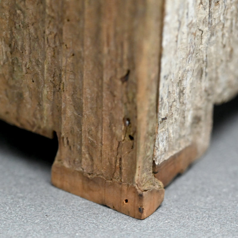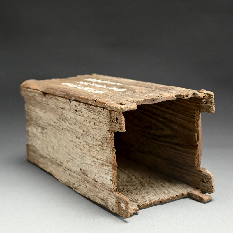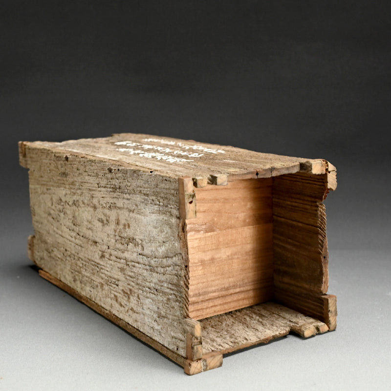 指物師 中島菊斎が古い水車の櫂で作った背の高い木製の花瓶のような容器です。富岡鉄斎の銘文が木に彫った形で飾られており、「鉄斎先生書刻 花瓶」と題されたオリジナルの署名入り木箱に収められています。17.5cm四方、高さ45.5cmで 状態は良好です。