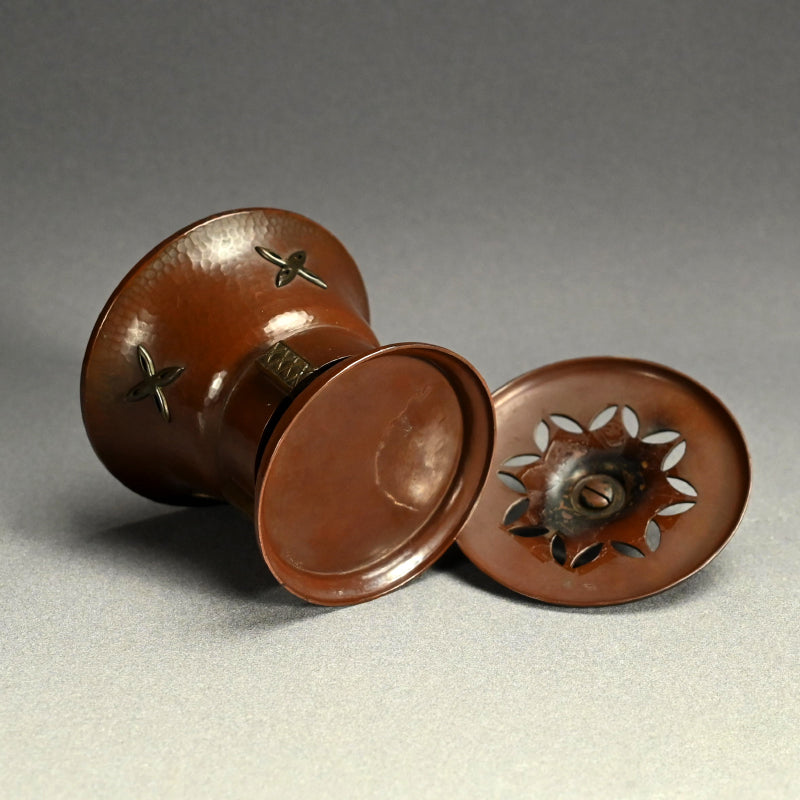 作者不明のアールデコ調の香炉です。1920年代初頭から中期にかけての日本製で、1930年代の様式を反映した緑青を帯びたブロンズ製です。直径11.5cm、高さ13cmで 状態は良好です。