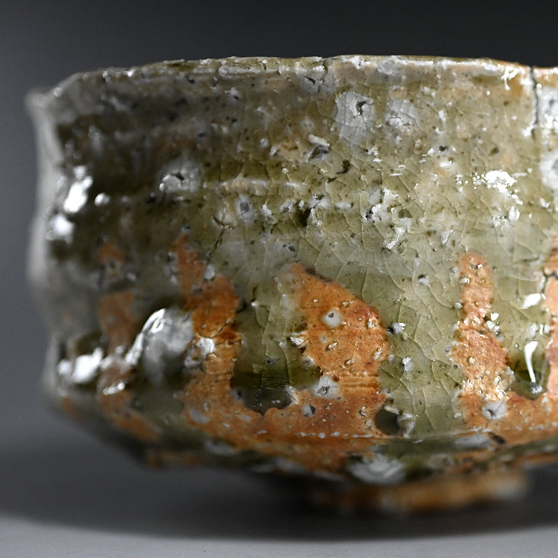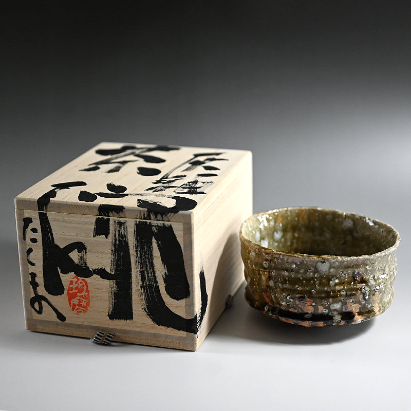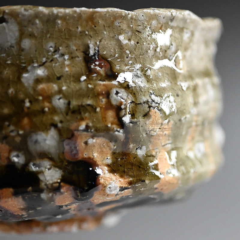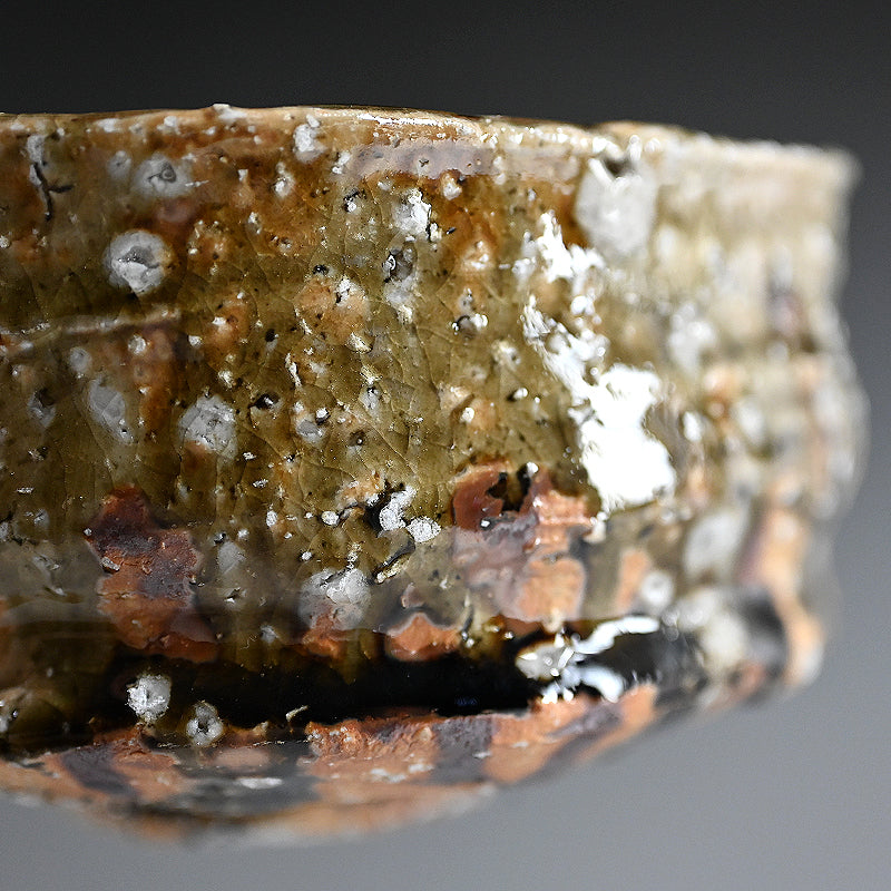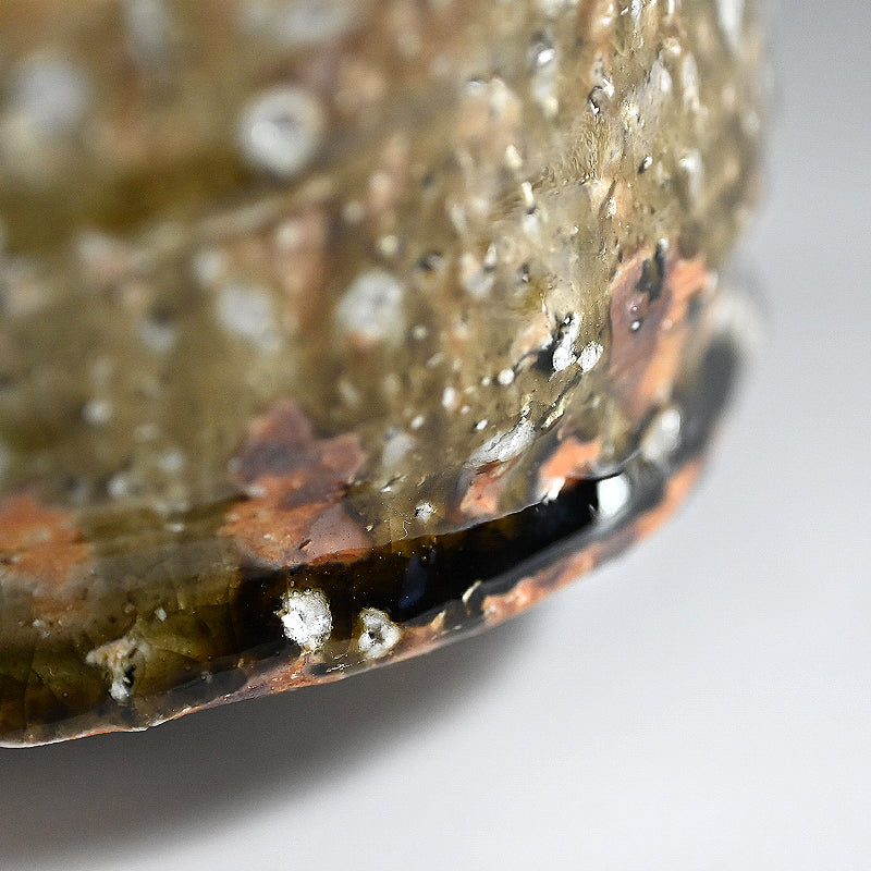 急勾配の茶碗の底には 緑色の水溜りが広がり、その壁は村越琢磨の指で引きずられています。オリジナルの署名入り木箱「灰釉茶碗」に収められています。表面からは白い長石の結晶からなる大きな紫石の泡が溢れています。サイズは 12 x 13 x 7.5 cmで、アーティストから直接届いた完璧な状態です。