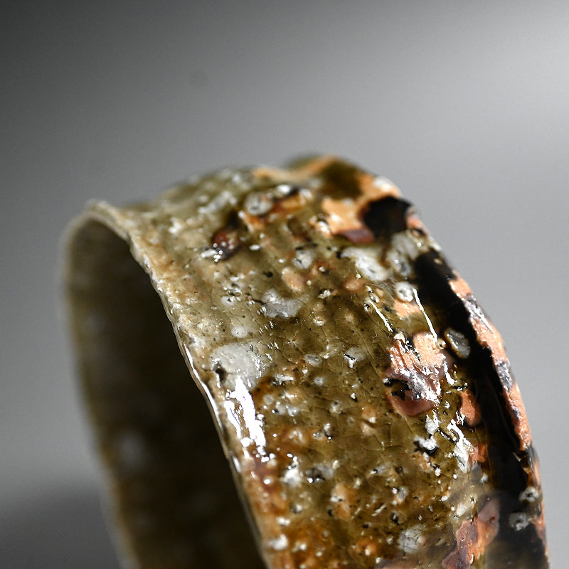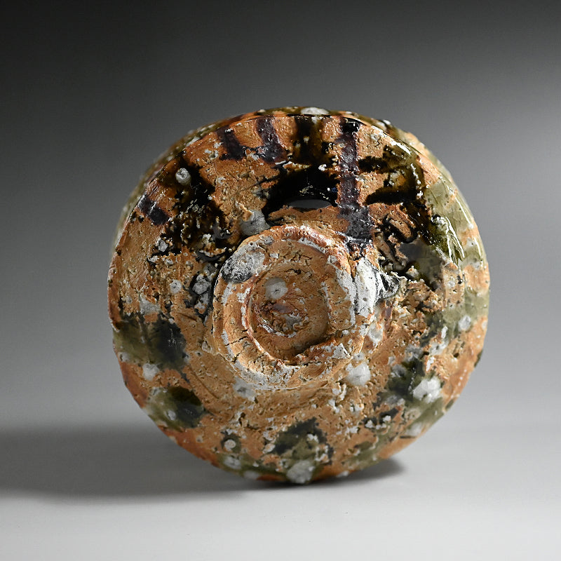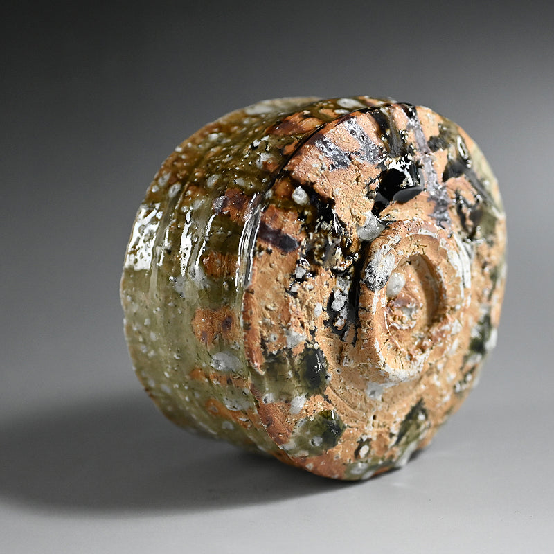 村越琢磨は、ただ土を扱って生きるという謎の人物の一人です。陶芸で生計を立てようとはしていませんが、その原始的なアプローチにより、作品の需要が高いファンを獲得しています。1954年に愛知県で生まれ、1980年に京都の陶芸家:梅原武平の指導のもとで陶芸の道を歩み始めました。非常に粗い信楽釉を好み、1997年に京都の清水焼地区に自分の窯を築き、2002年に長岡に移りました。競争の激しい展示会の世界を避けているものの、東京銀座の名門ギャラリー黒田陶園での個展をはじめ、日本の著名なギャラリーの多くで作品が取り上げられています。