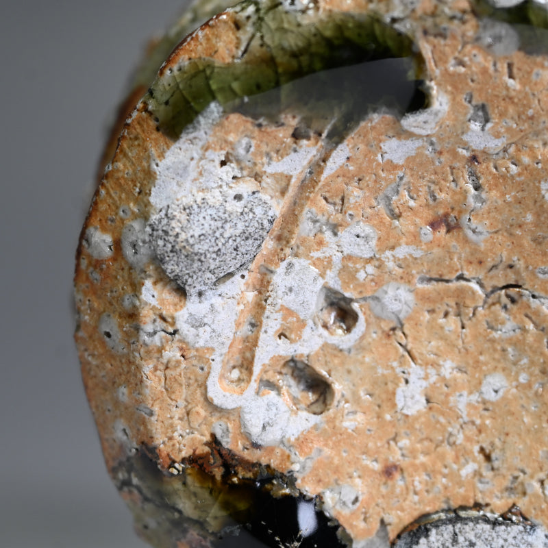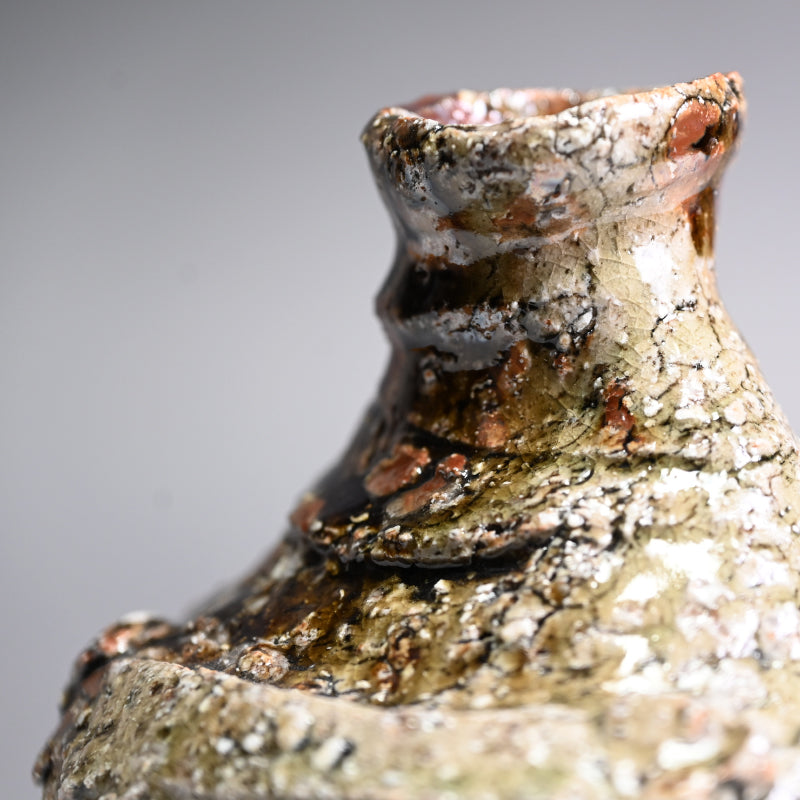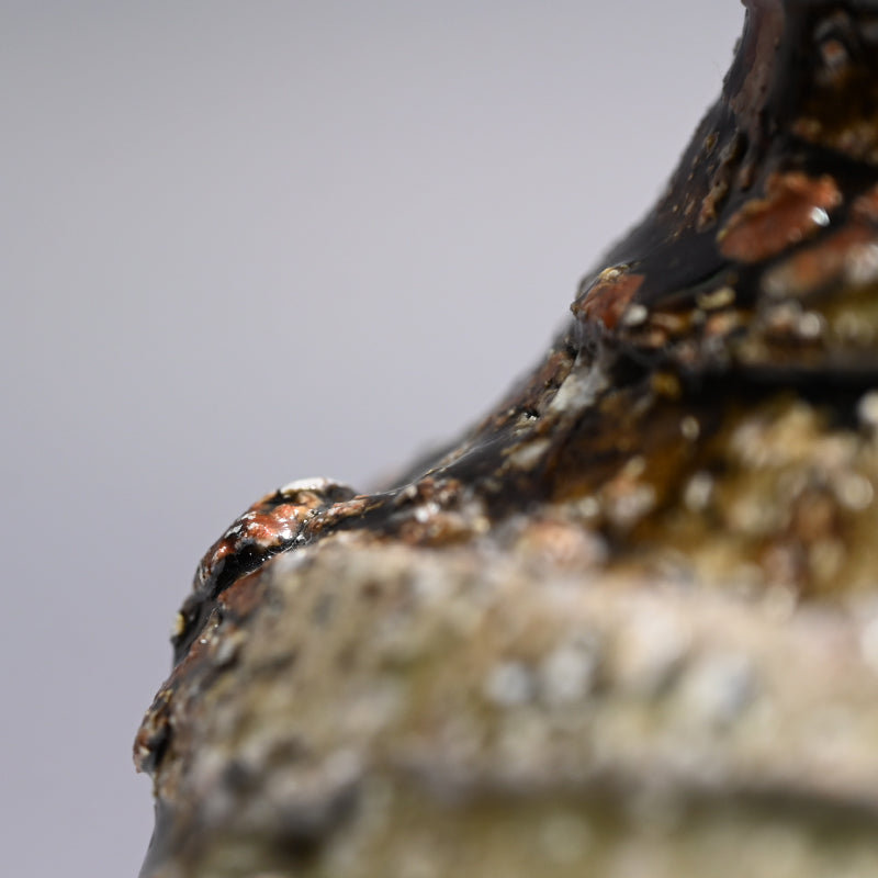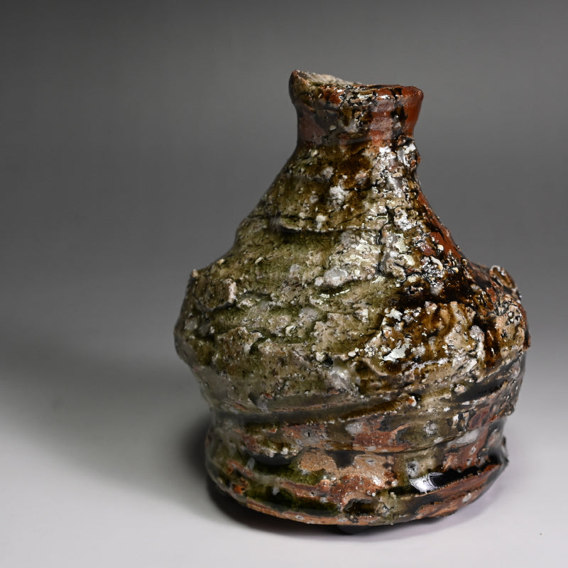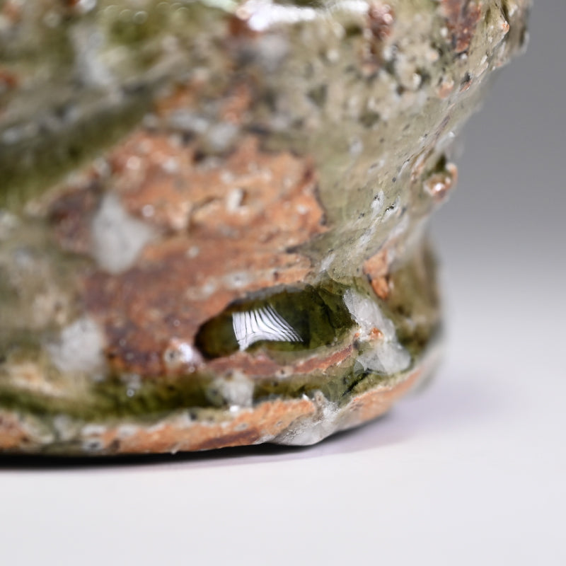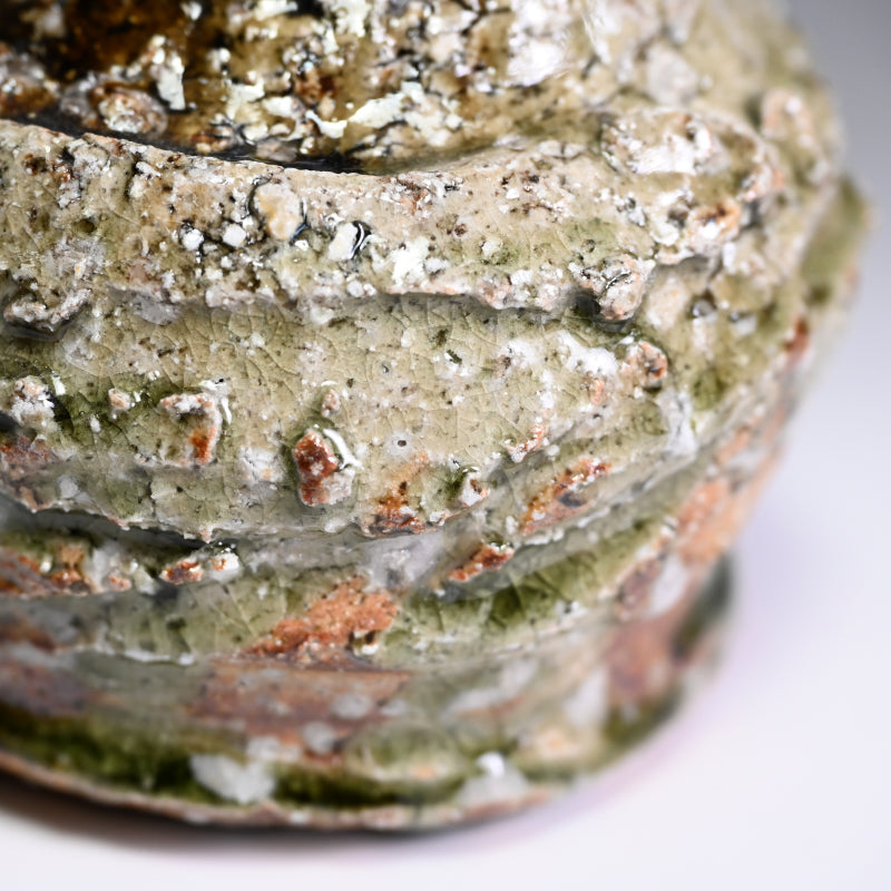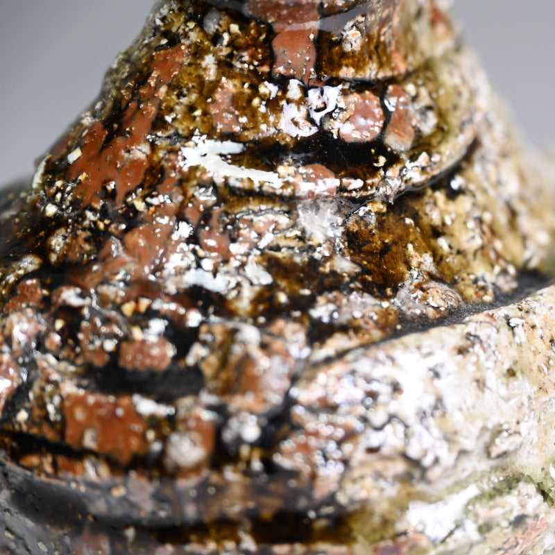 村越琢磨は、ただ土を扱って生きるという謎の人物の一人です。陶芸で生計を立てようとはしていませんが、その原始的なアプローチにより、作品の需要が高いファンを獲得しています。1954年に愛知県で生まれ、1980年に京都の陶芸家:梅原武平の指導のもとで陶芸の道を歩み始めました。非常に粗い信楽釉を好み、1997年に京都の清水焼地区に自分の窯を築き、2002年に長岡に移りました。競争の激しい展示会の世界を避けているものの、東京銀座の名門ギャラリー黒田陶園での個展をはじめ、日本の著名なギャラリーの多くで作品が取り上げられています。