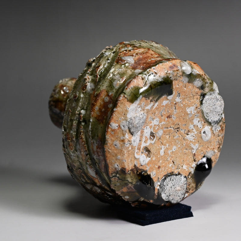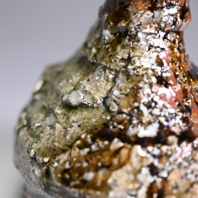 村上琢磨による瓶形花瓶で、署名入りのオリジナル木箱「灰釉花入れ」に入っています。手に負えない粗い土に紫石がびっしりと散りばめられ、鉄と濃い緑色の灰釉がまだら模様になっています。直径約13cm、高さ14.5cmで、アーティストから直接届いた完璧な状態です。