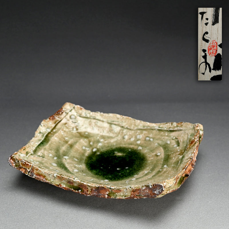 A swirling slab filled with liquified kunugi ash forming an emerald pool by Murakoshi Takuma enclosed in the original signed wooden box titled Hai-yu Rokuro Kaku-zara. It is 29.5 x 22 x 7.5 cm (12 x 9 x 3 inches) and is in excellent condition, directly from the artist this winter.