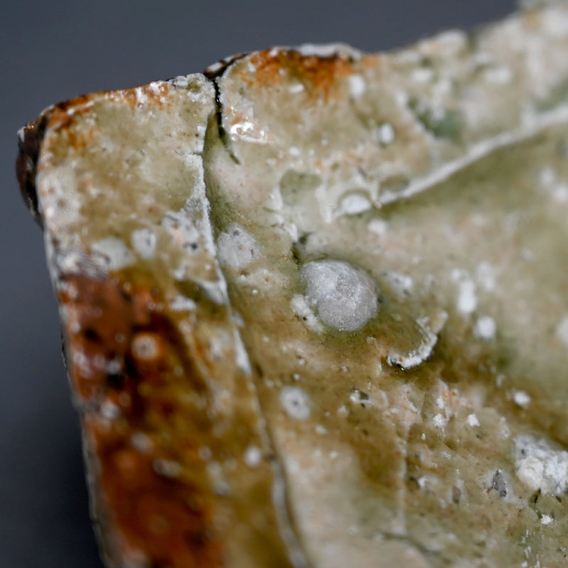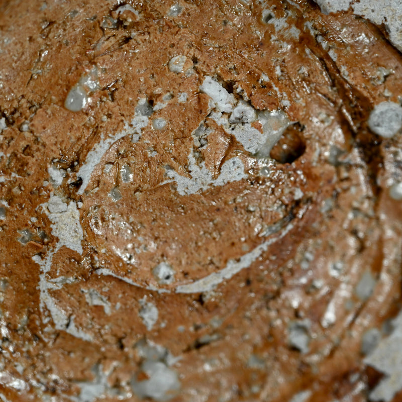 Murakoshi Takuma is one of those enigmas who simply lives to work with clay. He does not seek to make a living through pottery, but through his primal approach has earned a following which keeps his work in high demand. He was born in Aichi prefecture in 1954 and began his stroll down the pottery path in 1980 under the tutelage of Kyoto potter Umehara Takehira. Favoring very rough Shigaraki glaze, he established his own kiln in 1997 in the Kiyomizu pottery district of Kyoto, then moved to Nagaoka in 2002. Although eschewing the world of competitive exhibitions, he has been picked up by many of Japan’s preeminent galleries, including private exhibitions at the prestigious Kuroda Toen of Tokyo’s Ginza District.