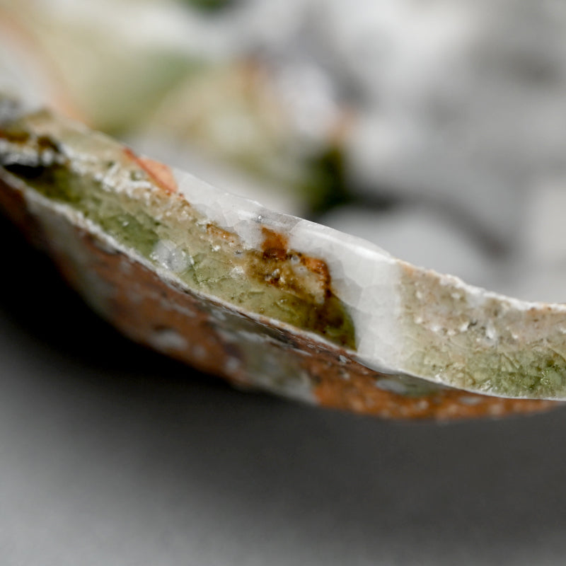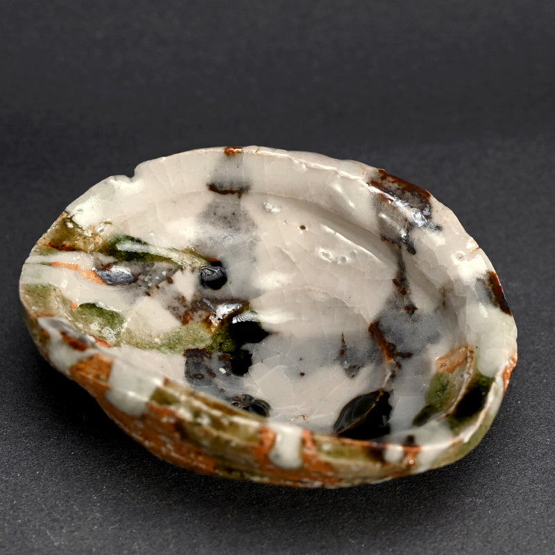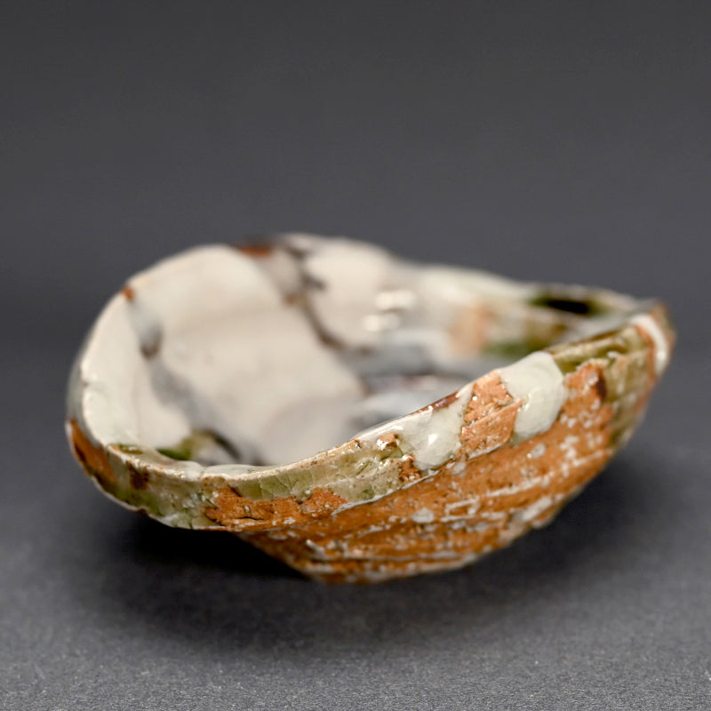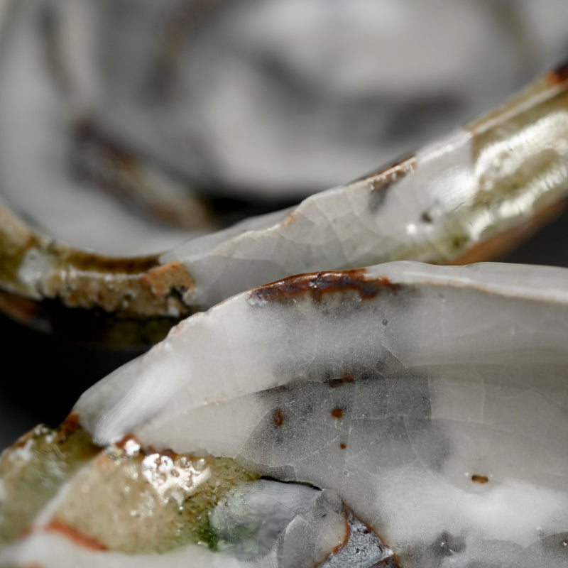 A set of small Abalone Shell Shaped bowls covered in a combination of feldspar, iron and ash glazes creating liquid pools of jade green by Murakoshi Takuma enclosed in the original signed wooden box titled Shunju Awabi Bachi. This is one of his most popular forms, and we had to get to the kiln immediately after firing to garner a few sets. Perfect for winter food, Daikon radish, boiled vegetables or chunks of fish in broth. These are 13.5 x 11 x 5.5 cm (5-1/2 x 4-1/2 x 2 inches) and are in perfect condition, from late this autumn.