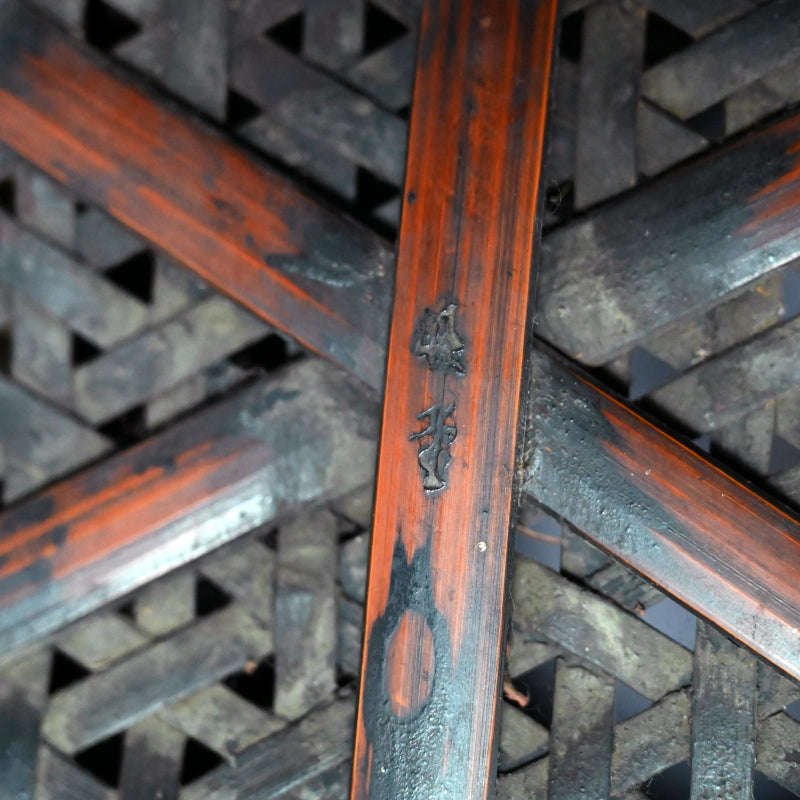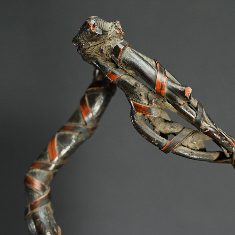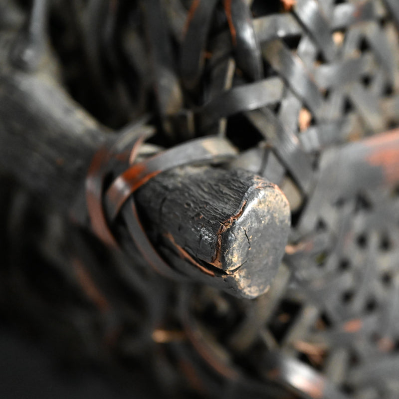 20世紀初頭に作られた 非常に大きな籠です。濃い竹の底に、ランダムな織り模様でループ状に編まれた根木の持ち手が刻印されています。竹の筒の側面に編み込まれた3本の根木の脚で支えられています。籠の直径は23.5cm、高さは78cmで 全体的に良好な状態です。底の周囲には 経年劣化と使用に伴う 細い竹ひごが数本見られます。