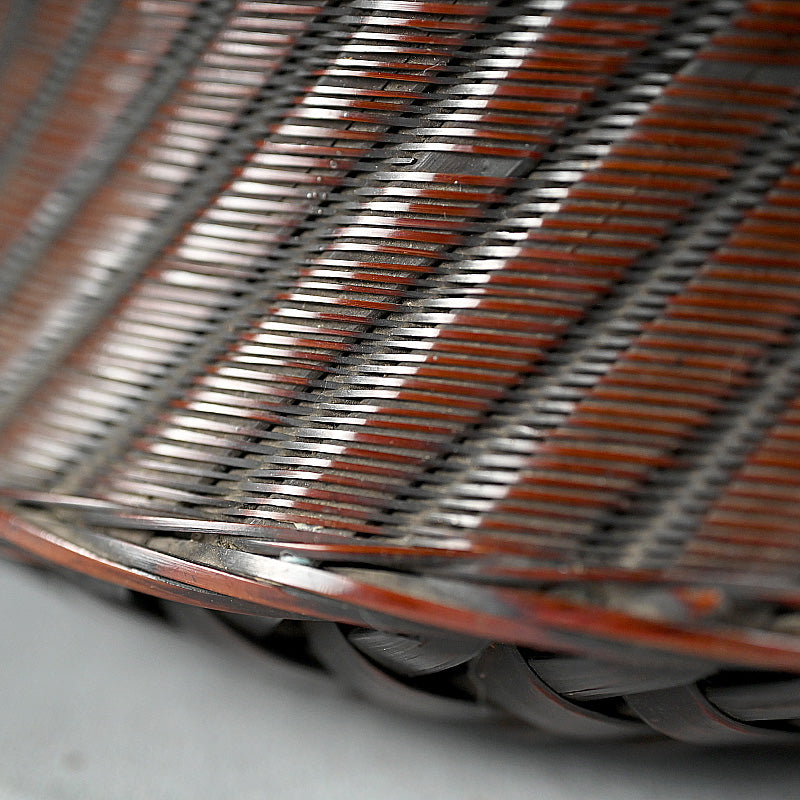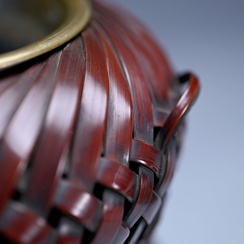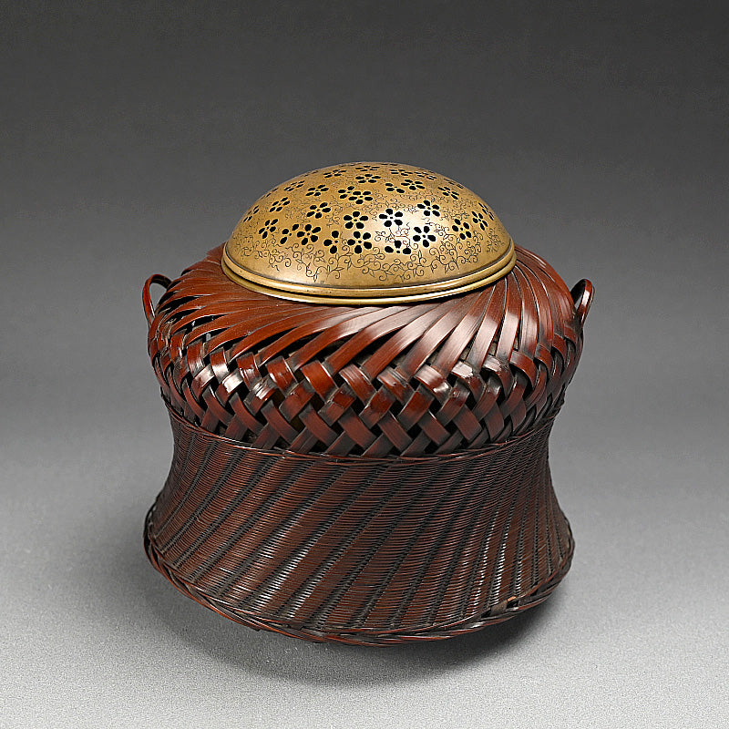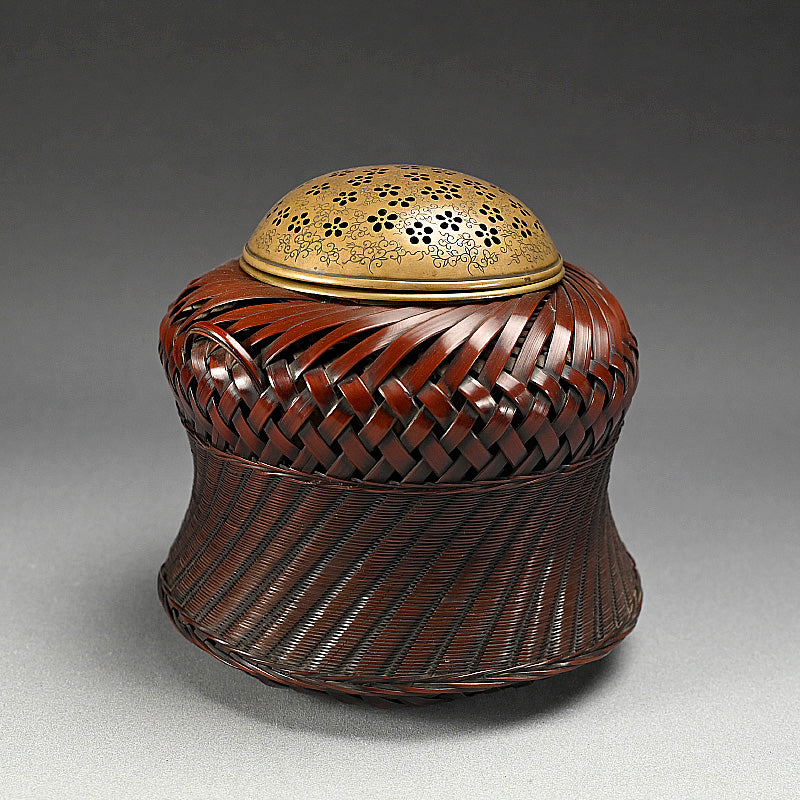 真鍮の容器に花のついた蓋をかぶせ、その周囲に竹籠を編んだとてもユニークな香炉です。 直径は22cm、高さはほぼ同じで 全体的に良好な状態であり、経年変化で黒ずんだ木箱に収められています。