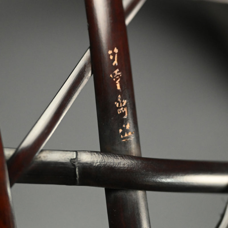二代目 田邊竹雲斎(1910-2000)は、唐物籠で知られる初代 田邊竹雲斎の息子として大阪に生まれ、幼少の頃から父のもとで修行を積みました。5歳の時には従弟の竹雲斎とともに父の大阪三越での個展で竹細工の実演を行い、六角形の編み方の巧みさで皆を感心させたとか。1919年(大正8年)の9歳の時、父は文学者に育てようと 中国学者の土田湖南に書を習わせました。晩年の作品は、幼少時に習った南画と書の成果です。1925年、15歳の時に初の個展を開き、父から松竹雲斎の号を賜りました。1930年に浪花蘭友会に入会し、1931年に日展に初入選。戦前戦後も出品しました。1937年、父の死去に伴い二代目 竹雲斎を襲名。先代の緊張感のある唐物籠から離れ、より開放的でゆったりとした編み方や張り方を独自に展開しました。1981年に日本政府より文化功労勲章を授与され、1991年 長男に工房名を譲って三代 竹雲斎となり、隠居名を一九斎としました。作品は、ニューヨークのメトロポリタン美術館、ボストン美術館、サンフランシスコアジア美術館、前述のミネアポリス美術館など、世界中の多くの美術館に所蔵されています。