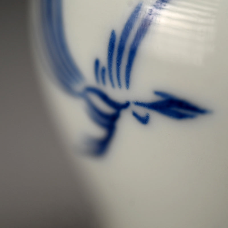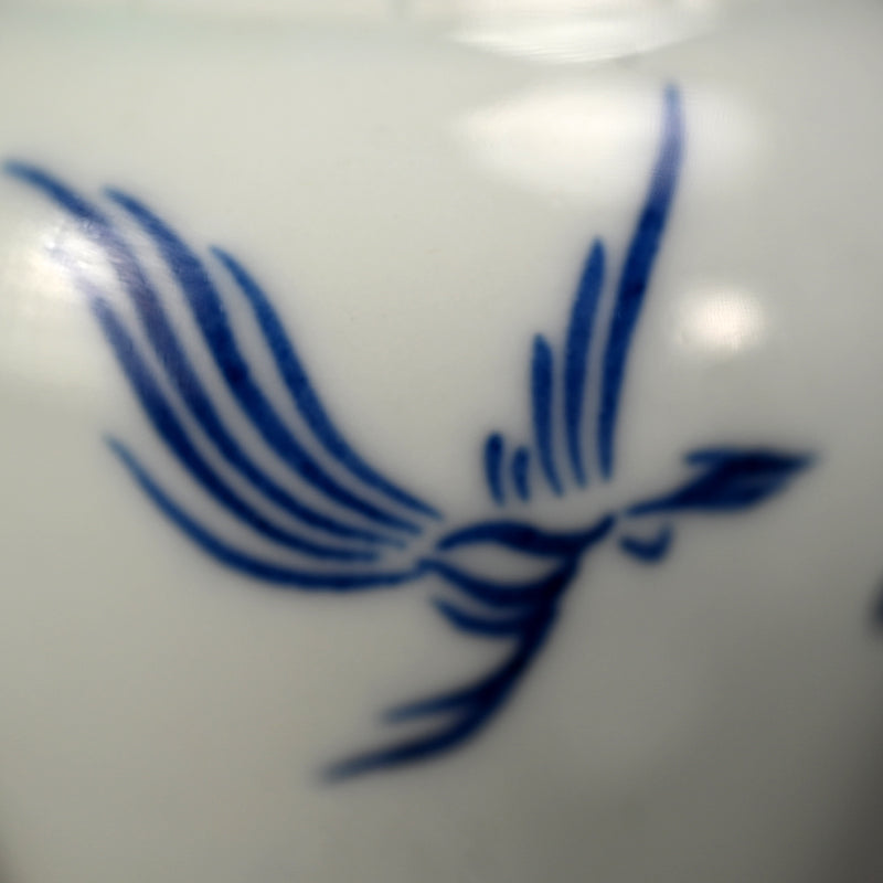清水六兵衛による 高貴な鳥をあしらった蓋付花瓶の箱入りセットです。当時の木箱に収められています。高さは約12cmで状態は良好です。この銘から判断するのは非常に困難ですが、おそらく四代目 六兵衛の作品、または五代目の非常に初期の作品であると思われます。