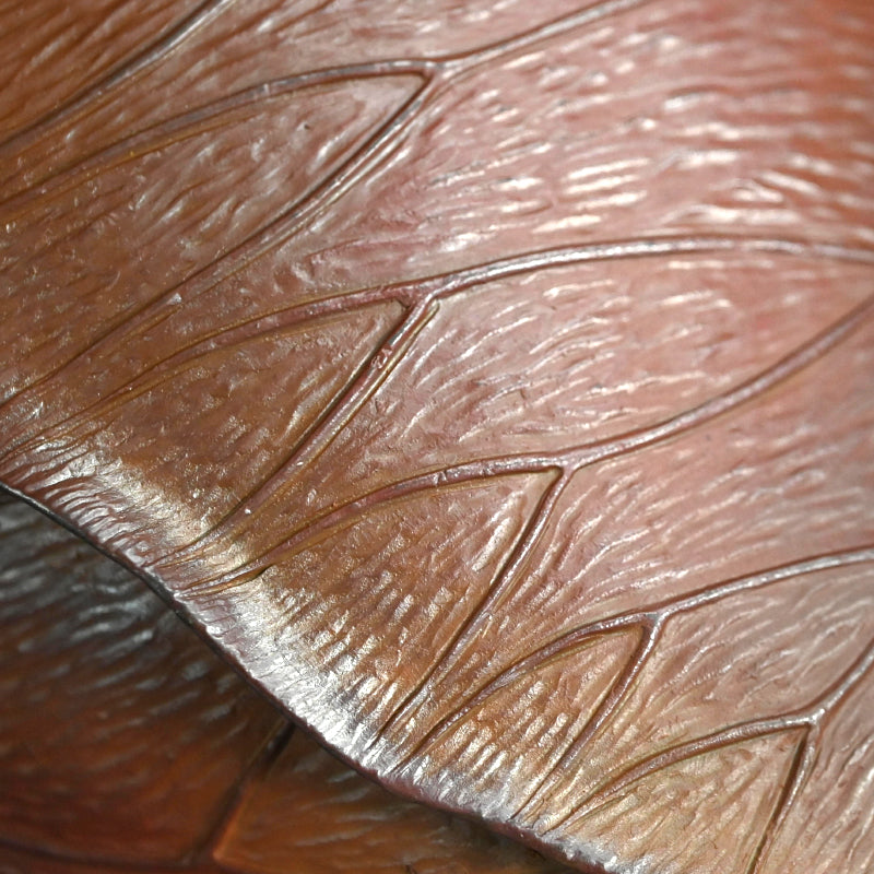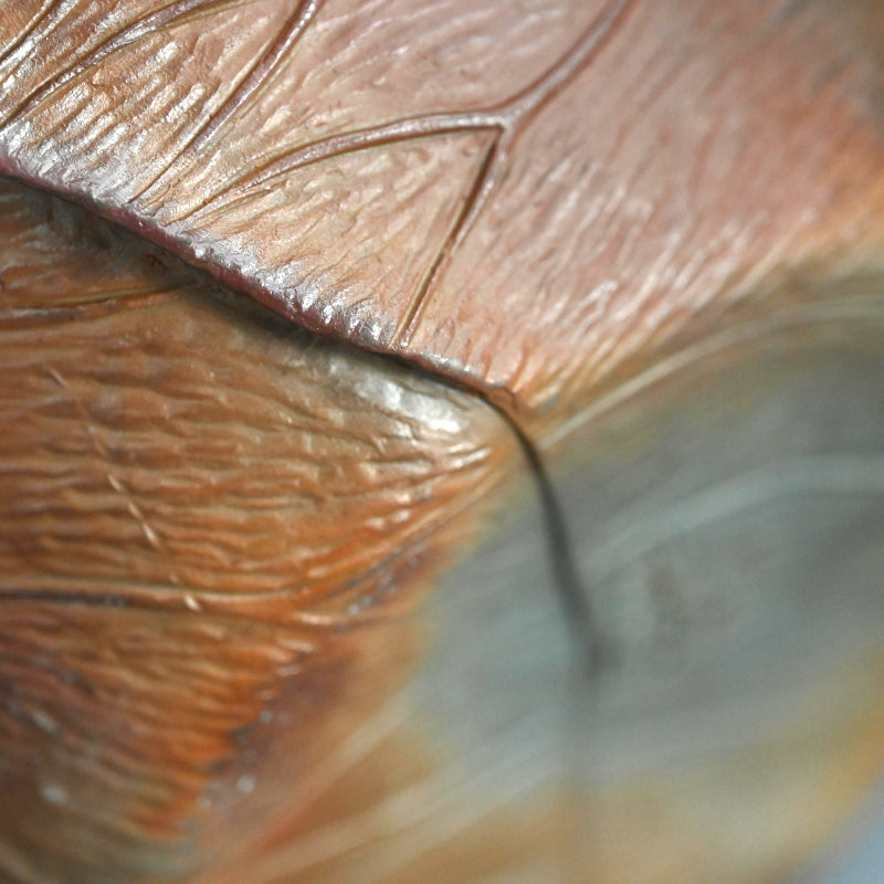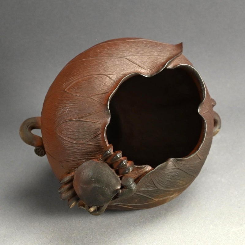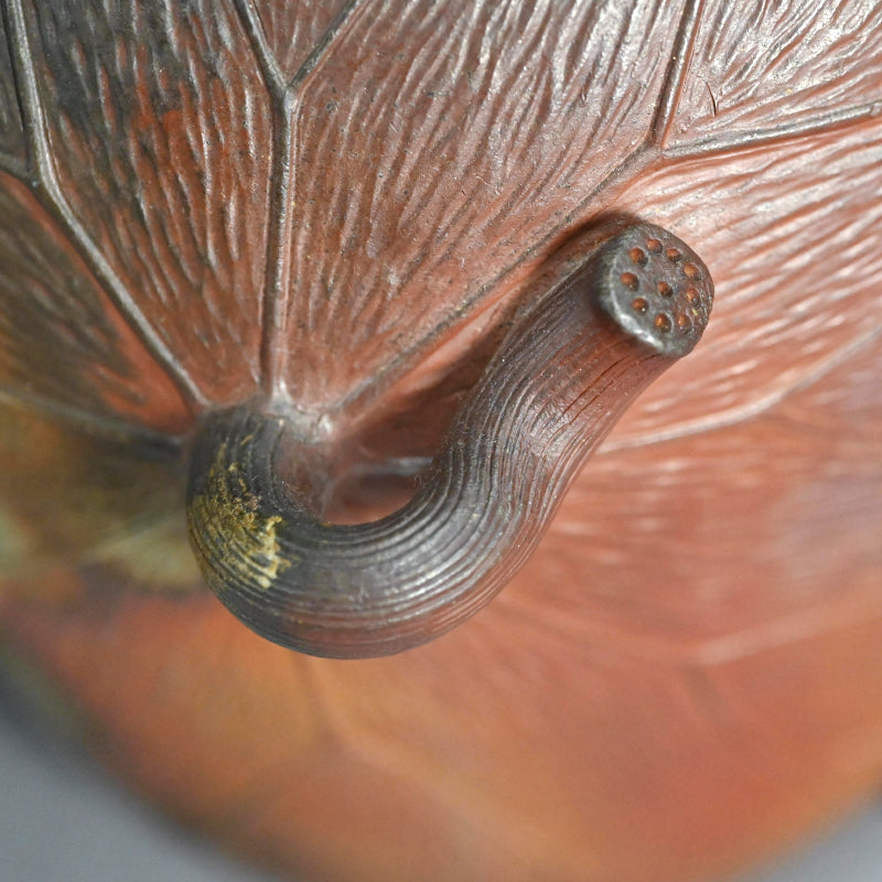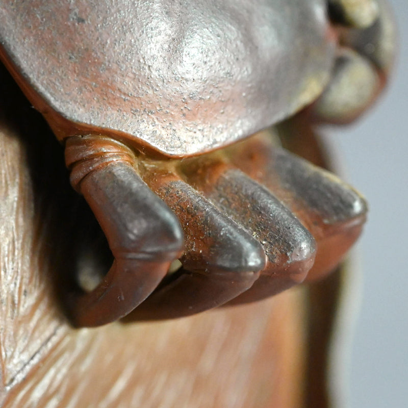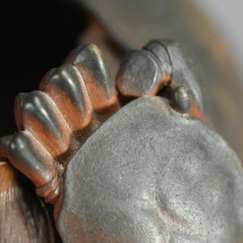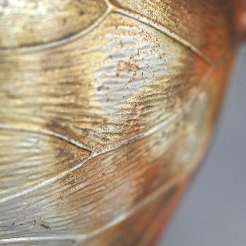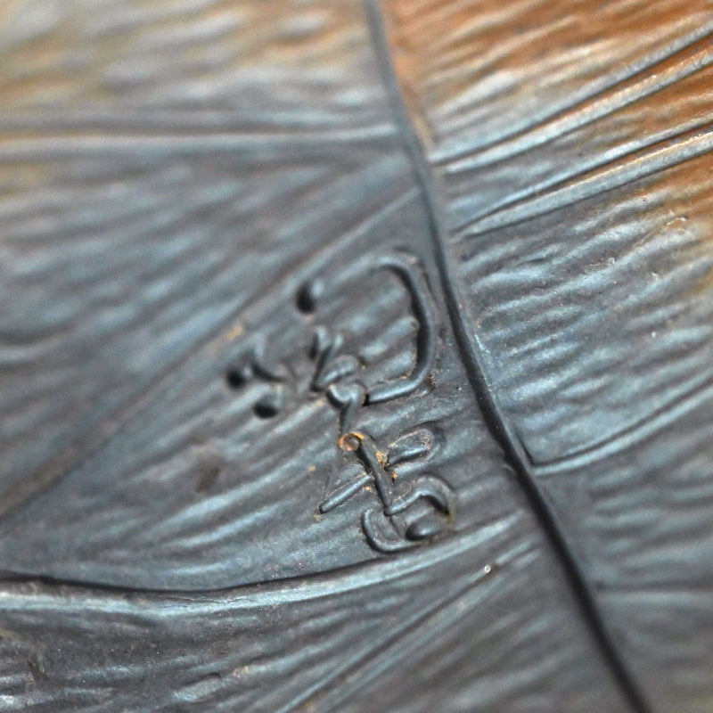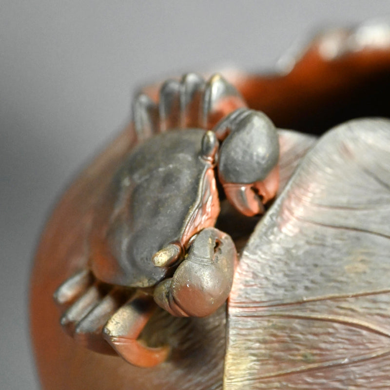備前焼は個人的にも大好きなのですが、色合いが繊細でデザインも日本的な雰囲気が強いためウェブサイトではあまりご紹介していません。しかし、この二代目 小西 陶古(当時としては稀有な女性陶芸家) による重なり合う蓮の葉を象った美しい花瓶は、まさに異彩を放ちます。茎まで付いた蓮の葉が重なり合い、水盤を形成しています。その水盤の上を大きなカニが口元へと這い上がっています。備前焼の空間に佇むこの花瓶はまるで鐘を鳴らすかのように際立っています。サイズは23 x 21 x 23cmで 状態は良好です。