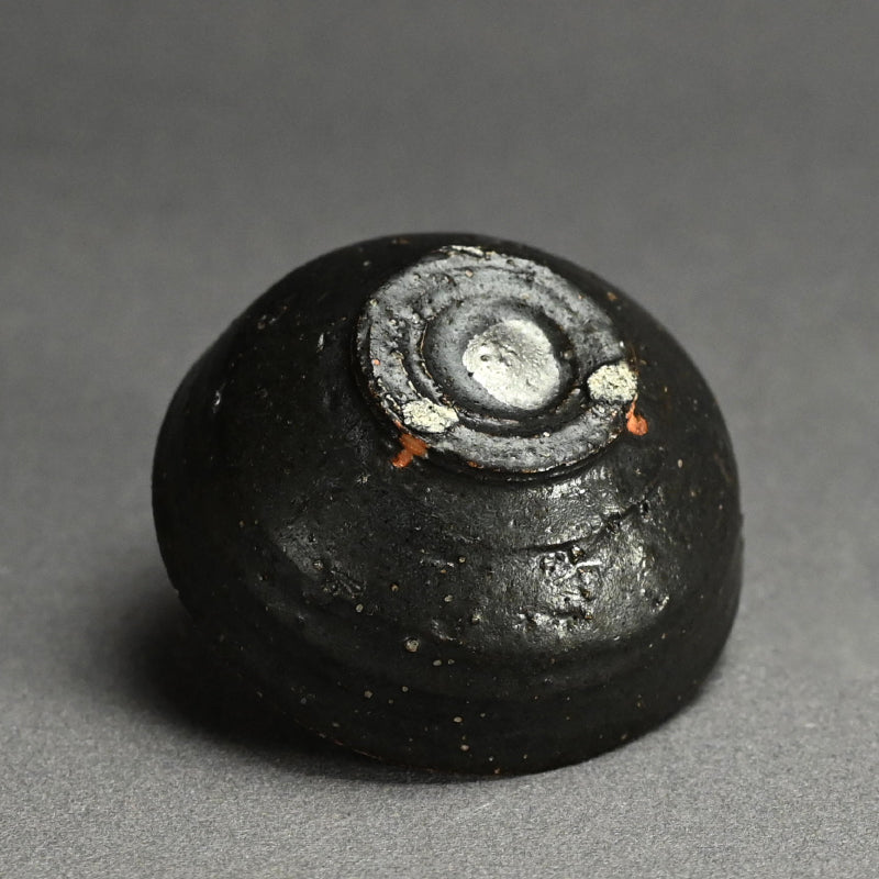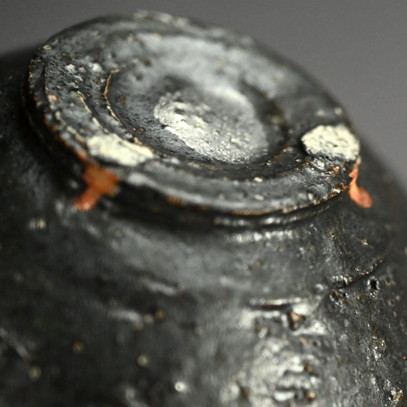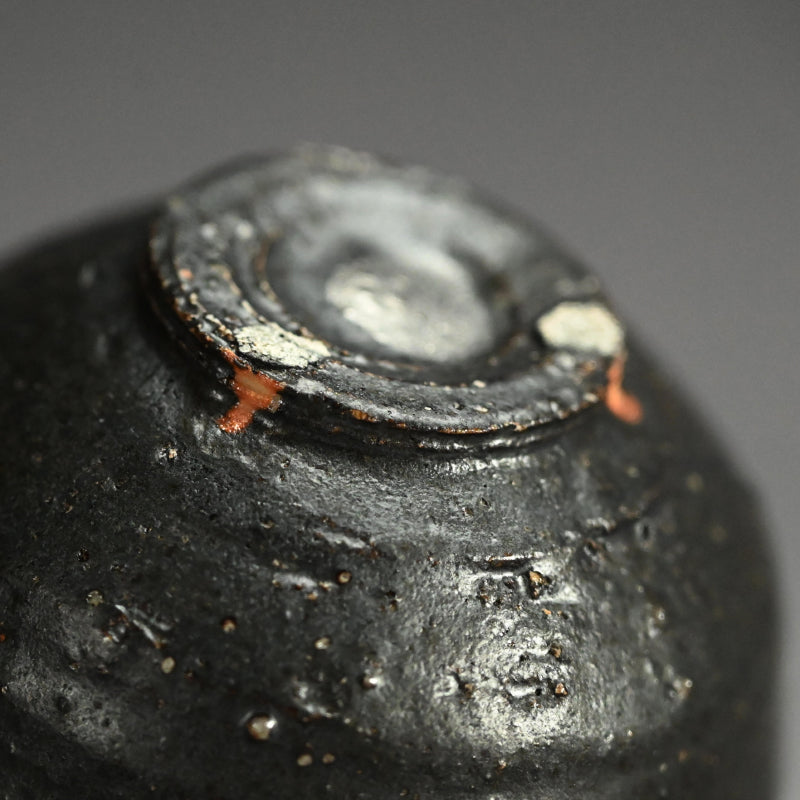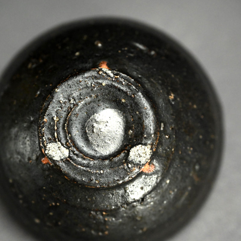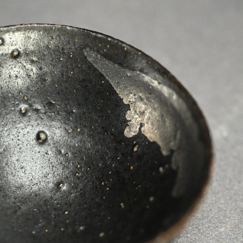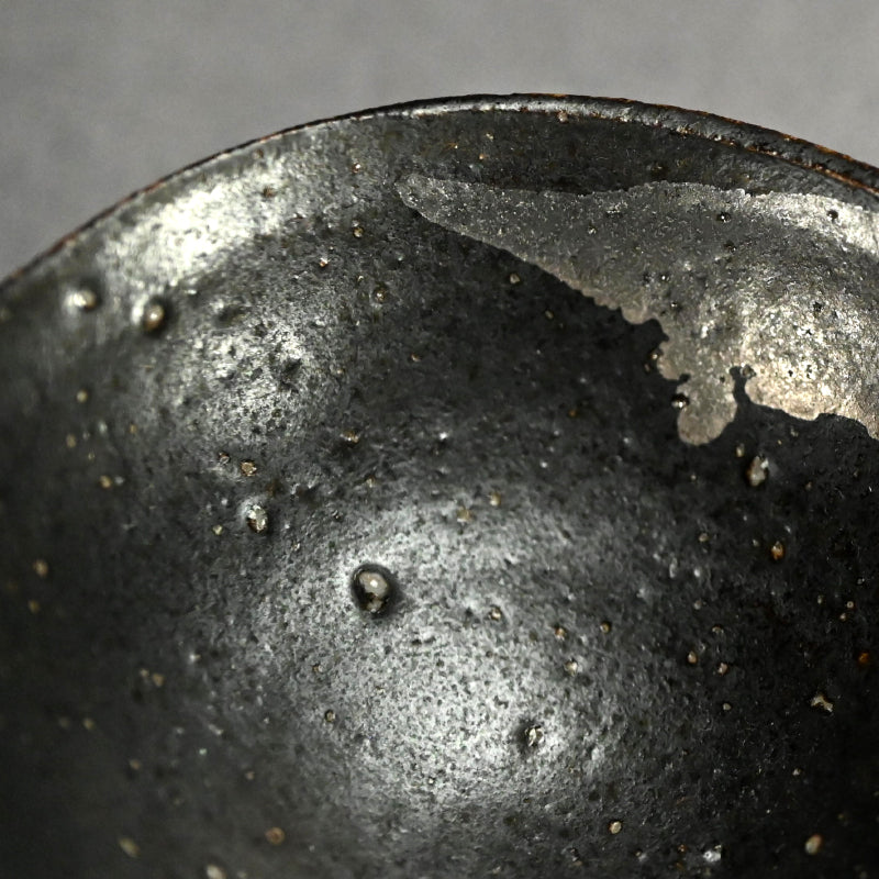 重森陽子作の黒釉を施した深みのある土器。中央には垂れた銀の抽象画が描かれ、直径8.2cm(3.5インチ)で保存状態は良好。重森陽子の署名入り木箱に収められており、甥の筆跡が刻まれています。