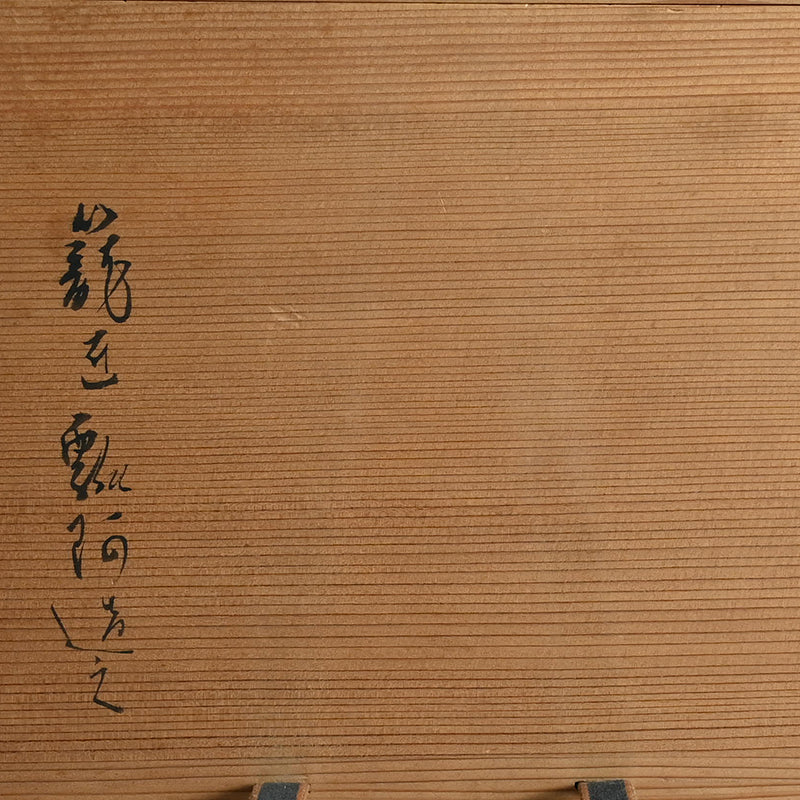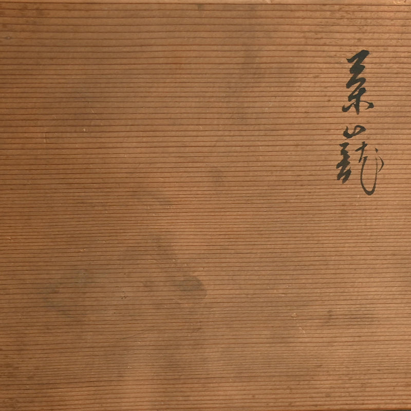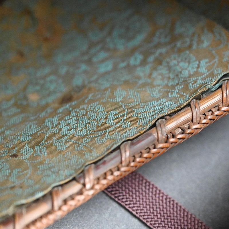 A hand-woven basket of bamboo and reeds over gold foil signed on the base with the incised mark of the craftsman. The interior is lined with silk brocade. We have replaced the tie strings. It is 20.5 x 17.5 x 17 cm (8 x 7 x 6-3/4 inches) and comes in a period wooden box titled Chakago.