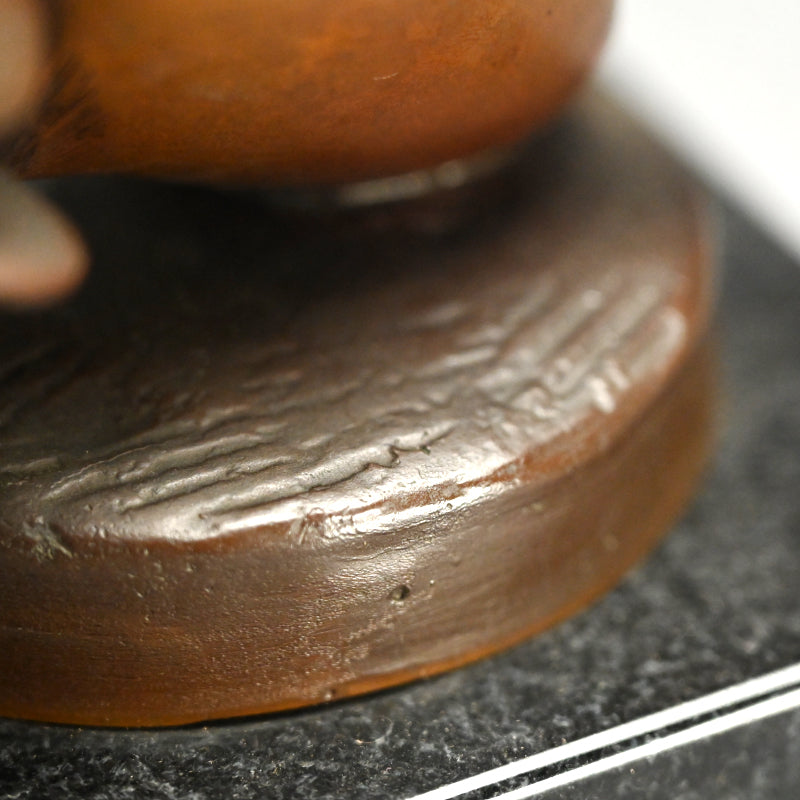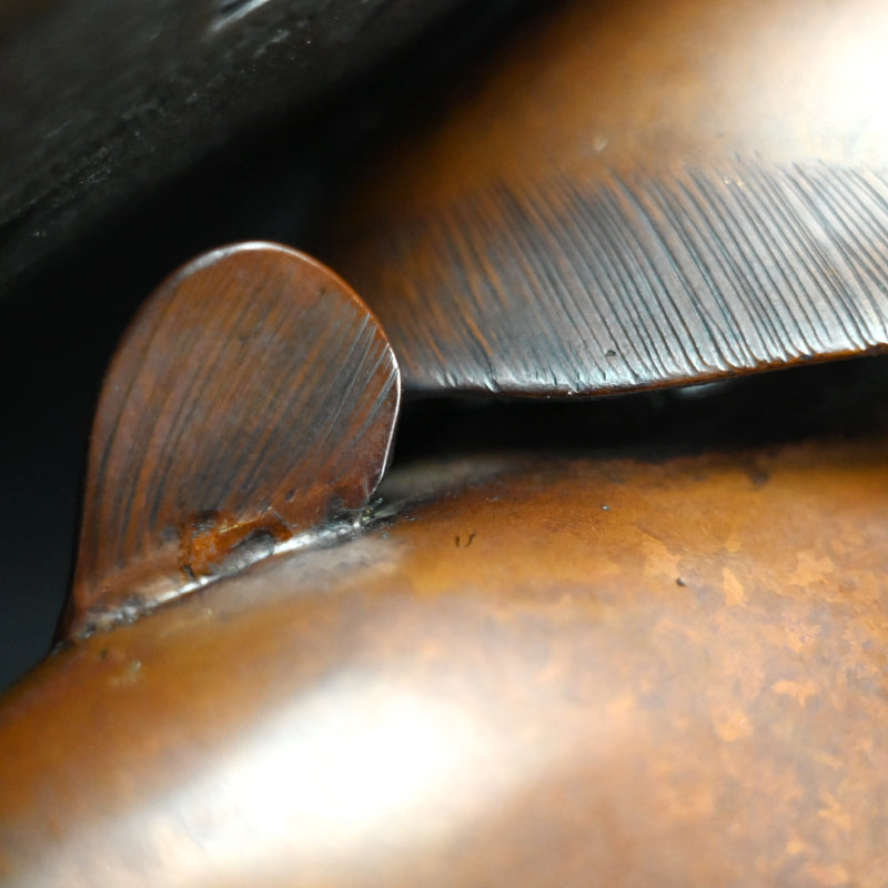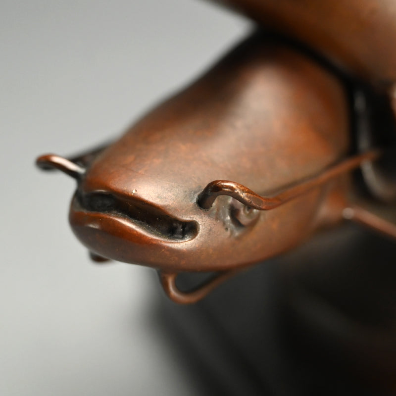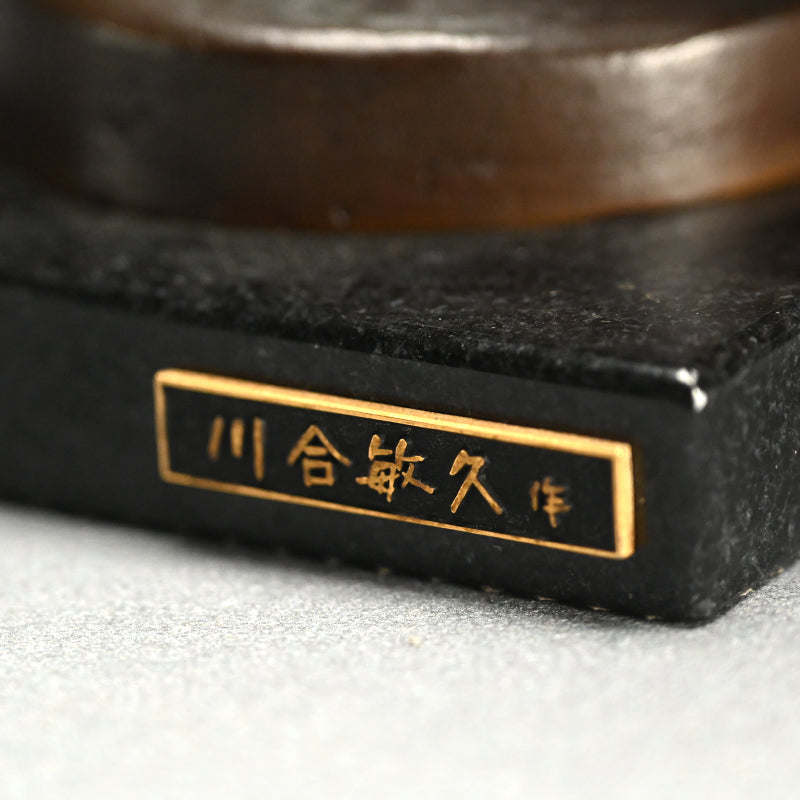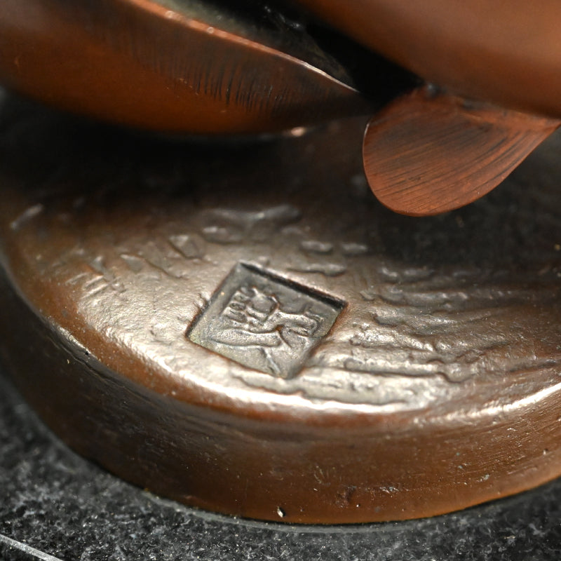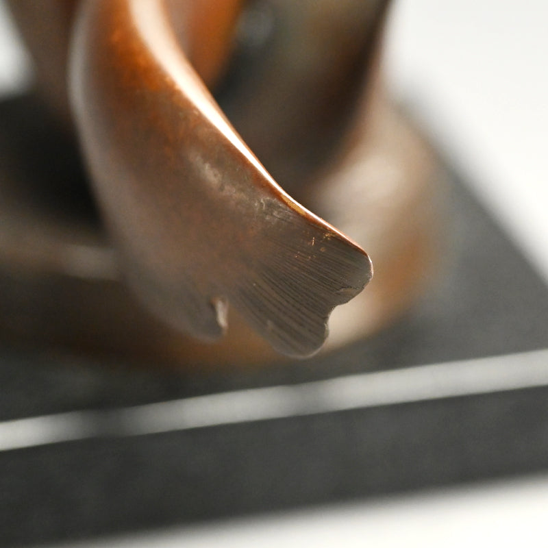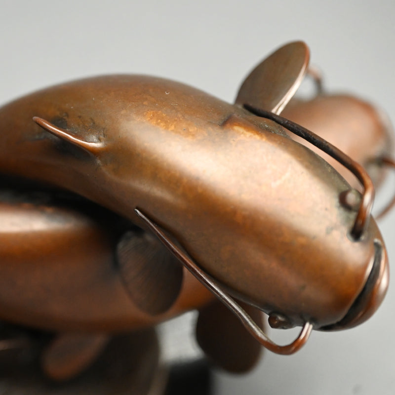 川合敏久の署名入りブロンズ彫刻で、石の台座に取り付けられており、一対のナマズが互いにすり抜けて動き回っています。2体合わせて22.5 x 12 x 15.5 cmあり、状態は良好です。
