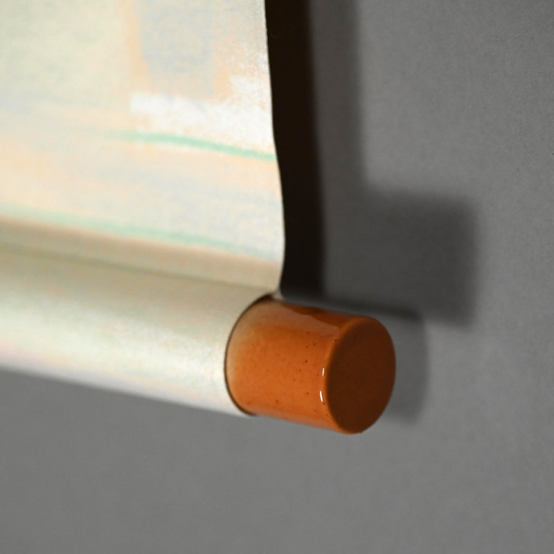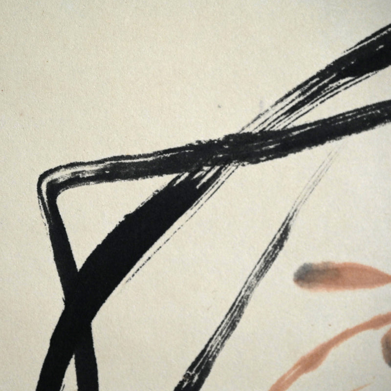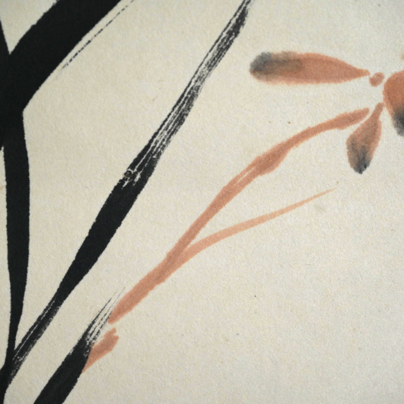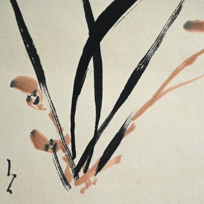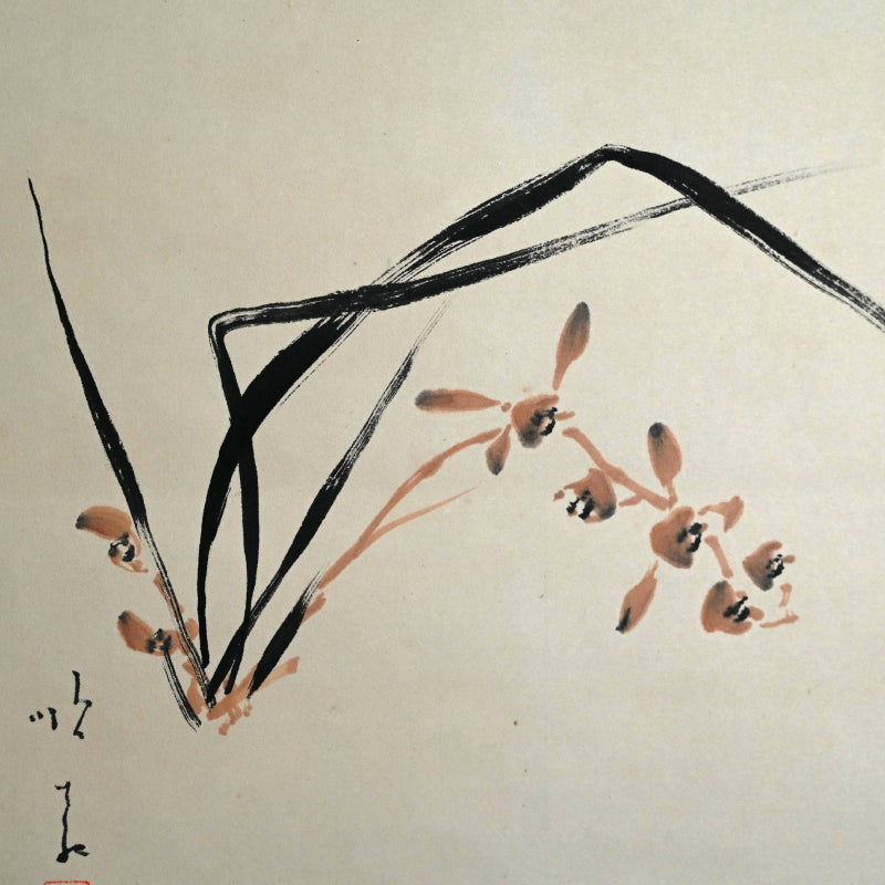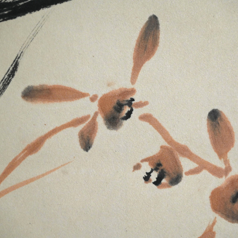 悲劇の尼僧・大石順教の詩を添えた蘭の花が、上質な桐箱に収められています。紙本に墨と淡彩で彩色され、夕焼けの空を描いた雲を思わせる美しい絹本縁に、陶器の軸先が描かれています。本幅は57.5cm×125.5cm(23×49.5インチ)で、保存状態は良好です。