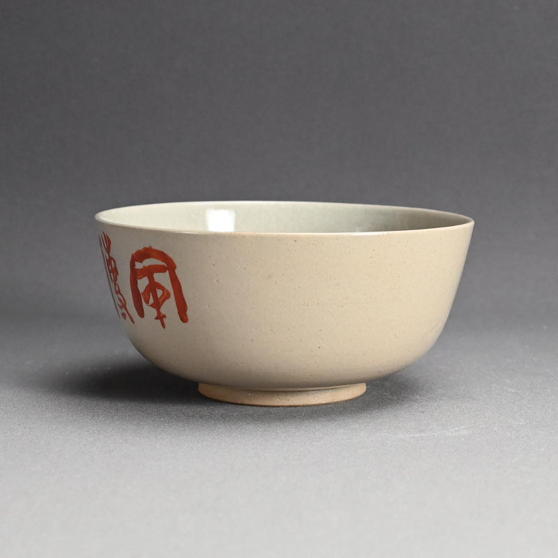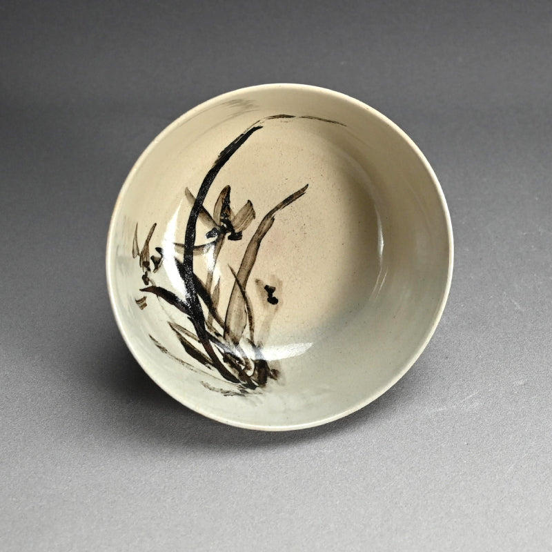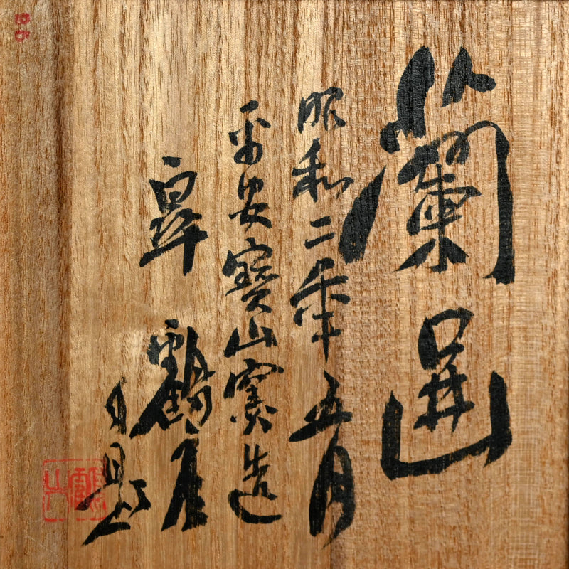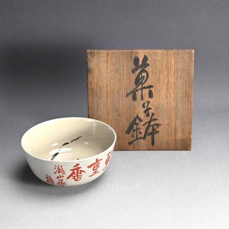 京都の雲林院 寶山による陶器です。黒地に蘭図が描かれ、縁には富岡鉄斎による古文の詩が赤で縁取りされています。「菓子鉢」と題された銘木箱に収められていて、直径18cm、高さ8.5cmで 状態は良好です。
