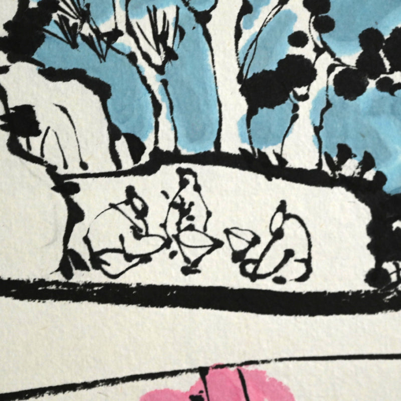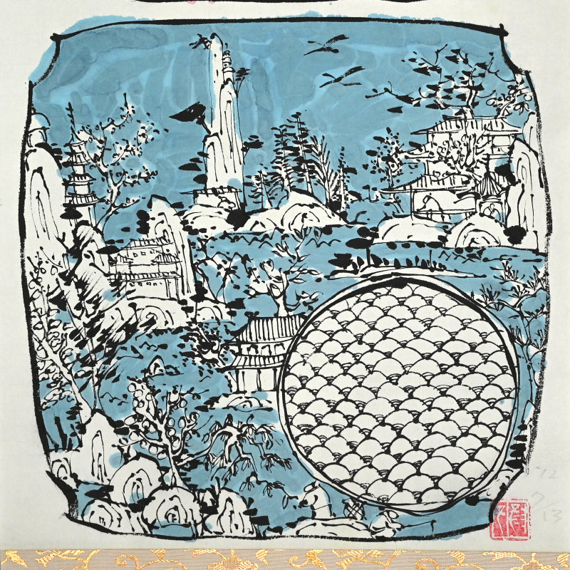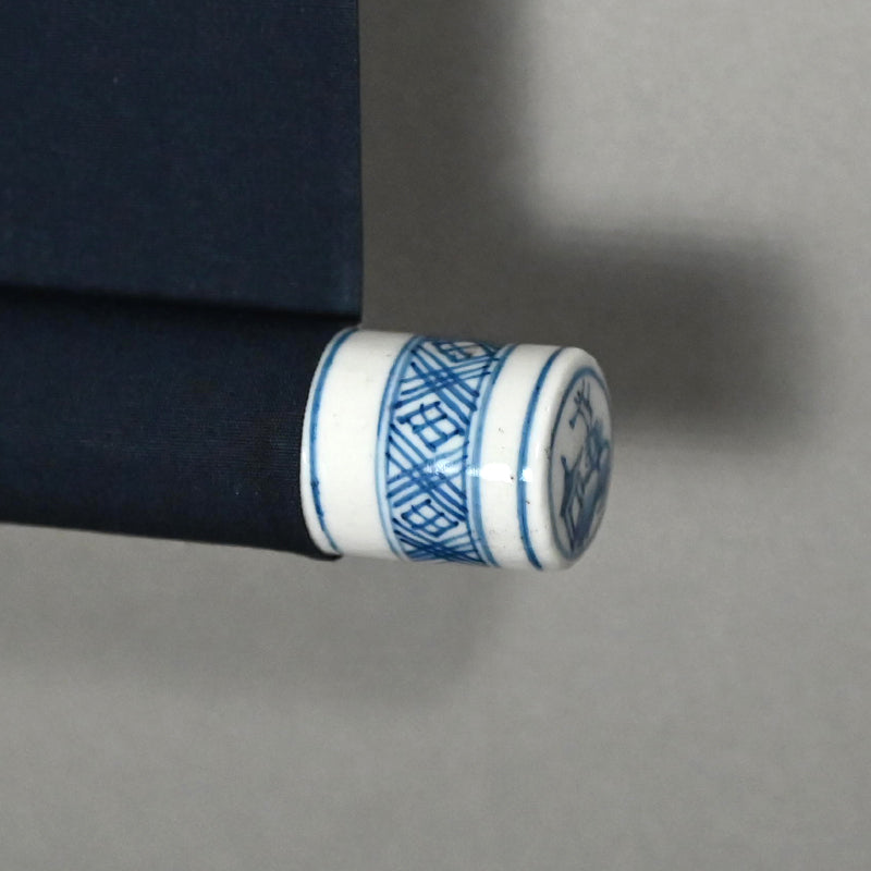 A study of ceramic plate designs by female ceramicist Shigemori Yoko mounted as a hanging scroll. Ink and color on paper mounted in dark cloth with ceramic rollers, it is 47 x 194.5 cm (18-3/4 x 76-3/4 inches) and in excellent condition.