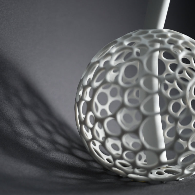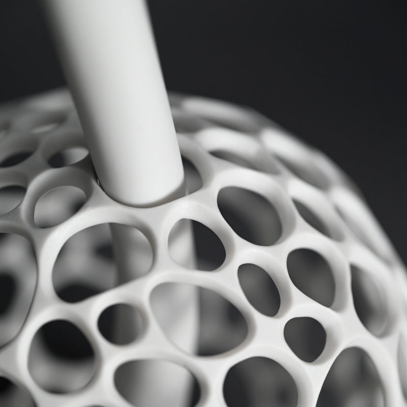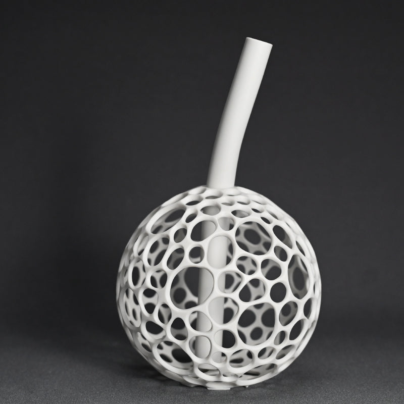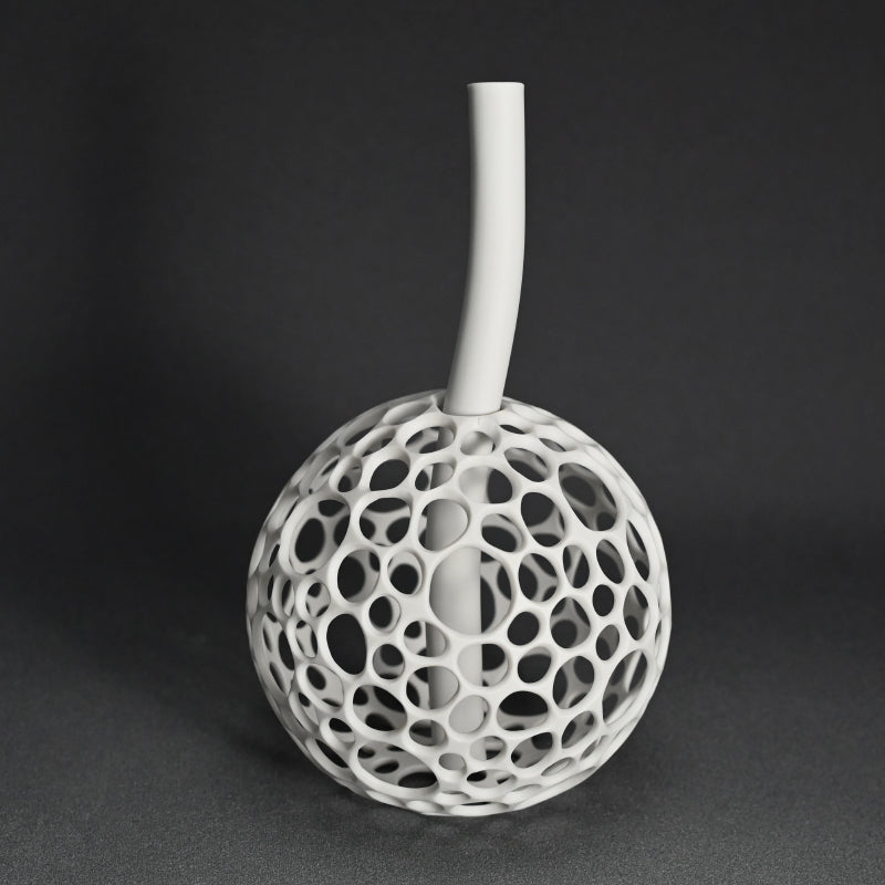 A sheer white porcelain sphere like some coral exoskeleton found dried on the beach pierced with a cylindrical vase for a single flower by Kato Yoshiyasu enclosed in the original signed wooden box titled Skeletal Work Vase. It is 13 cm (5-1/2 inches) diameter, 19.5 cm (8 inches) tall and in excellent condition, directly from the artist this year.
