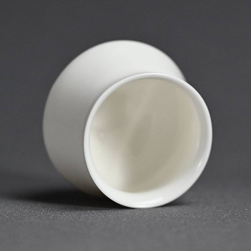 A refined set of six contemporary porcelain cups by Matsumura Jun, enclosed in the original signed wooden box titled cup rss. In this compact group, Matsumura explores the balance between pure vessel form and sculptural intervention. The softly rounded bodies rise from sharply articulated bases, where subtle faceting gathers into a tripod-like footing that anchors each cup with quiet stability. Above this structured base, the porcelain walls swell outward before drawing inward to a gently flared rim, creating a continuous curve that contrasts with the crisp geometry below. The luminous white surface emphasizes the clarity of the form, allowing light to move smoothly across the porcelain while shadows collect along the folded planes near the foot. Though modest in scale, the cups reveal the same structural logic found throughout Matsumura’s practice—forms that feel at once natural and precisely engineered. Each cup measures approximately 5.8 cm (2-1/4 inches) in diameter and 5 cm (2 inches) in height, and the set remains in excellent condition, acquired directly from the artist.