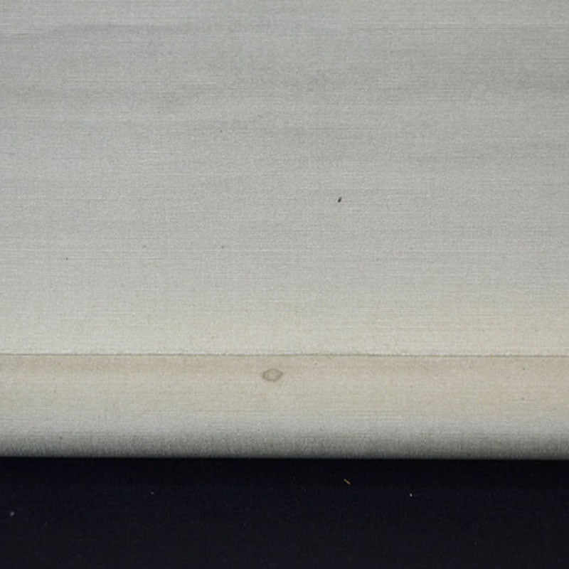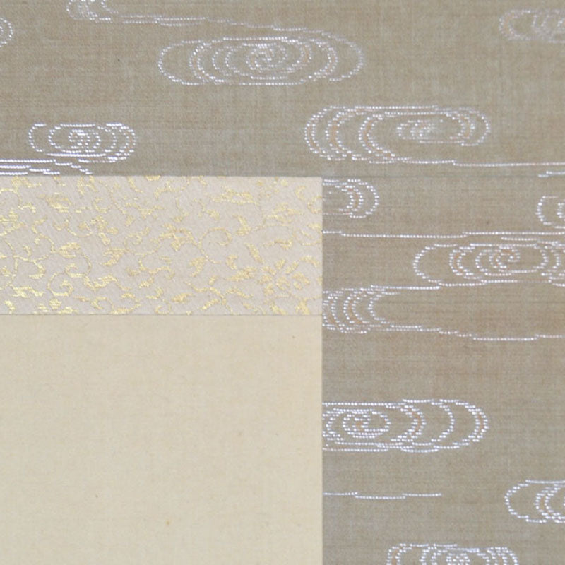 絹にインクで描かれ、銀色の渦巻き模様の美しい銀襞手縁が 淡い夏緑色で広がり、象牙色の無地の巻き糸で仕上げられています。