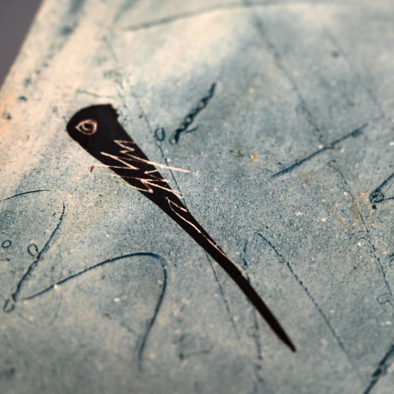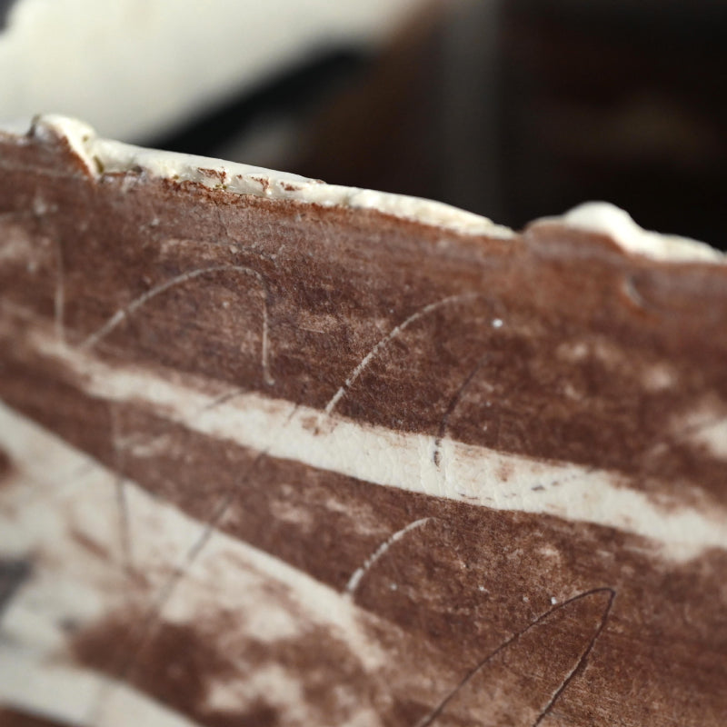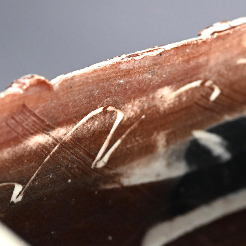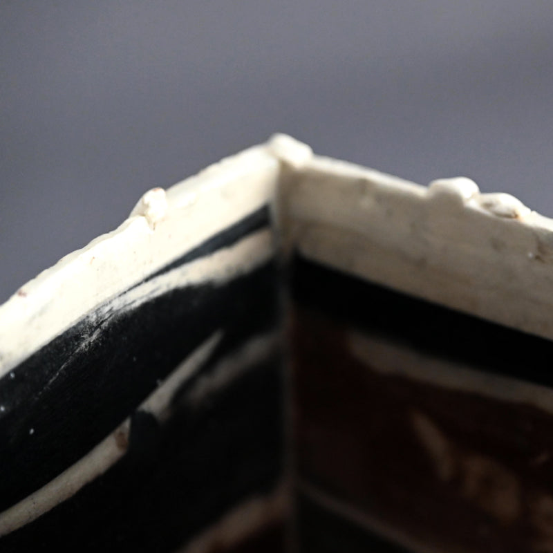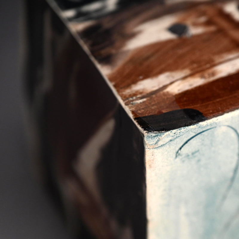 重森陽子作の立方体容器。側面は板状で縁が裂けており、茶と黒の力強い筆致で彩られています。「Chairo CUBE」と題された木箱に収められており、重森朔の署名と、内側に兄の直樹の裏書があります。片面には櫛目、もう片面には草のような傷跡が刻まれています。底面に署名があり、サイズは14 x 14 x 14 cm(全辺約5.5 x 5.5 x 5.5インチ)で、状態は良好です。彼女の遺品から直接譲り受けました。
