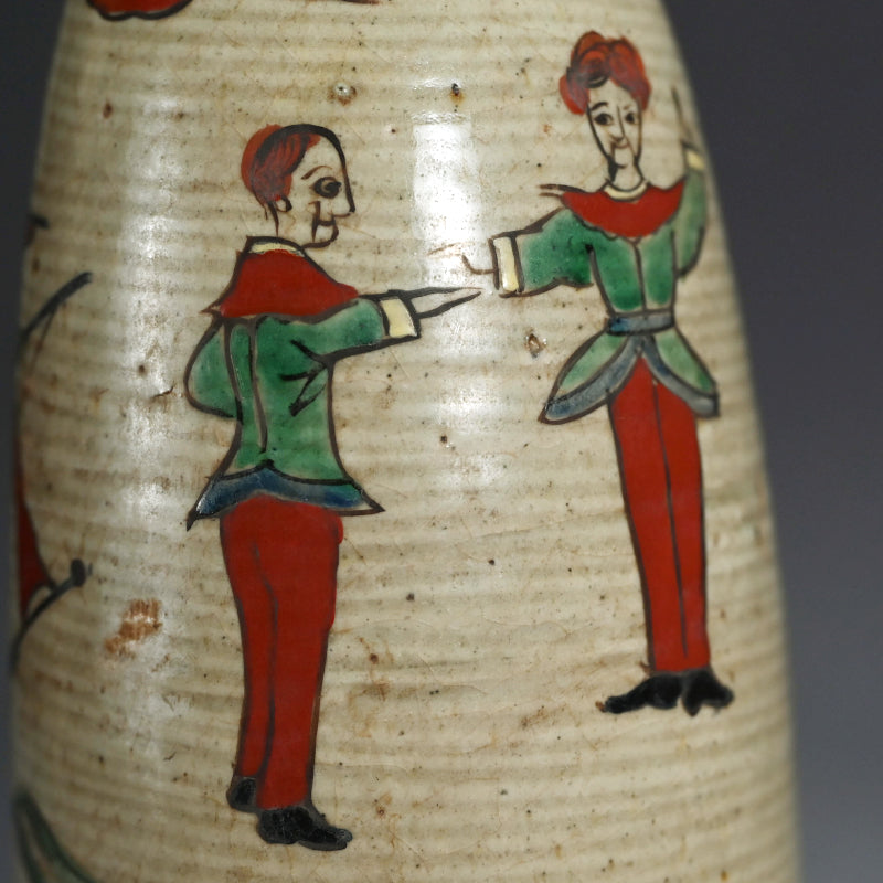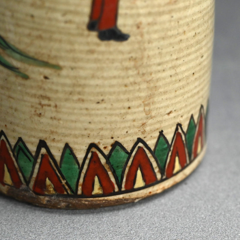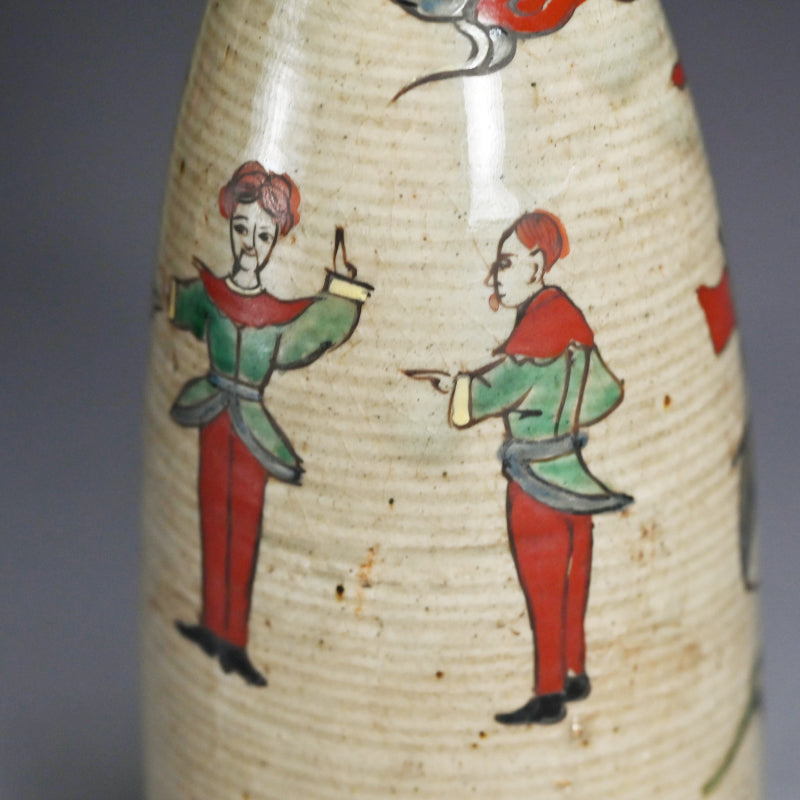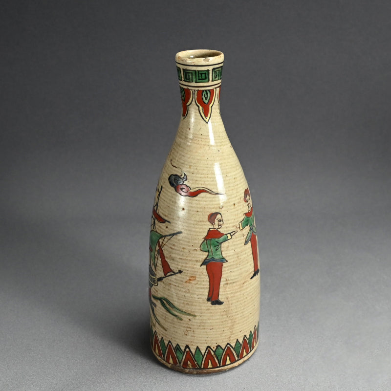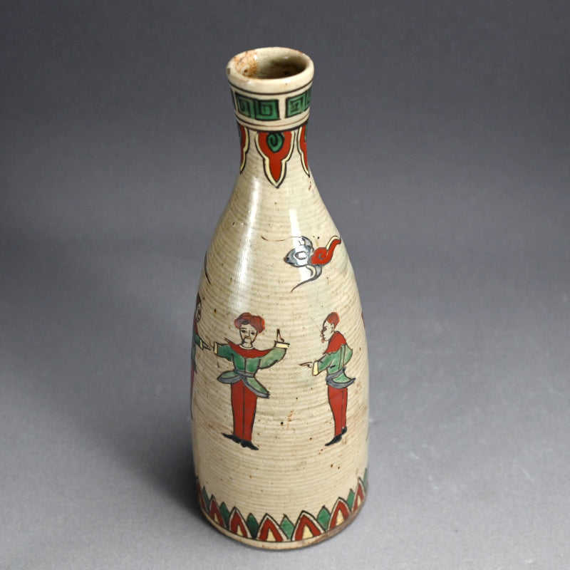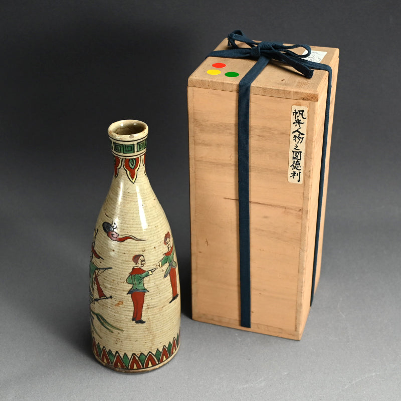 強風に翻るオレンジ色の旗が このオランダ船を遥かな岸へと駆り立てます。貿易と富の約束を象徴する赤毛のオランダ人3人が、このアンティークな背の高い徳利に描かれています。「帆舟人物之図 徳利」と題された古い木箱に収められています。18世紀から19世紀にかけて作られたこの徳利は、瀬戸焼の産地である内陸部の犬山焼を彷彿とさせます。徳利の直径は10.5cm、高さは29cmで 縁の釉薬に小さな欠けが1箇所ある以外は良好な状態です。
