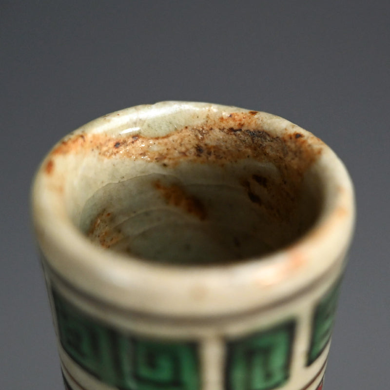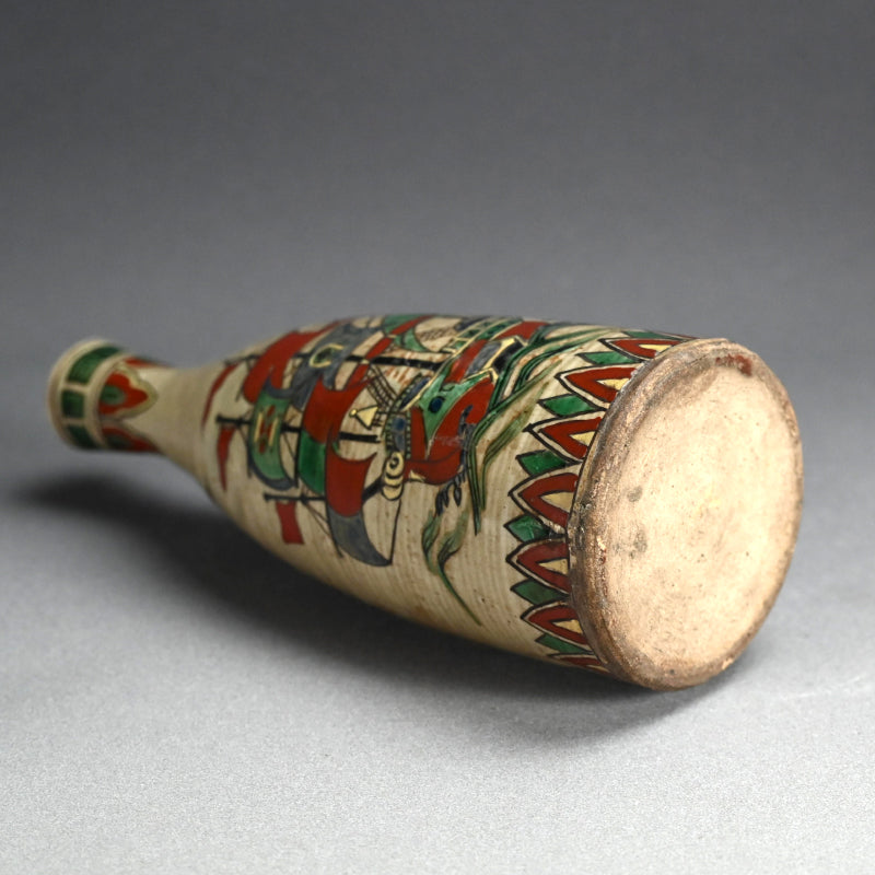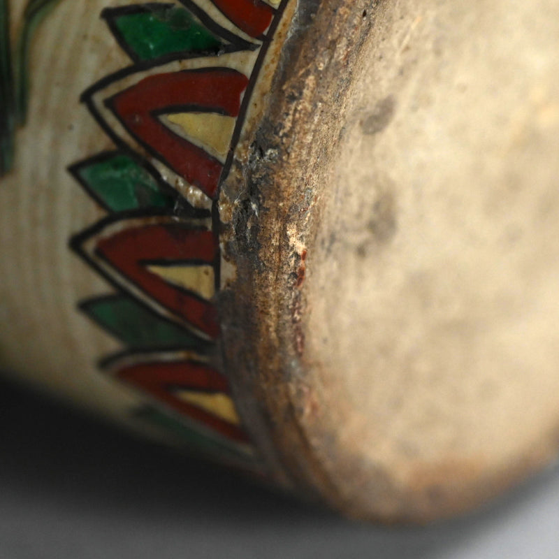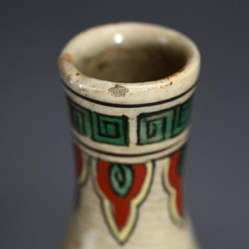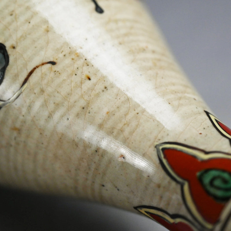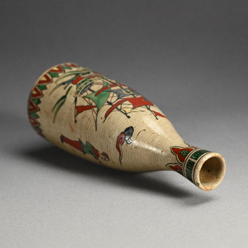 強風に翻るオレンジ色の旗が このオランダ船を遥かな岸へと駆り立てます。貿易と富の約束を象徴する赤毛のオランダ人3人が、このアンティークな背の高い徳利に描かれています。「帆舟人物之図 徳利」と題された古い木箱に収められています。18世紀から19世紀にかけて作られたこの徳利は、瀬戸焼の産地である内陸部の犬山焼を彷彿とさせます。徳利の直径は10.5cm、高さは29cmで 縁の釉薬に小さな欠けが1箇所ある以外は良好な状態です。