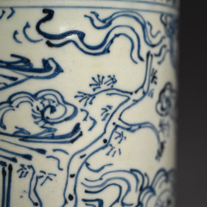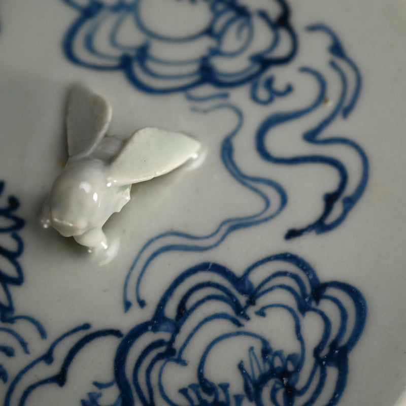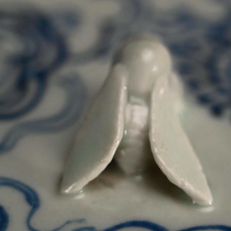 江戸時代の京都の陶工:喜祐による抹茶の湯で用いる磁器の水指です。大綱宗彦禅師による雲間の松陰の山門が描かれています。取っ手を兼ねた蓋の上には大きなマルハナバチが描かれ、内側には嘉永4年(1851年)初春の日付と80歳の大綱の署名、そして「喜祐造」と記されています。木箱には「小染付写 雲堂水指」と題され、外側に「焼物師 喜祐」と署名、内側には80歳の大綱の署名と印が押されています。直径は17cm、高さは15.5cmで 状態は良好です。