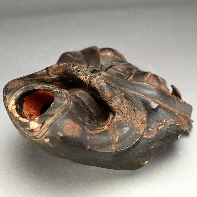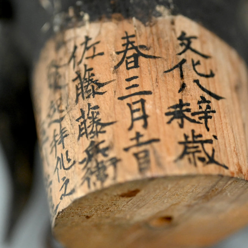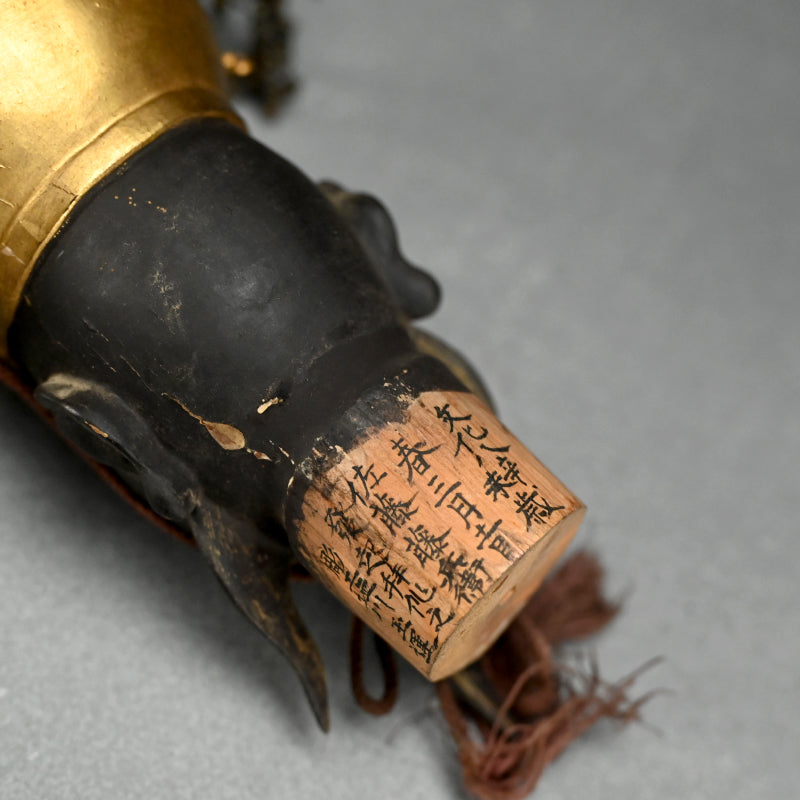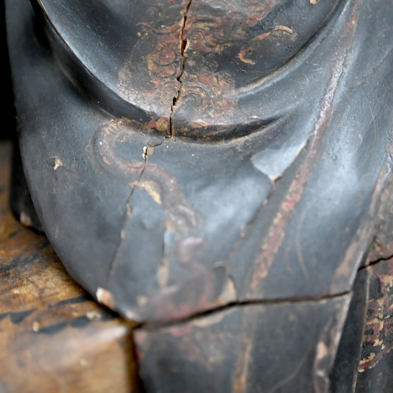虎皮をまとった華やかな椅子に座る仏聖人の美しい像です。江戸時代中期から後期(18~19世紀)に作られたものです。椅子を含めた彫刻のサイズは32 x 18.5 x 37cmです。 木材が接合されているホイズニーと右腕には経年によるひび割れがあり、経年特有の多色の色も多少失われています。