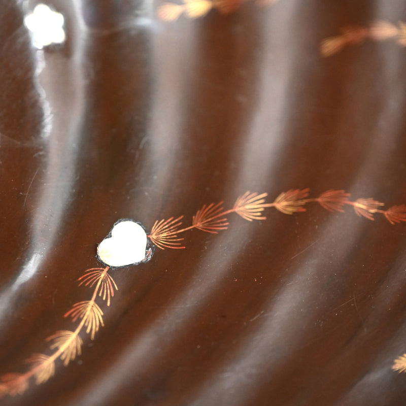 経年変化で黒ずんだ桐材をくり抜いて作った大きな鉢です。表面には黒漆を塗り、縁には螺鈿文様と波模様の輝く金蒔絵を施した水仙文様を象嵌しています。大きさは35 x 25.5 x 10 cmで、全体的に良好な状態であり、経年劣化で少々黒ずんだ桐箱に収められています。