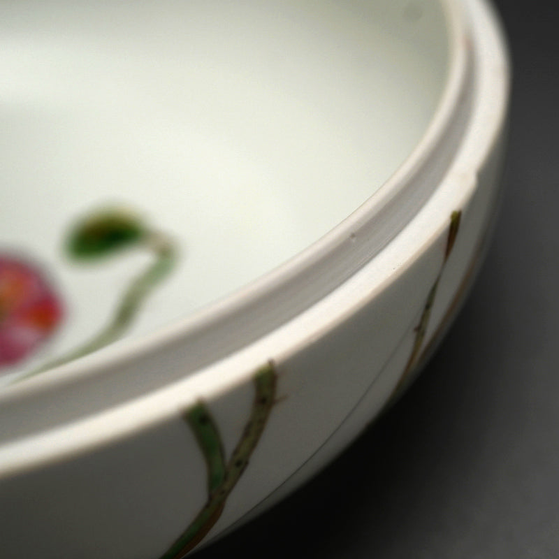 2002年の第42回日本伝統工芸新作展に出品された、女性作家・丹沢裕子氏による美しい白磁に芥子の花をあしらった箱。「芥子紋壺」と題された、オリジナルの銘木箱に収められています。直径23cm、高さ13.5cmで、状態は良好です。丹沢氏は作品について、「私の表現スタイルは、白地に様々な花をモチーフにしています。伝統的な上絵付け技法を用いながらも、現代的な印象を目指しています」と述べています。