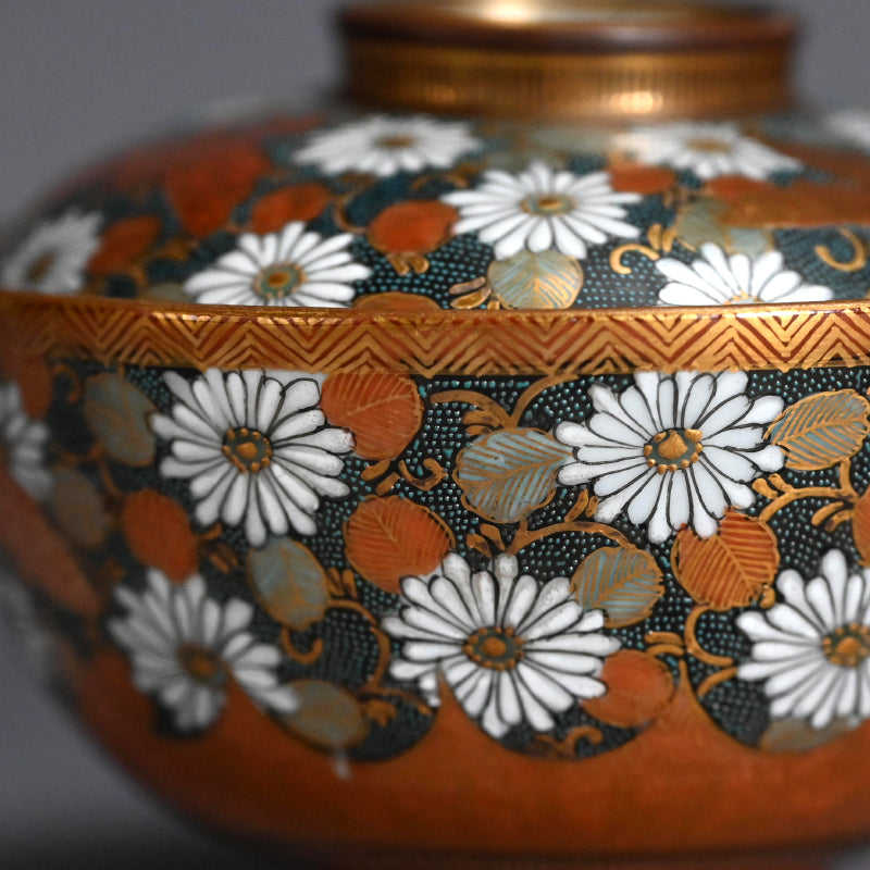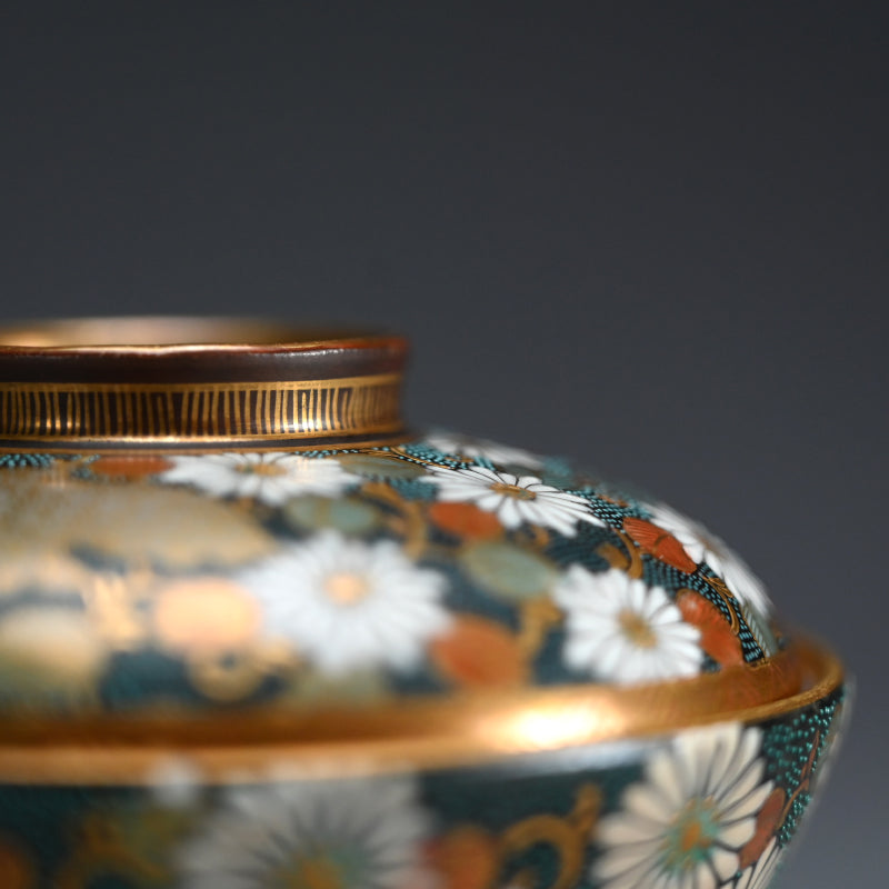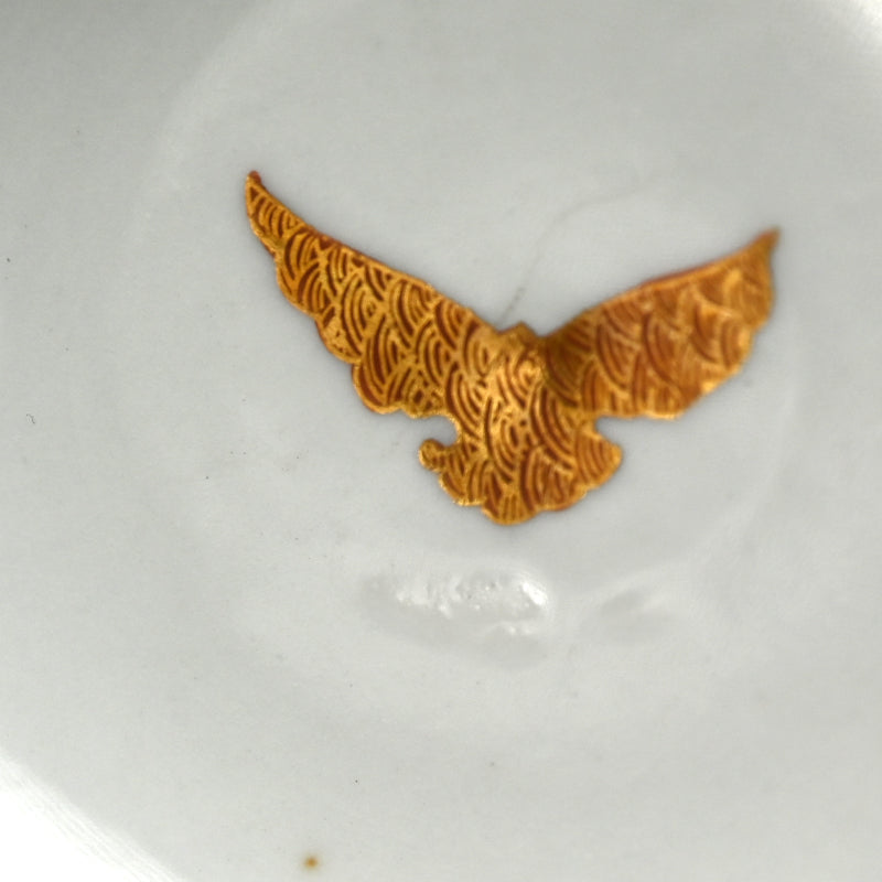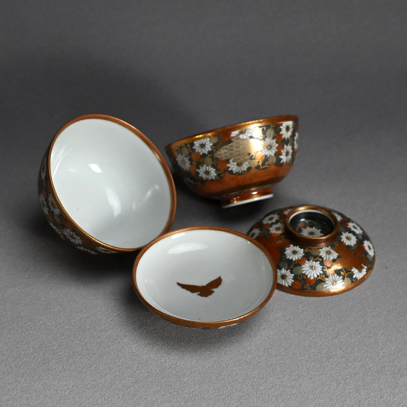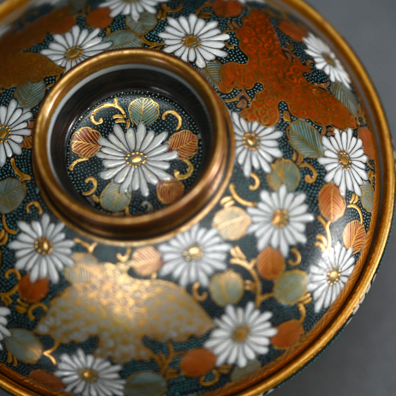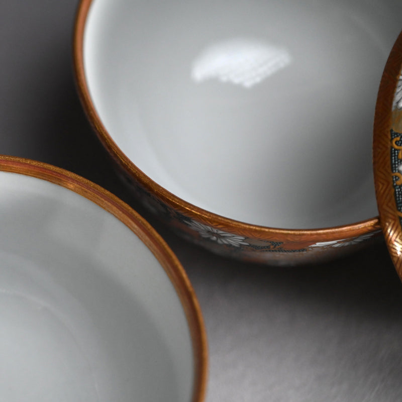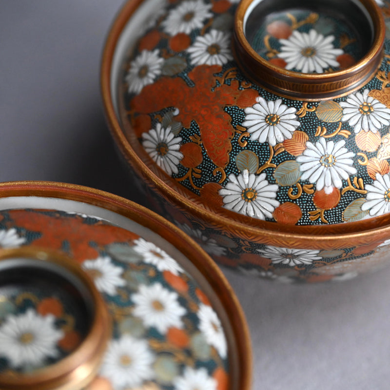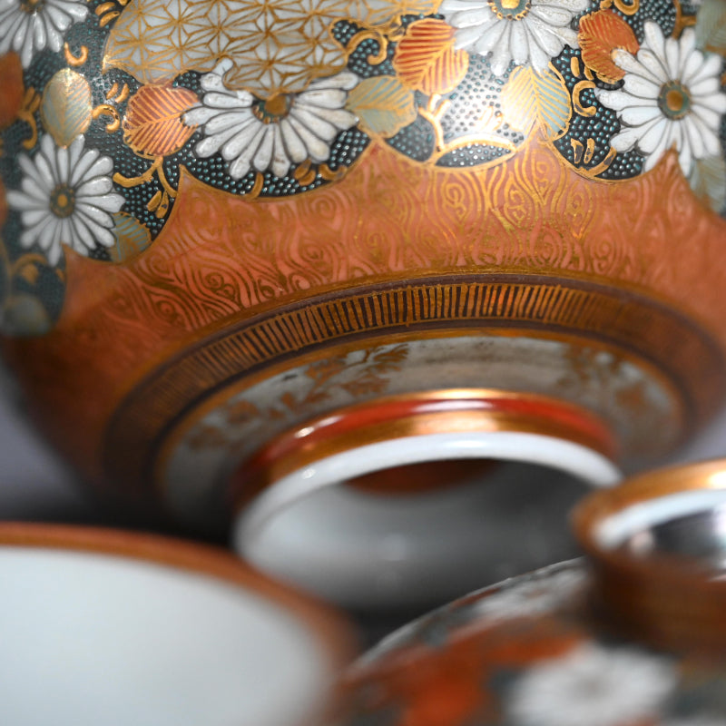 九谷焼は、1655年に地元の領主前田利治が後藤才次郎を九州有田地方へ陶磁器の製作を学ばせるために派遣したことに始まります。帰国後、才次郎は九谷村(現在の石川県)に窯を築きました。初期の作品は「古九谷」と呼ばれ、大胆な意匠、鮮やかな色彩、そして色絵の具で際立っていました。この時代は、財政難や地元資源の枯渇により、1730年頃に謎の終焉を迎えました。約1世紀の休止期間を経て、九谷焼の生産は19世紀初頭に復活しました。新たな窯が築かれ、中国や有田の磁器様式の影響を受けて技法が進化しました。この時代には、多様なサブスタイルが生まれました。