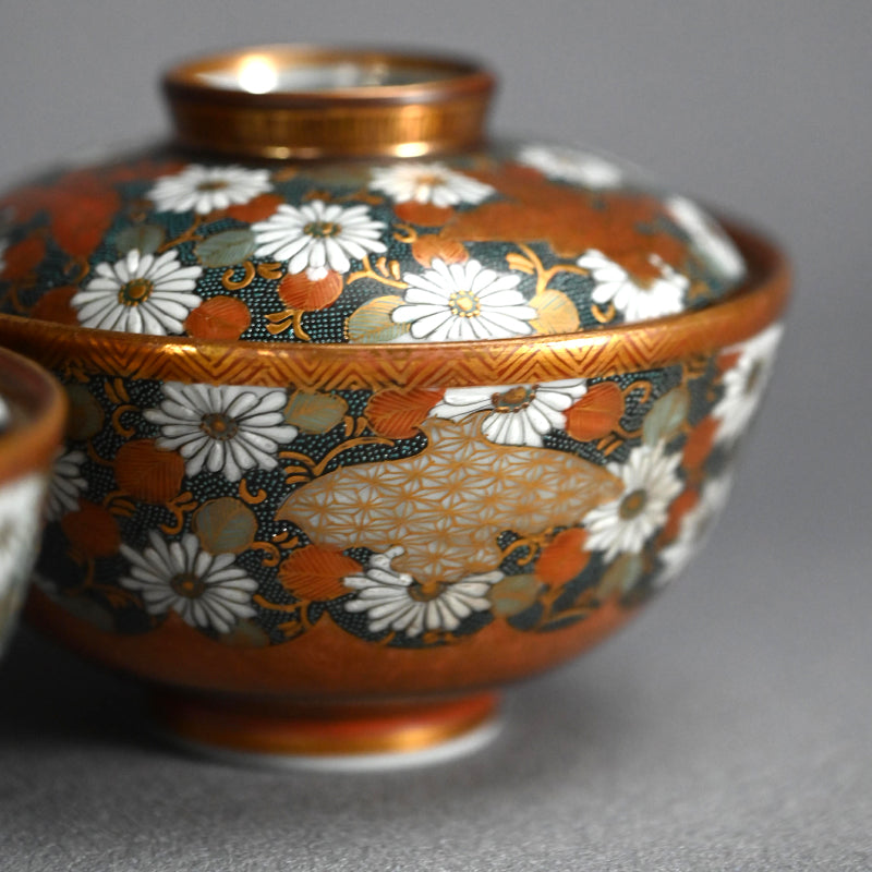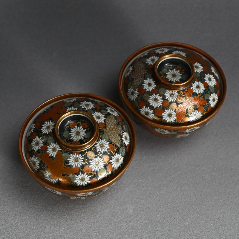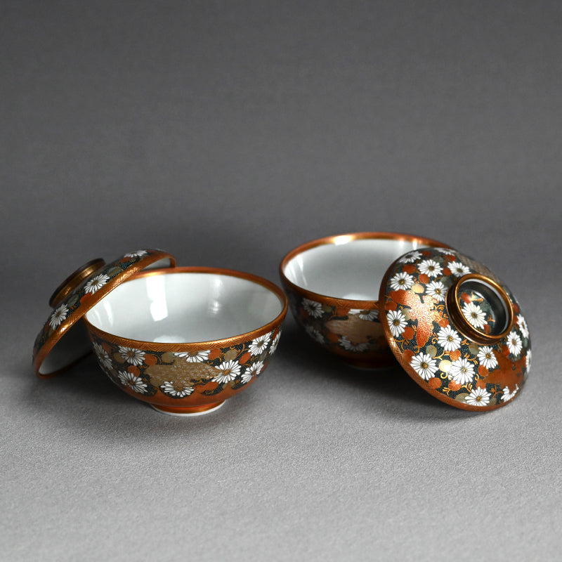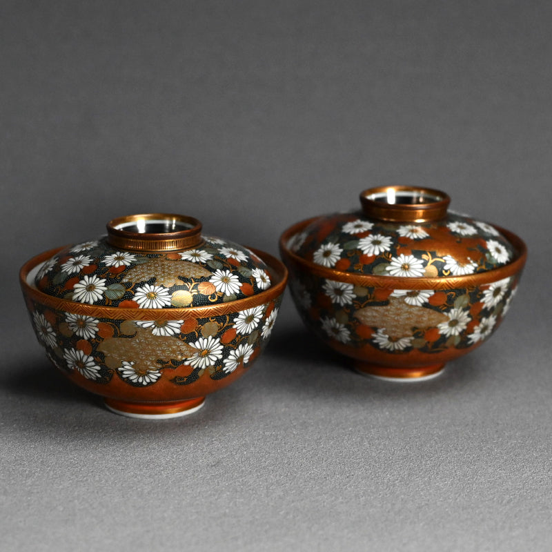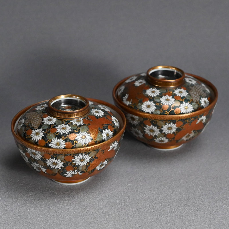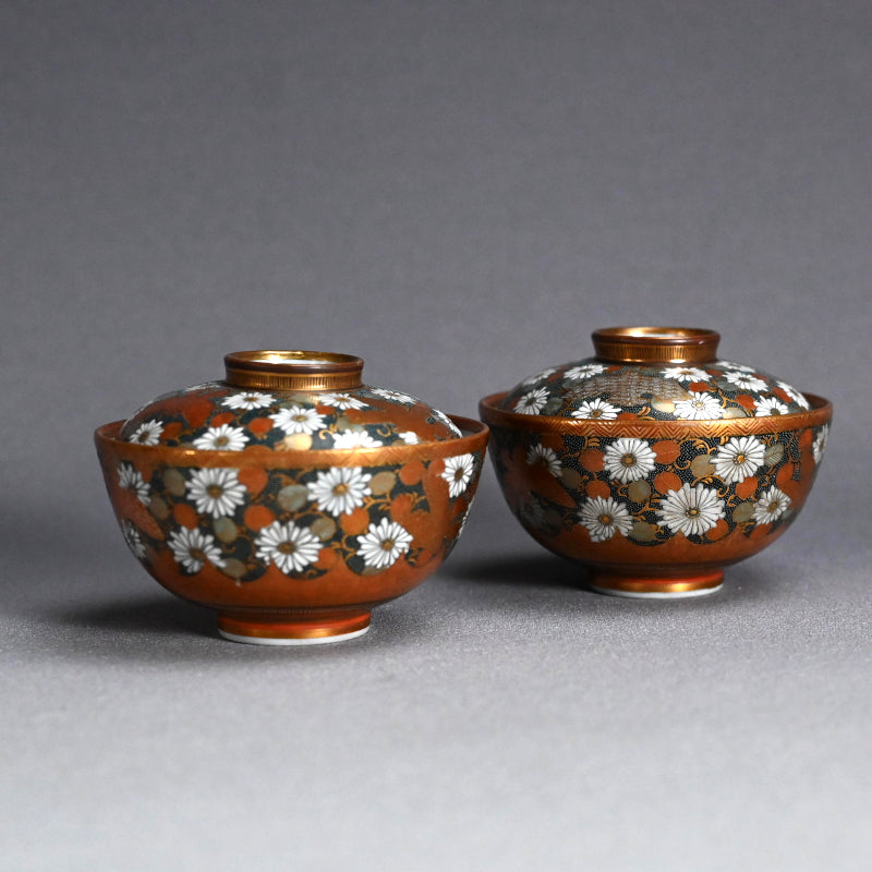 石川県九谷焼の蓋付き磁器鉢2客揃。赤地に金襴手と浮き彫りの菊の盛上げ文様が施され、精緻な装飾が施されています。高台の内側に「九谷」の銘があります。直径10インチ(約4cm)、高さ7.5cm(約3cm)で、いずれも良好な状態です。